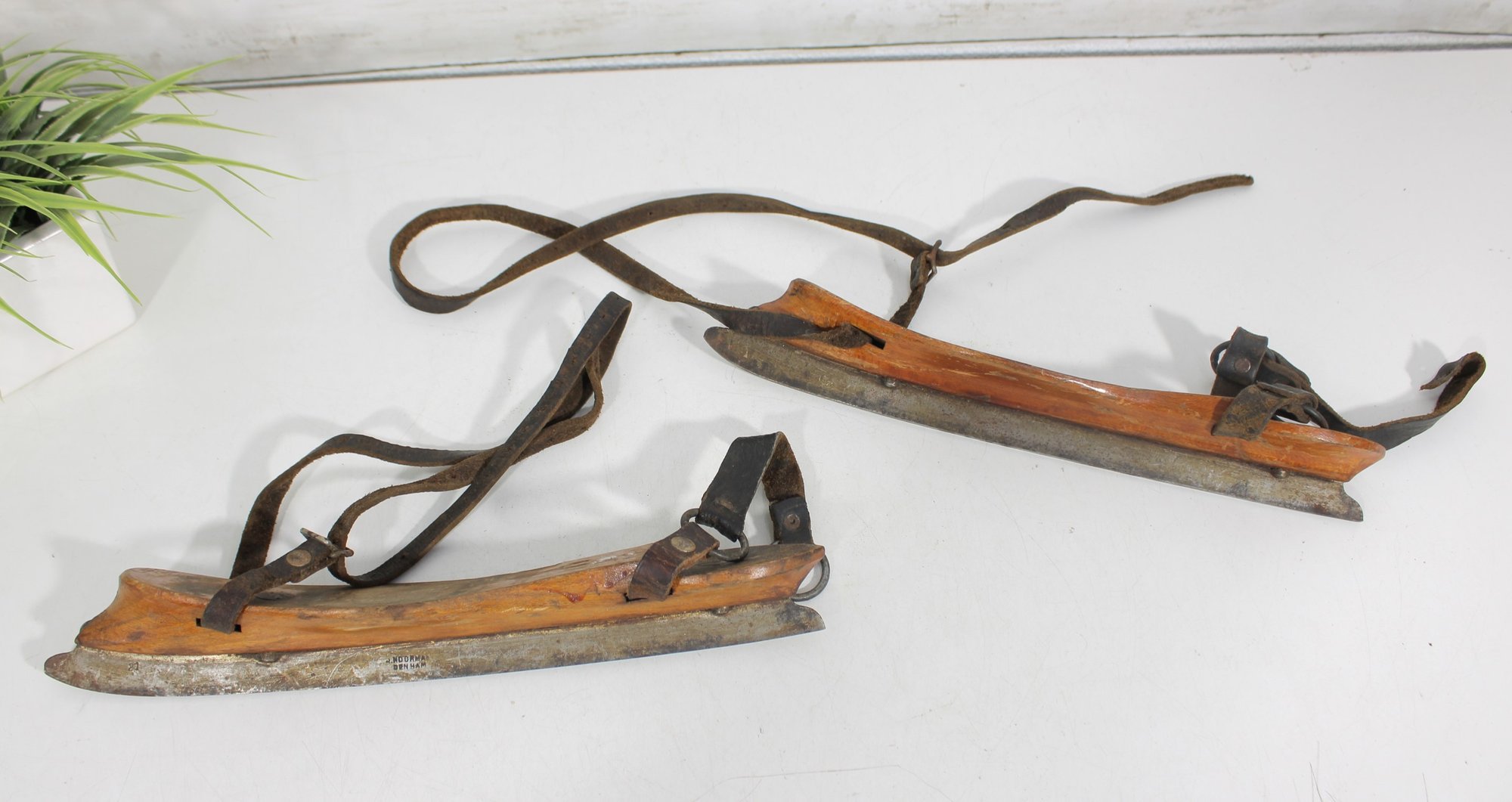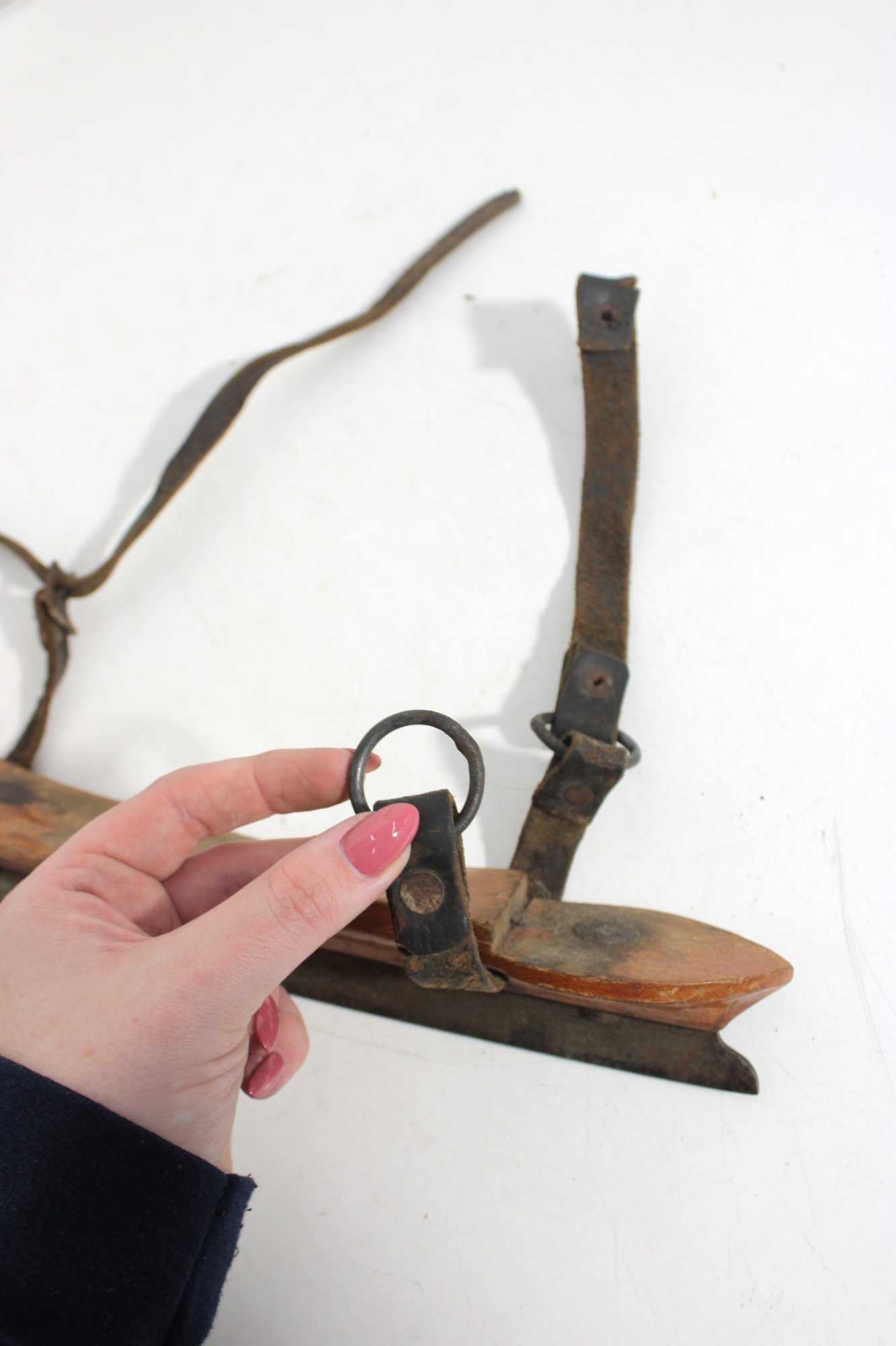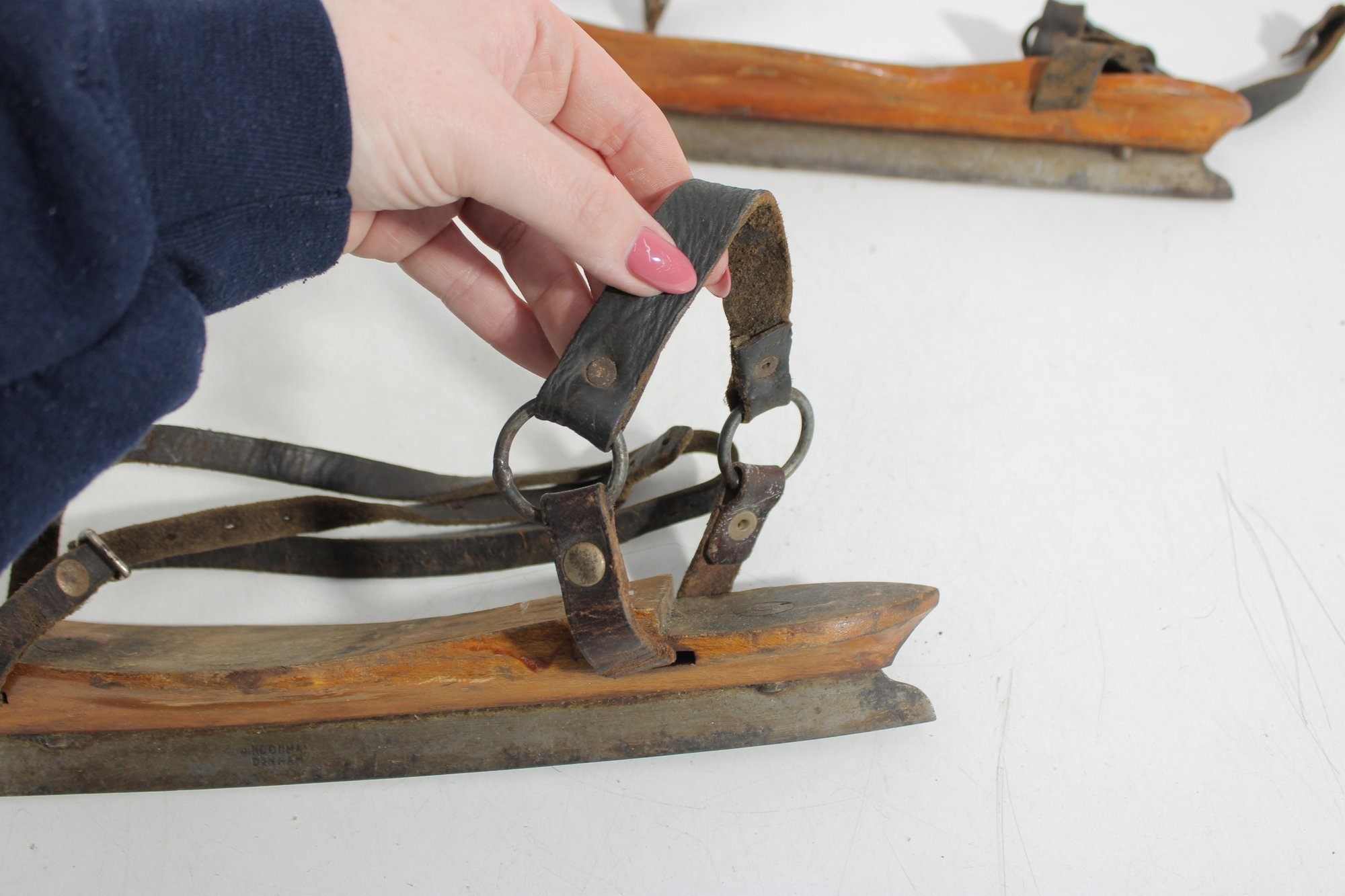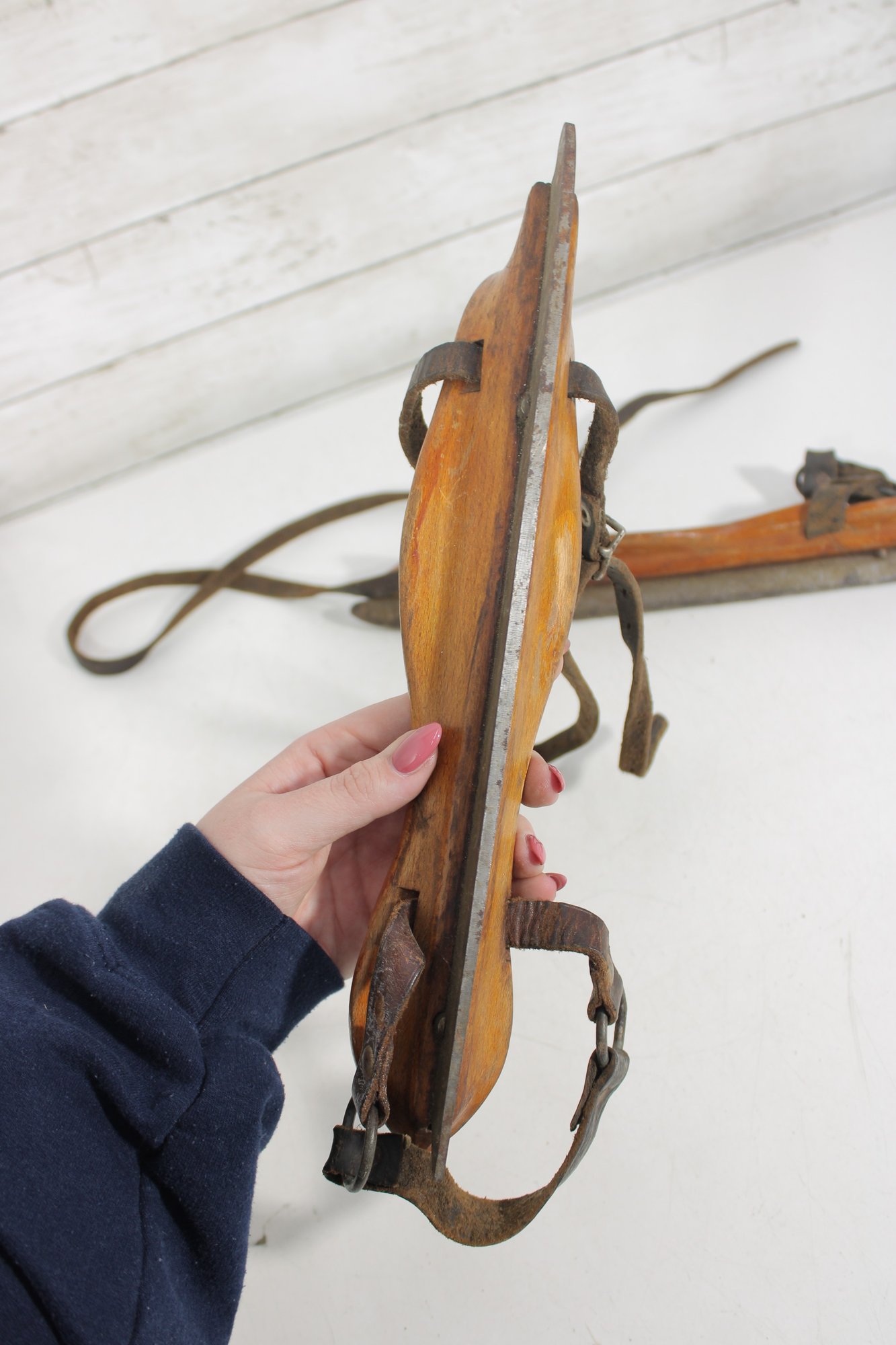 Traditional Dutch skates like these were designed to strap onto everyday footwear and are now highly sought after as winter sports collectibles or rustic decorative pieces. The warm aged wood and metal blades give them great primitive and farmhouse display appeal.