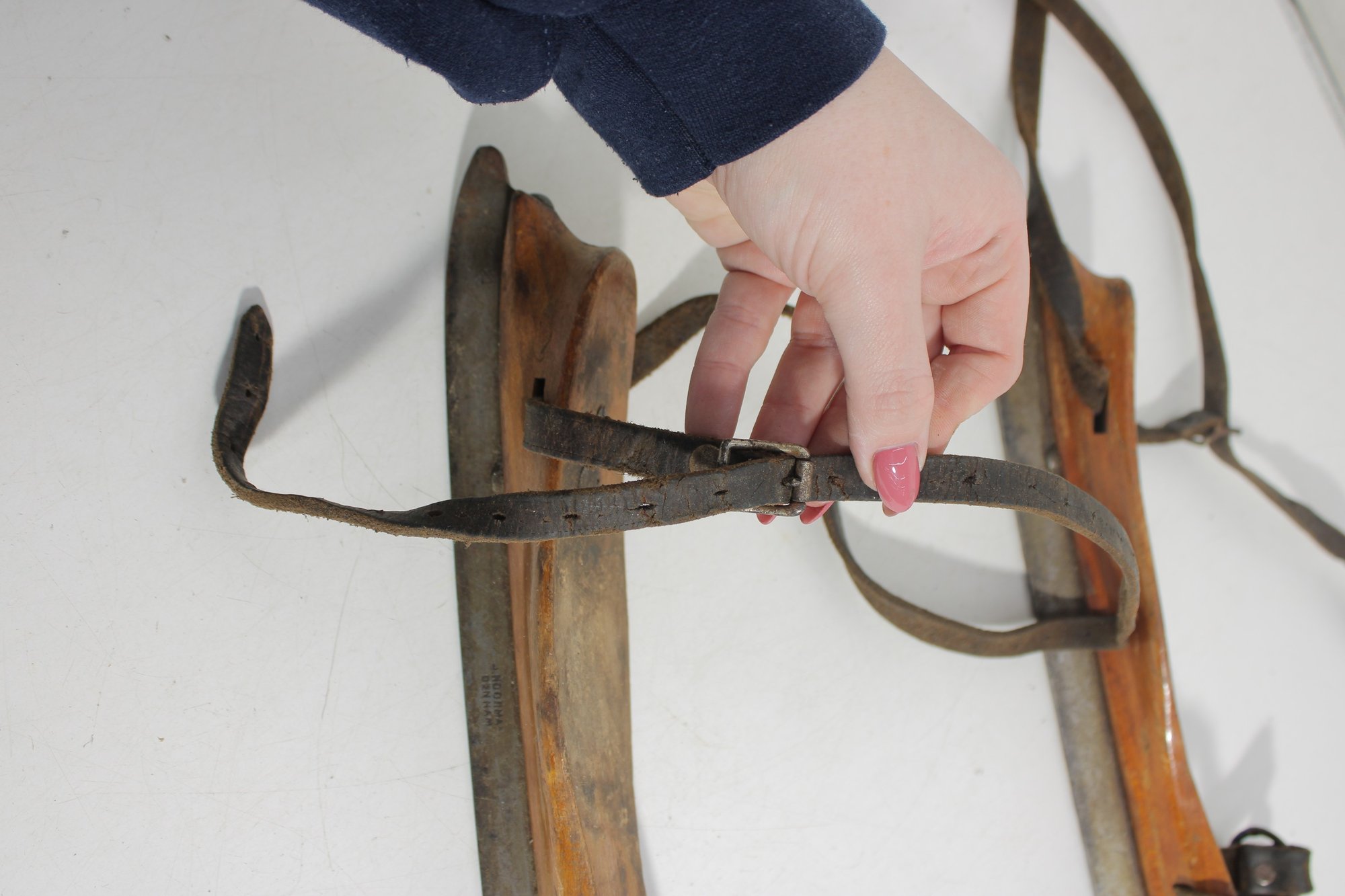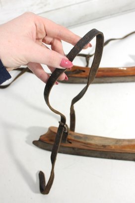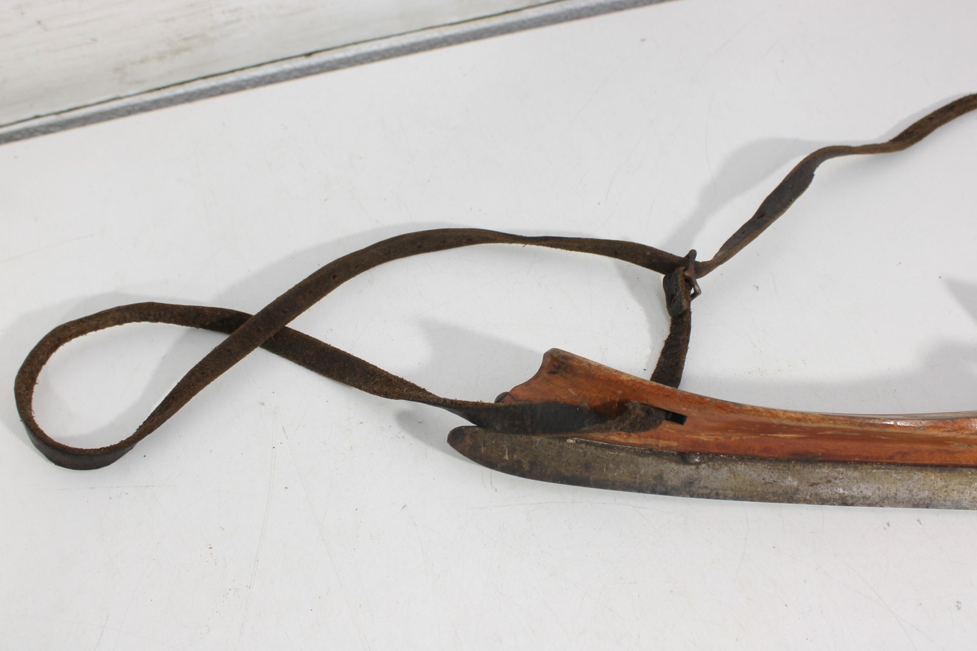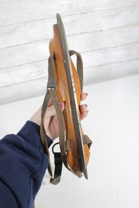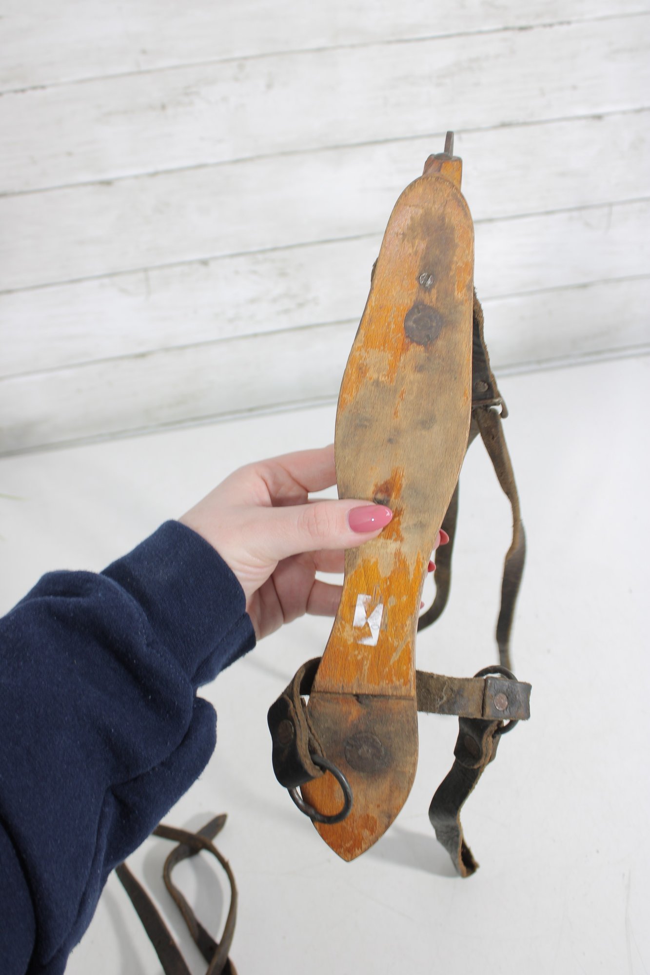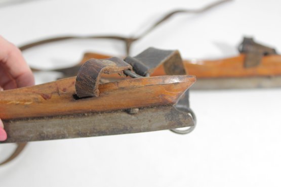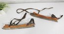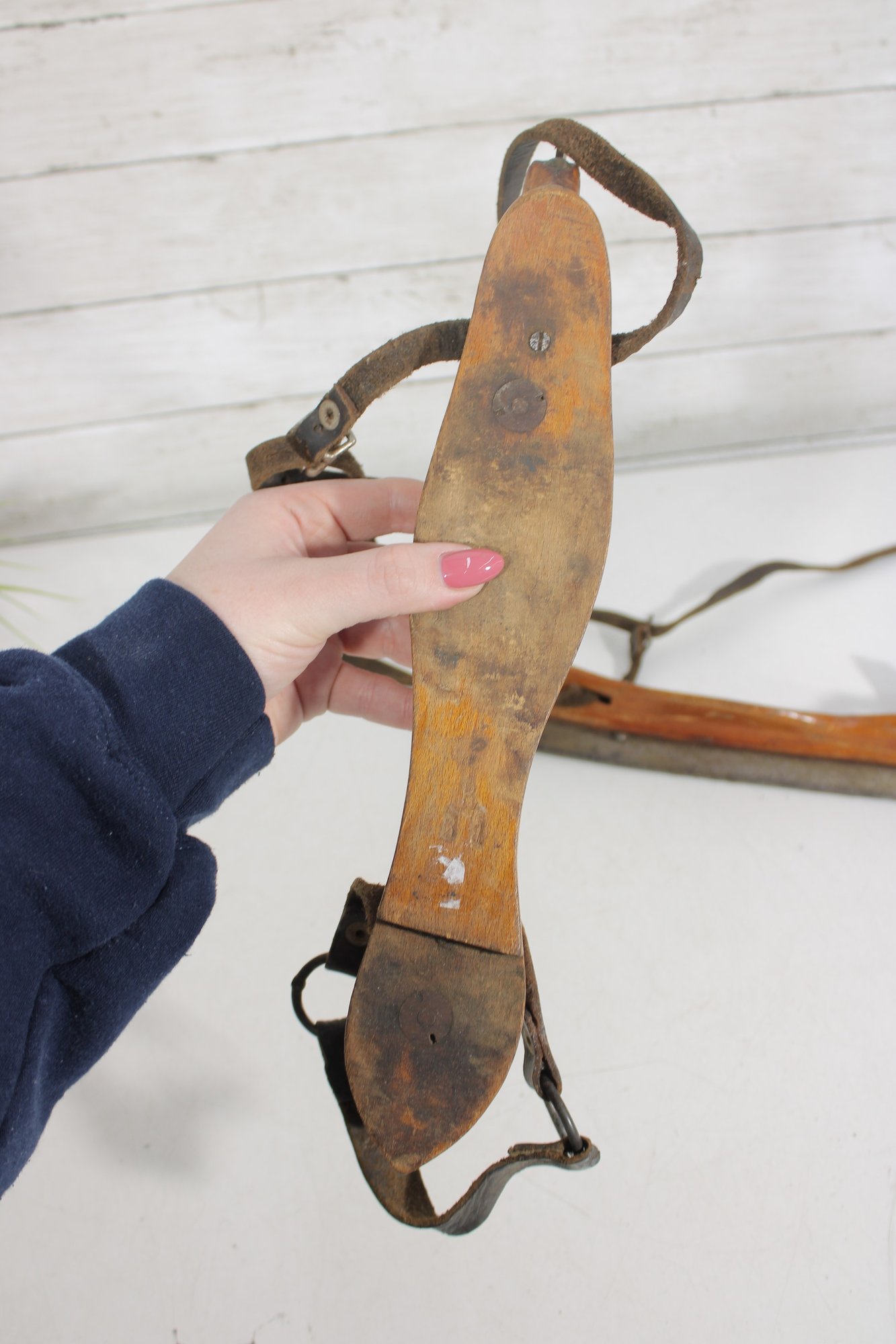 Traditional Dutch skates like these were designed to strap onto everyday footwear and are now highly sought after as winter sports collectibles or rustic decorative pieces. The warm aged wood and metal blades give them great primitive and farmhouse display appeal.