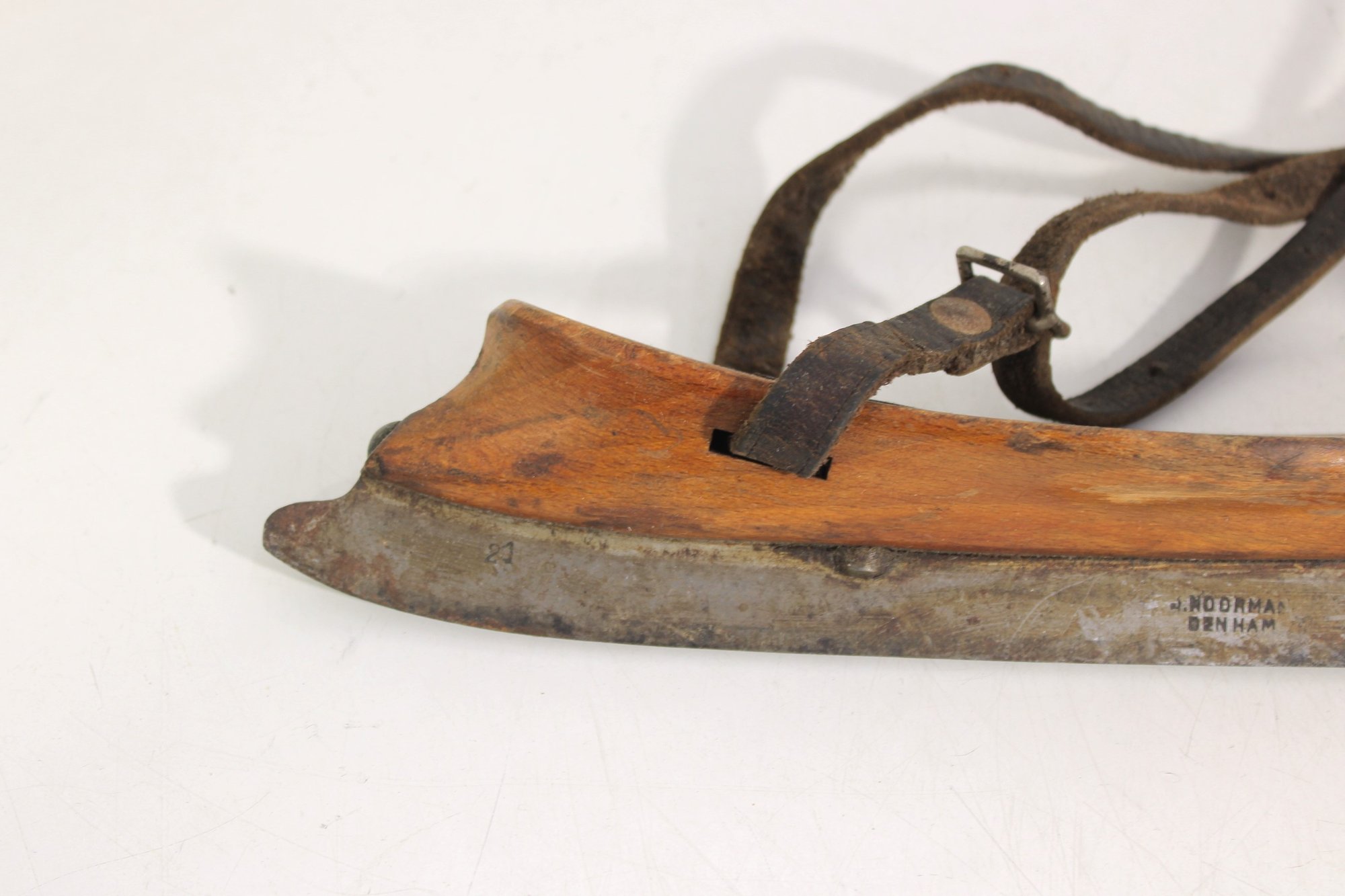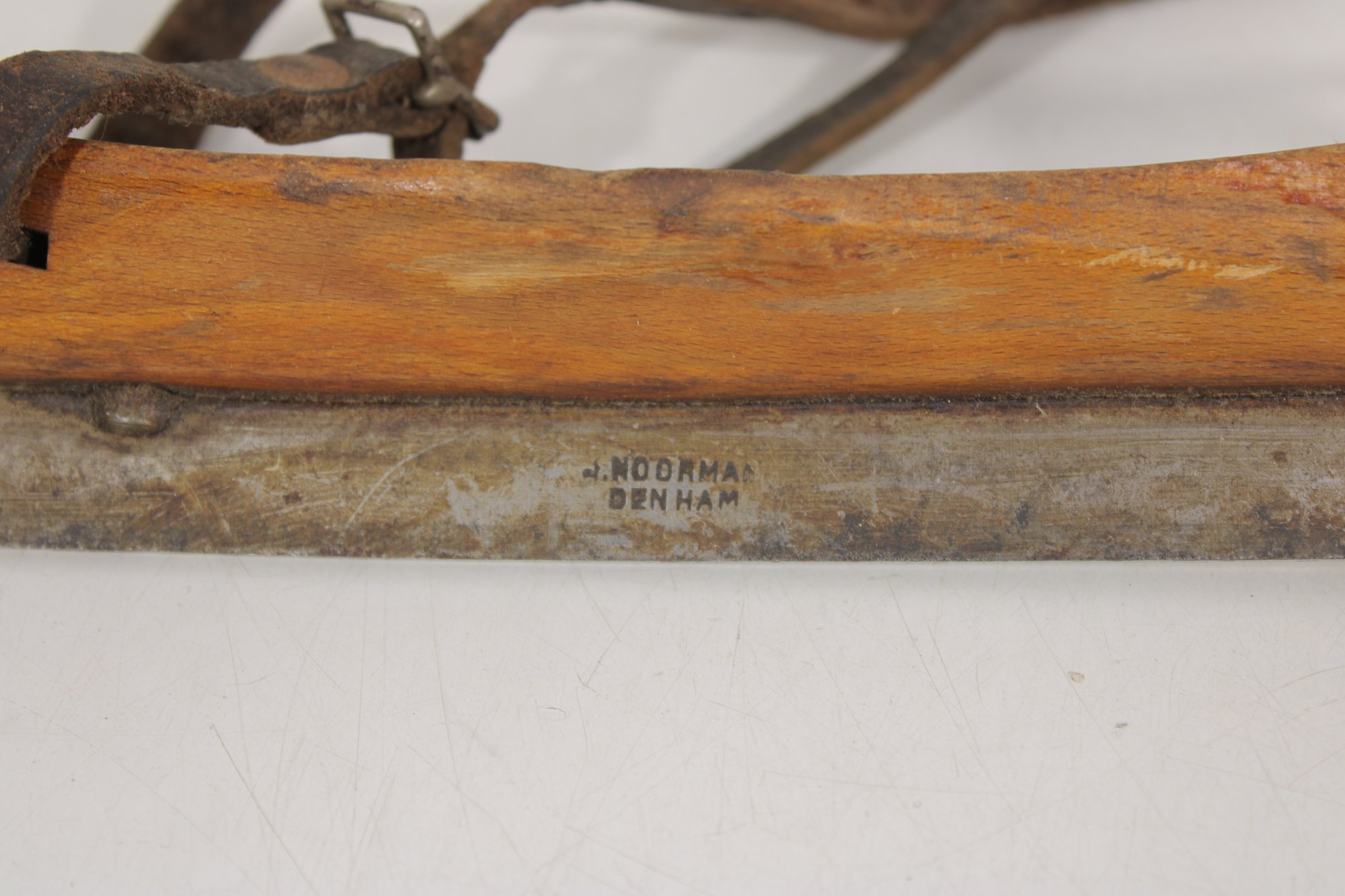 pair of vintage wooden ice skates marked “L. NORMA – DEN HAM”, likely made in the Netherlands. These classic skates feature wooden foot platforms with long metal blades and original leather straps and buckles used to secure them to boots.