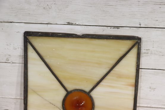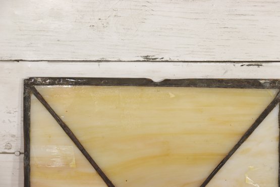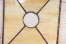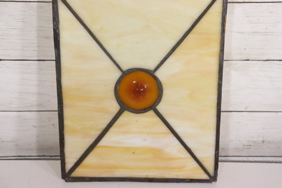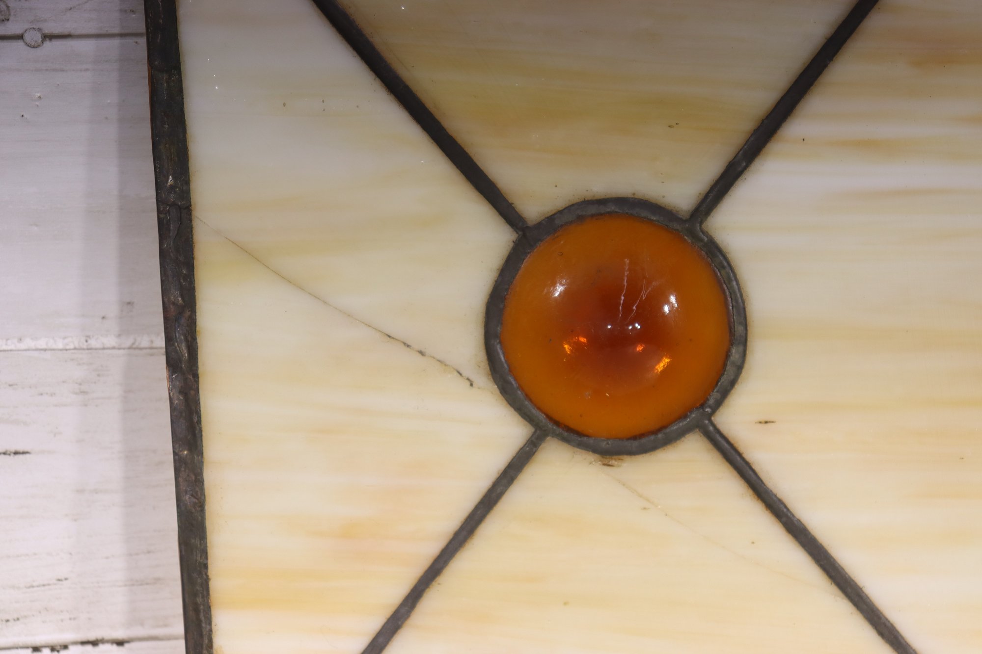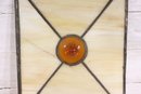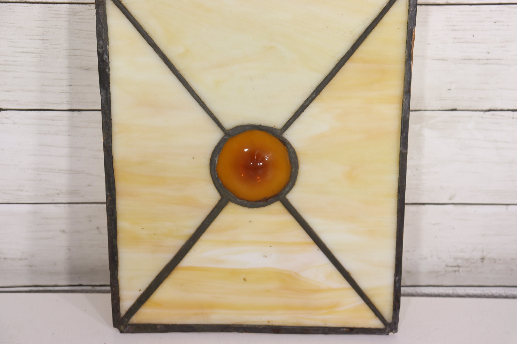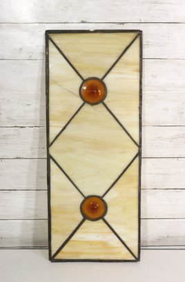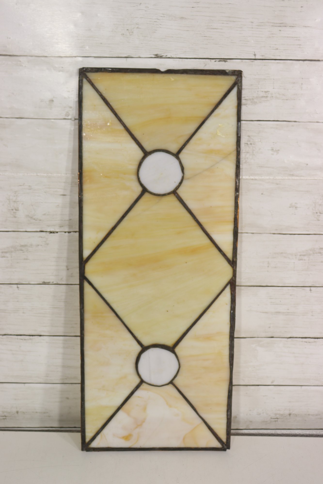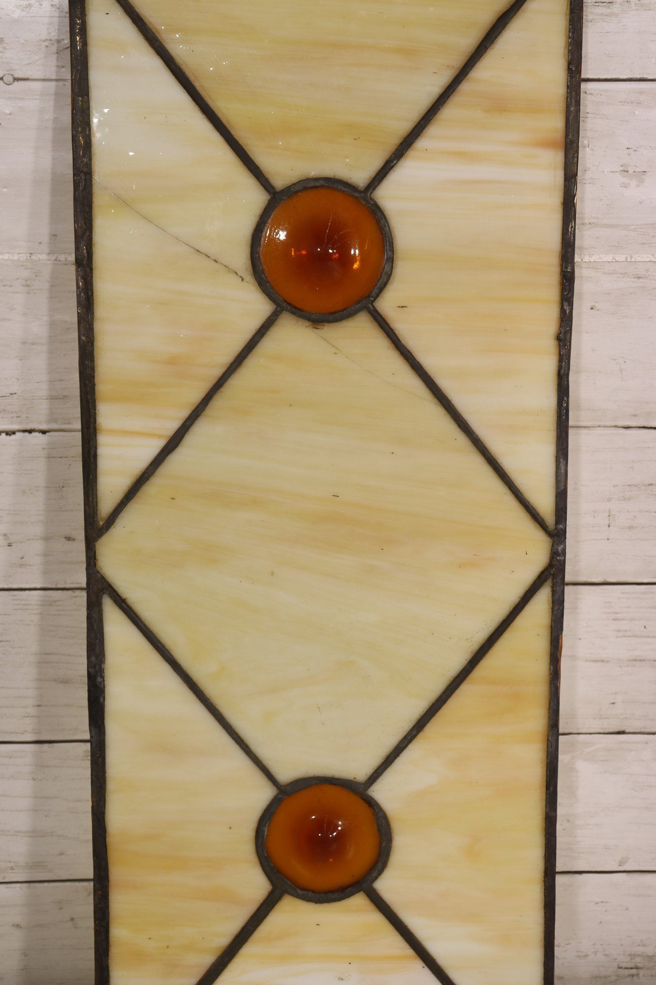 vintage leaded stained glass panel featuring a tall, narrow geometric design accented with two amber glass medallions. The soft cream and pale yellow glass is intersected by dark lead lines, creating a classic Arts & Crafts–inspired look.