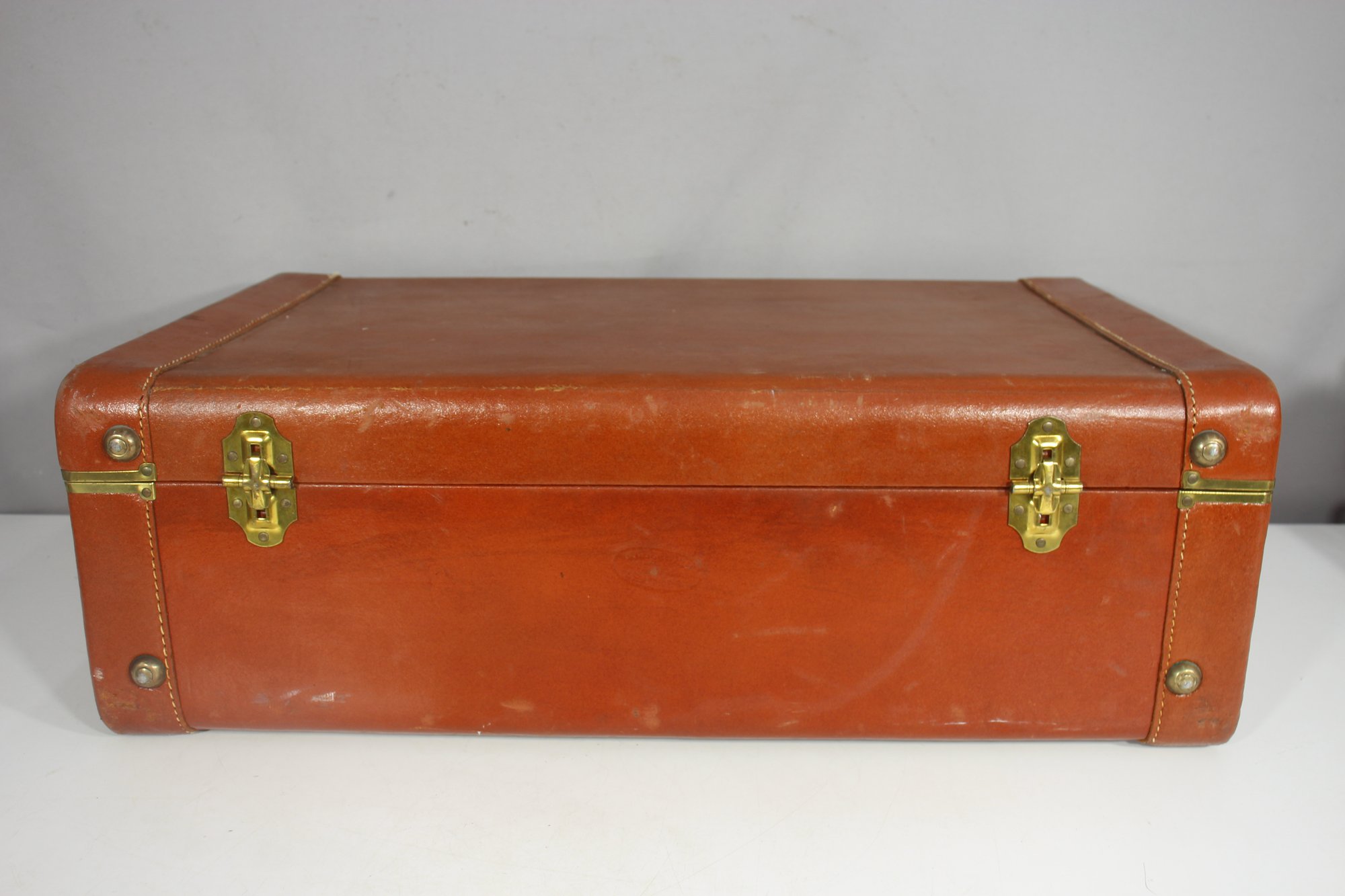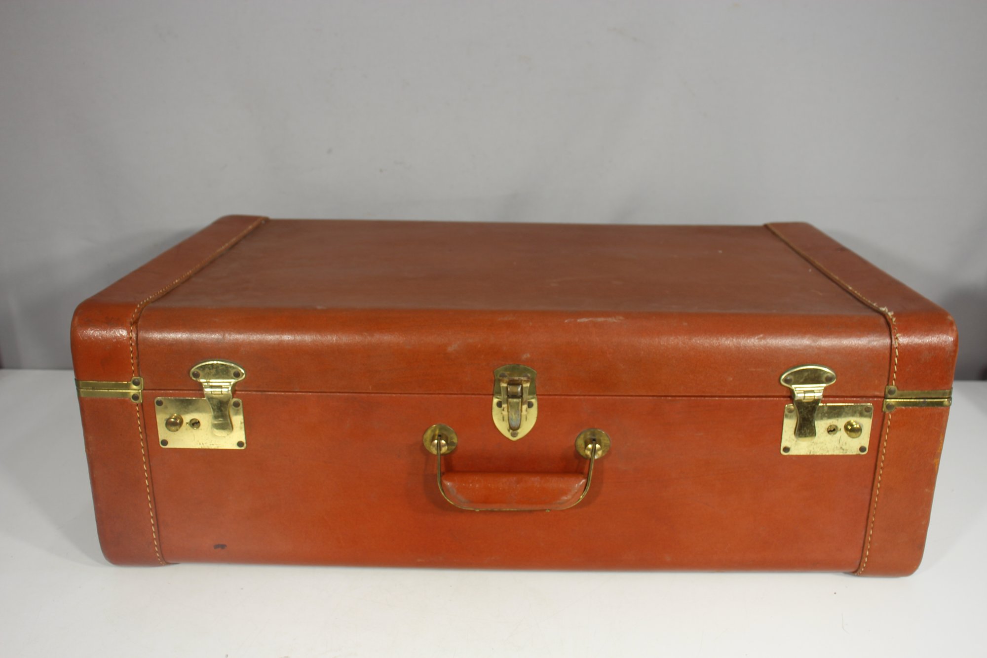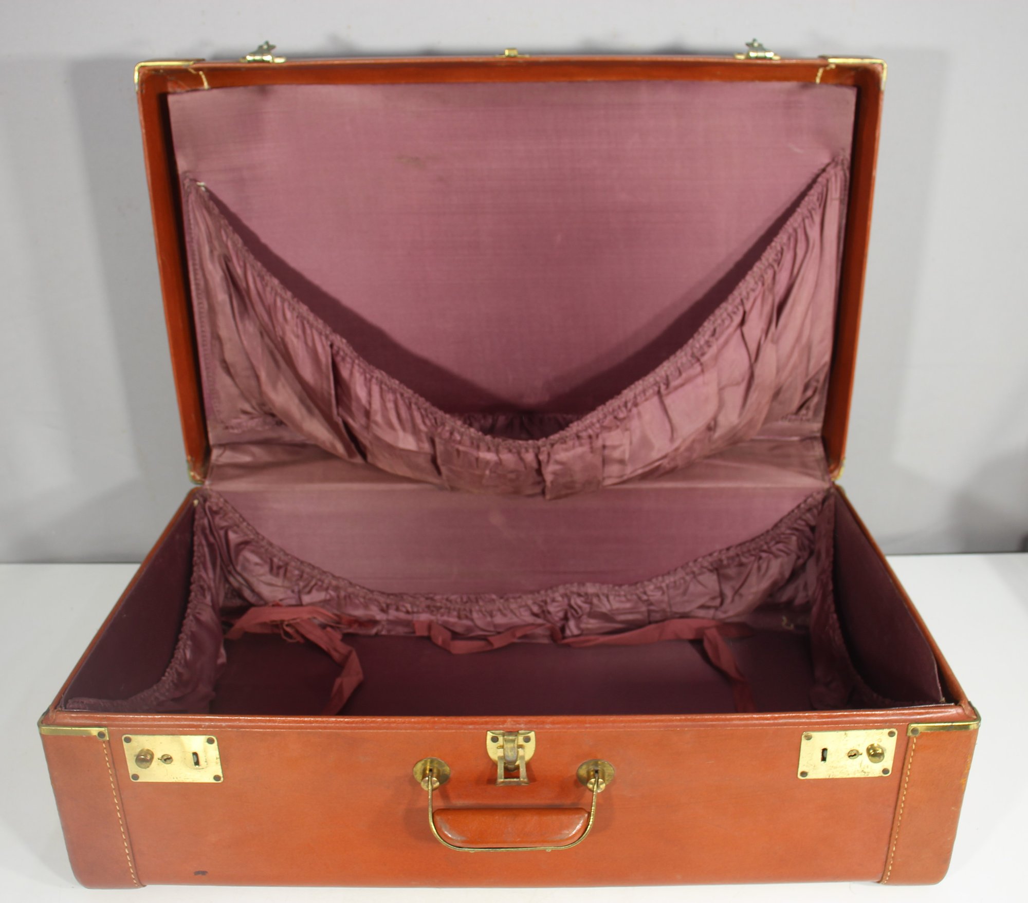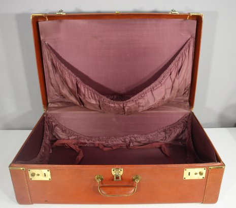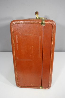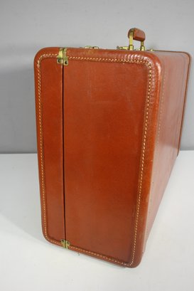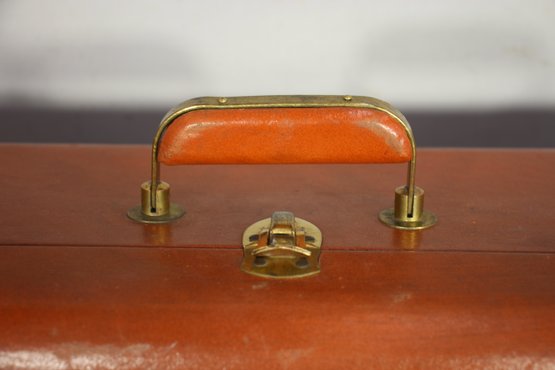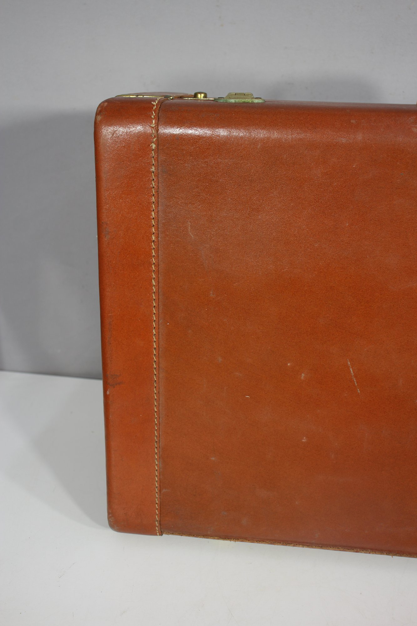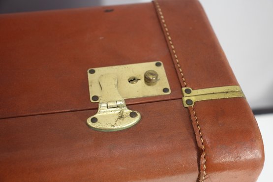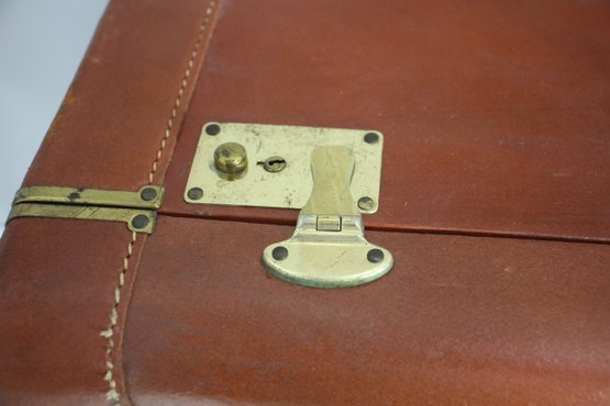 Step back in time with this stunning vintage leather hard-shell suitcase, perfect for collectors, travelers, or home decor enthusiasts. This classic suitcase features a rich brown leather exterior with brass hardware, exuding timeless elegance and durability.