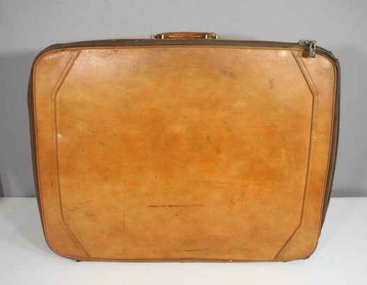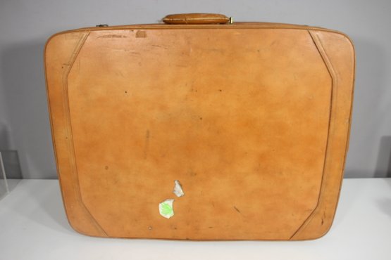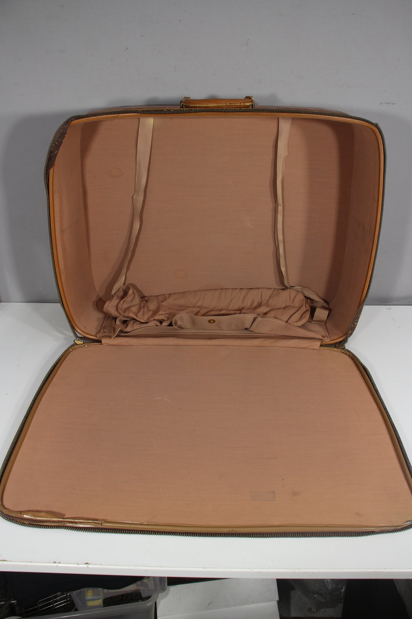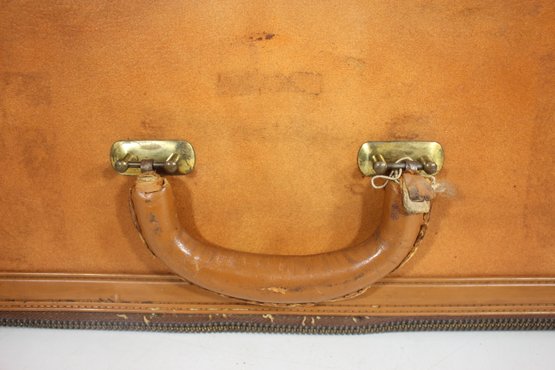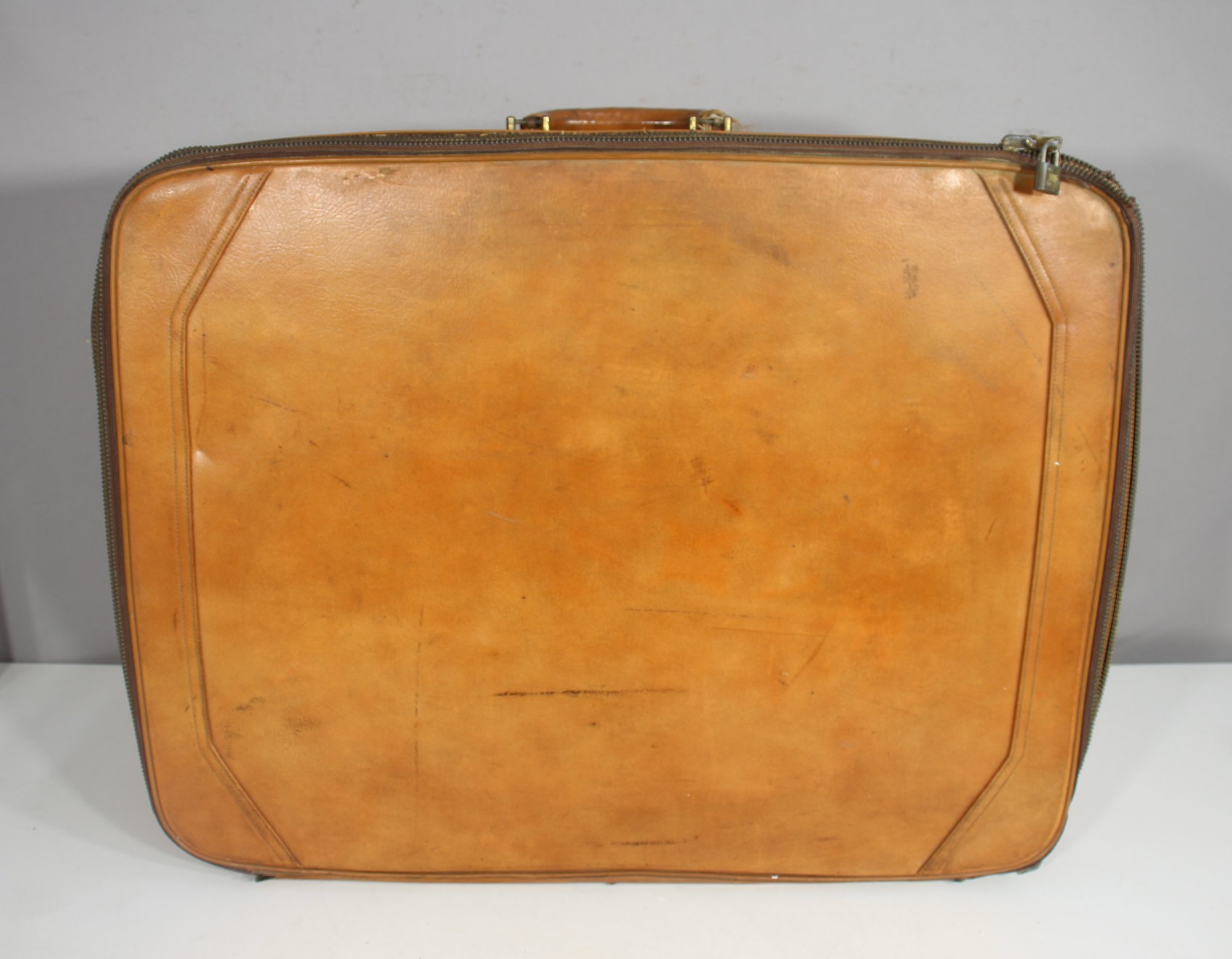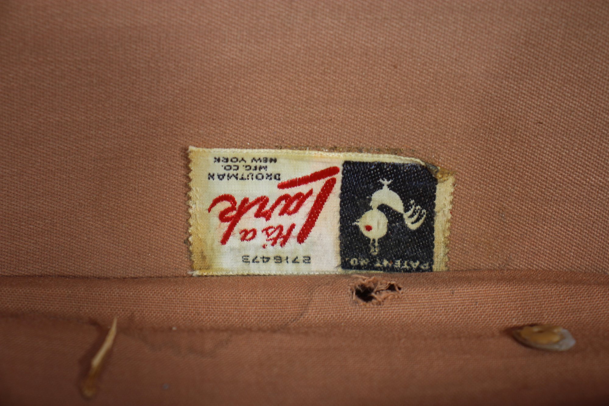 A classic vintage leather suitcase by Drouthman Mfg. Co., New York, labeled “It’s a Lark”—a fantastic collectible piece with a timeless, well-worn patina. This 21” x 27” x 7.5” suitcase features a sturdy leather exterior, brass hardware, and a fabric-lined interior, making it a great display piece for vintage decor, travel enthusiasts, or restoration projects.