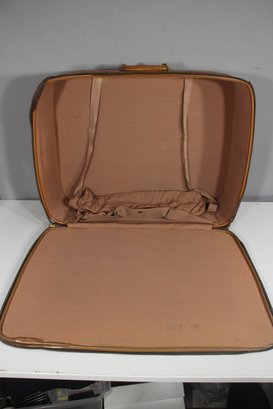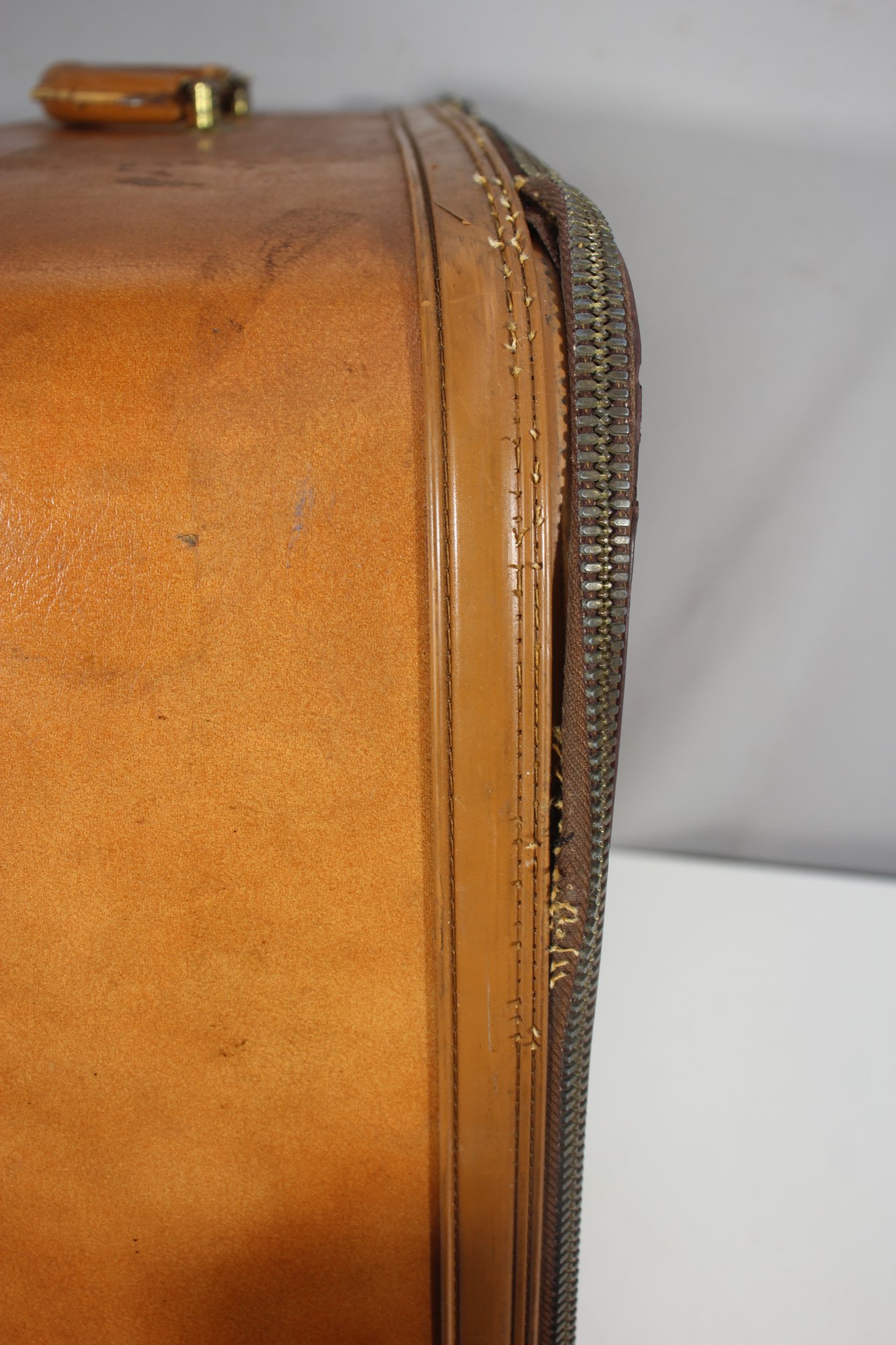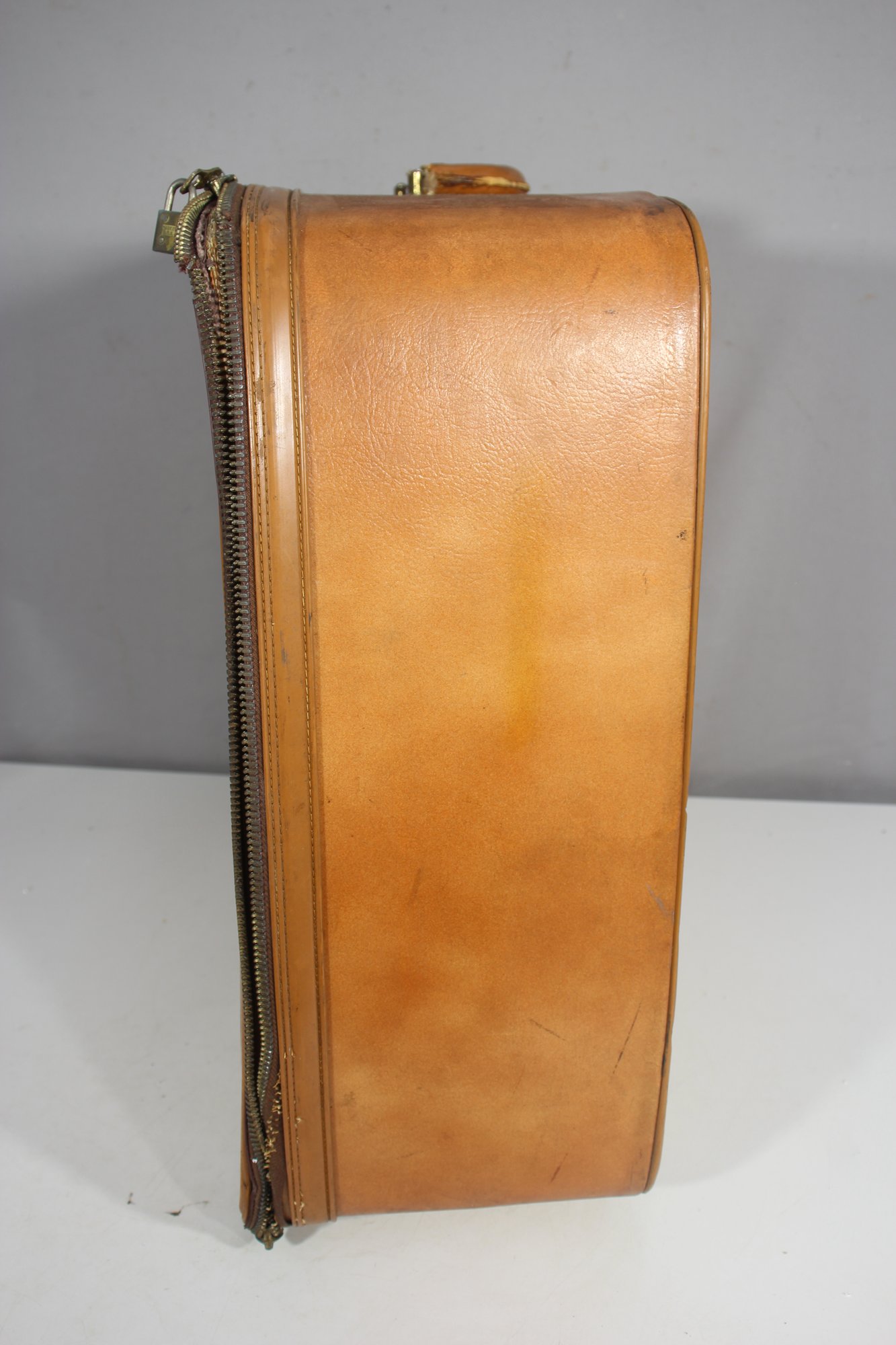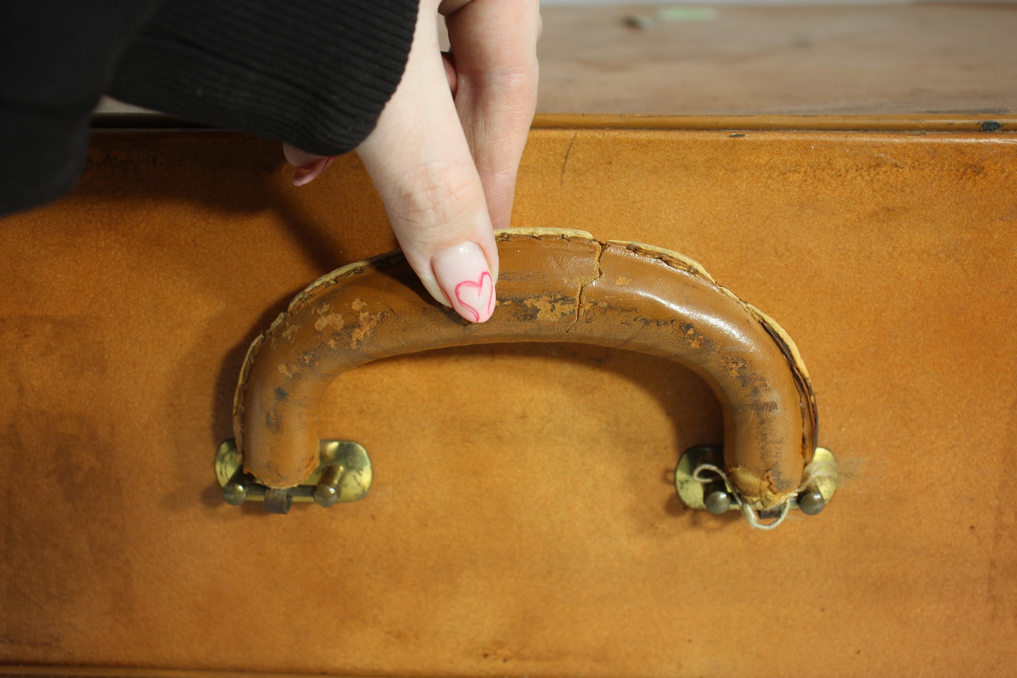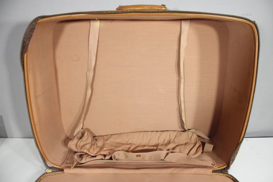 A classic vintage leather suitcase by Drouthman Mfg. Co., New York, labeled “It’s a Lark”—a fantastic collectible piece with a timeless, well-worn patina. This 21” x 27” x 7.5” suitcase features a sturdy leather exterior, brass hardware, and a fabric-lined interior, making it a great display piece for vintage decor, travel enthusiasts, or restoration projects.