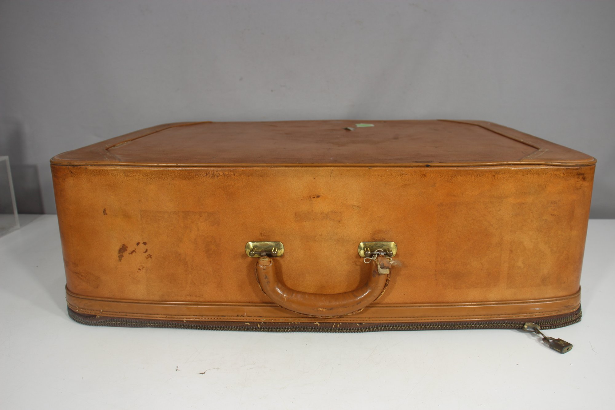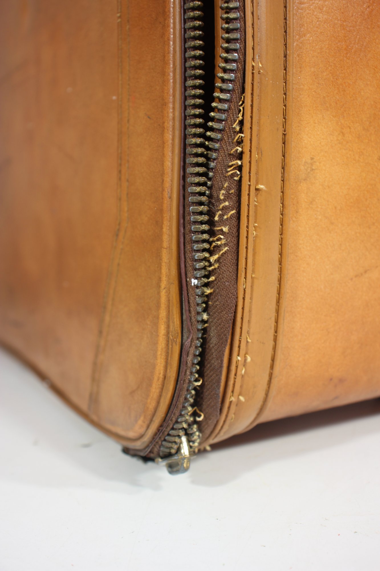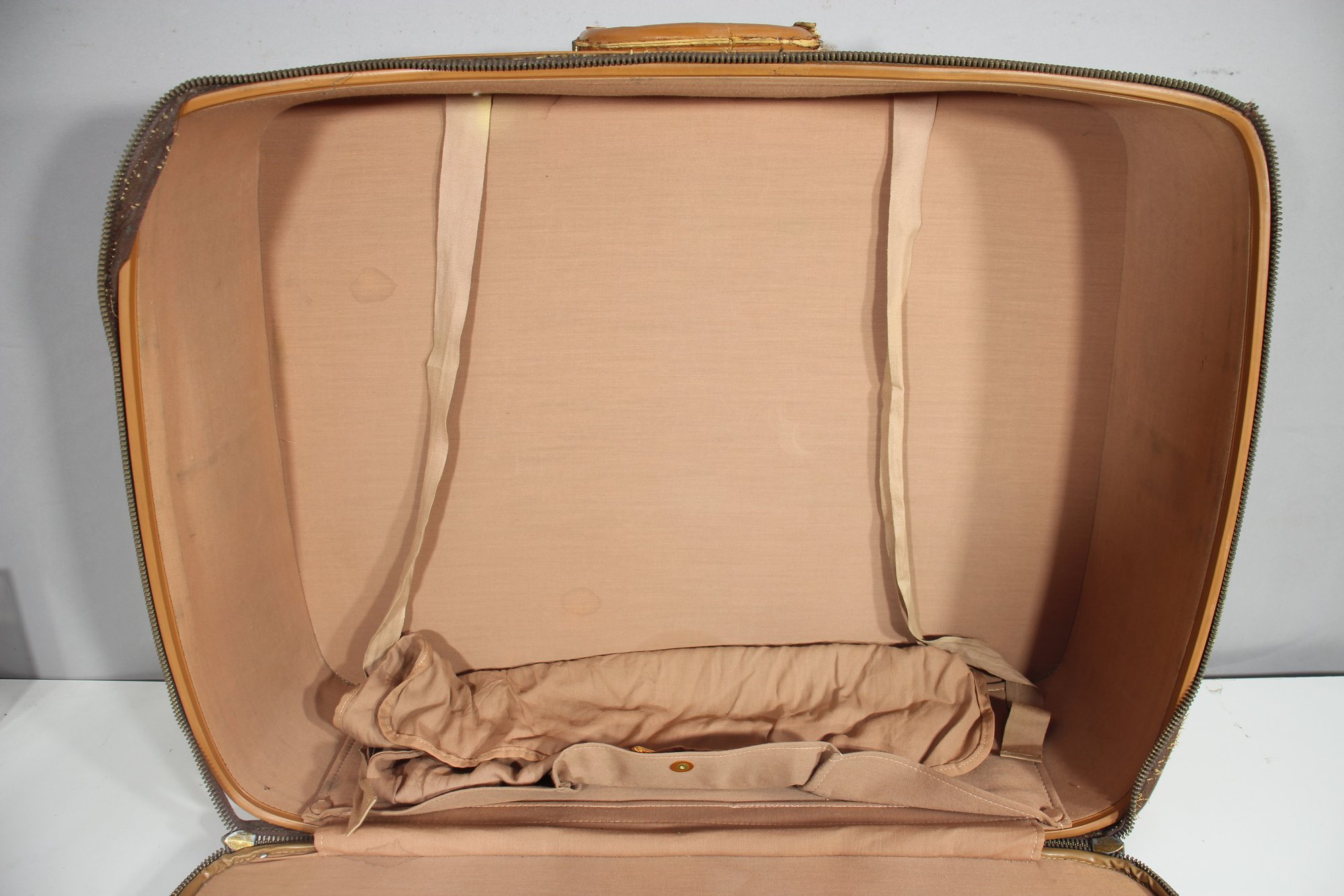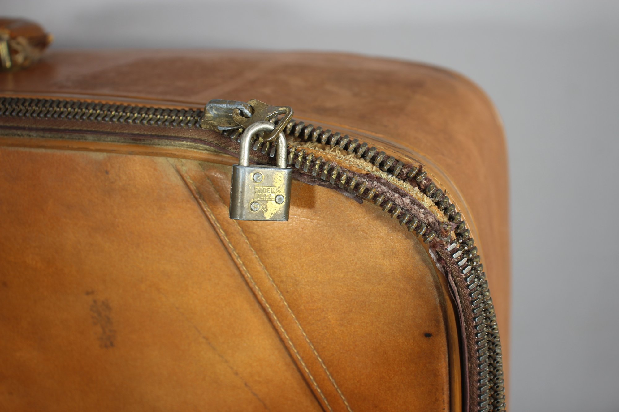A classic vintage leather suitcase by Drouthman Mfg. Co., New York, labeled “It’s a Lark”—a fantastic collectible piece with a timeless, well-worn patina. This 21” x 27” x 7.5” suitcase features a sturdy leather exterior, brass hardware, and a fabric-lined interior, making it a great display piece for vintage decor, travel enthusiasts, or restoration projects.