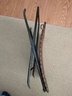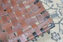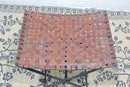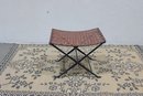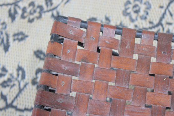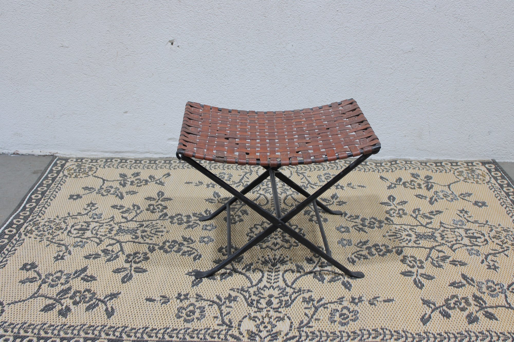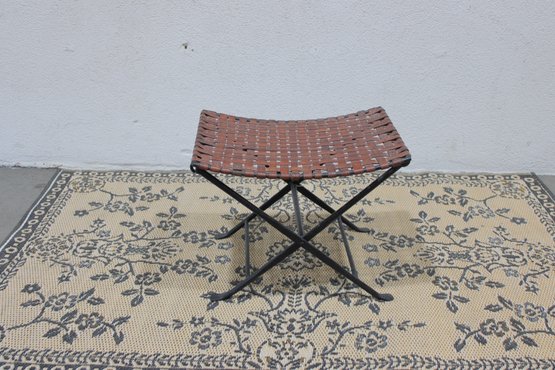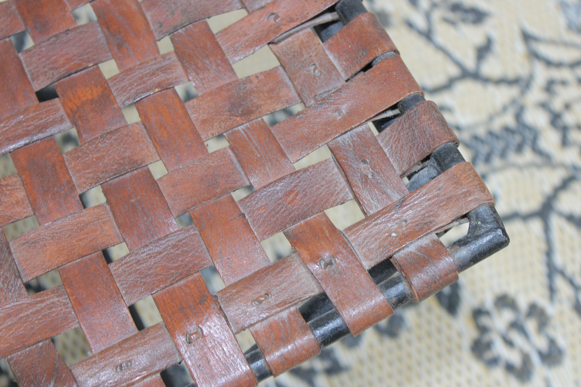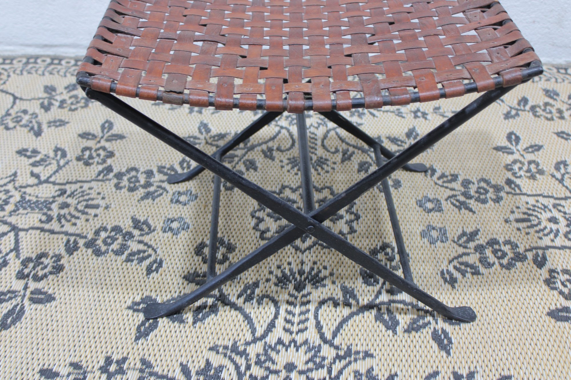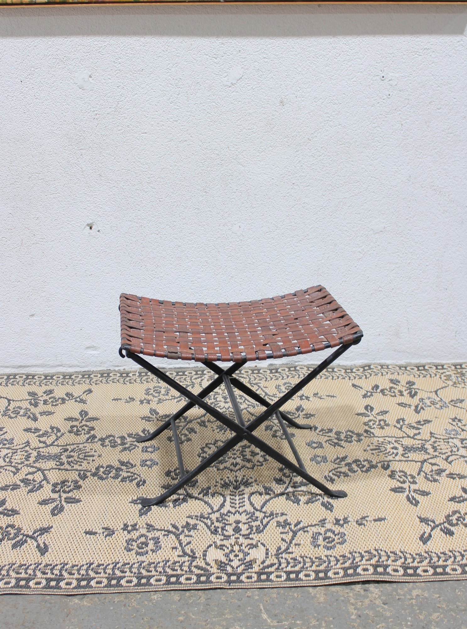 The seat is constructed from interwoven brown leather straps, creating a sturdy yet flexible surface that offers both comfort and visual appeal. The folding iron base provides stability while allowing for easy storage and portability, making it perfect for use as a stool, footrest, or accent piece.
