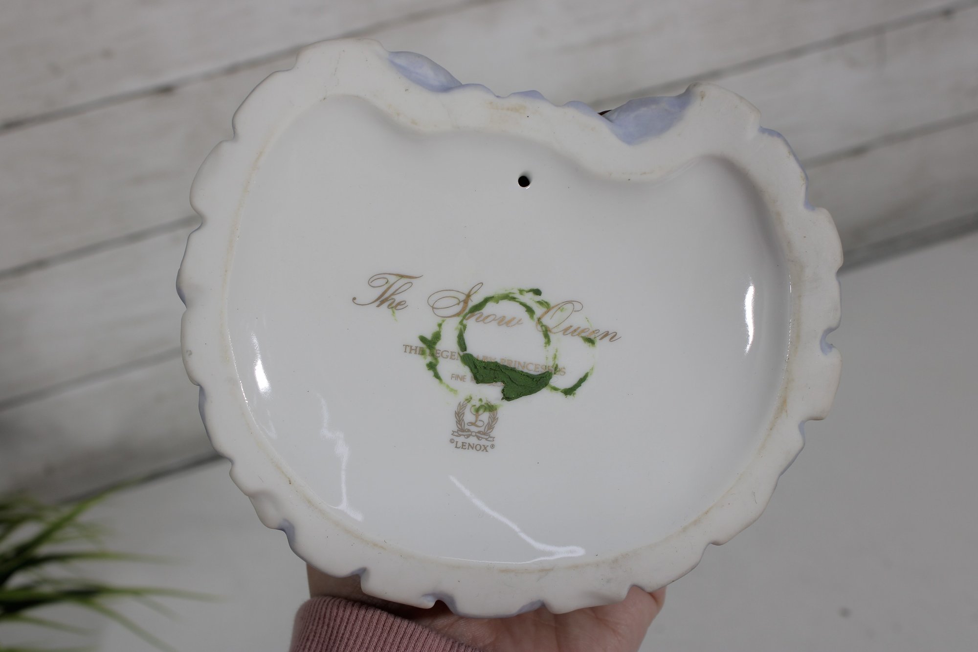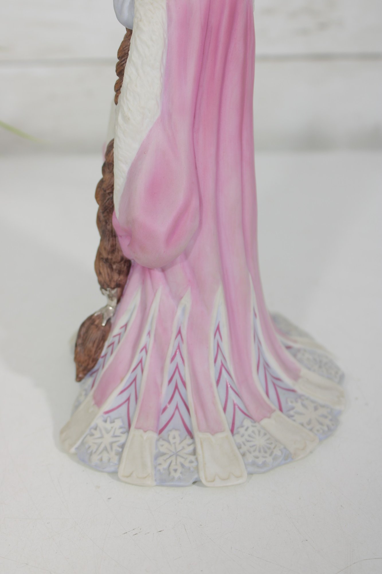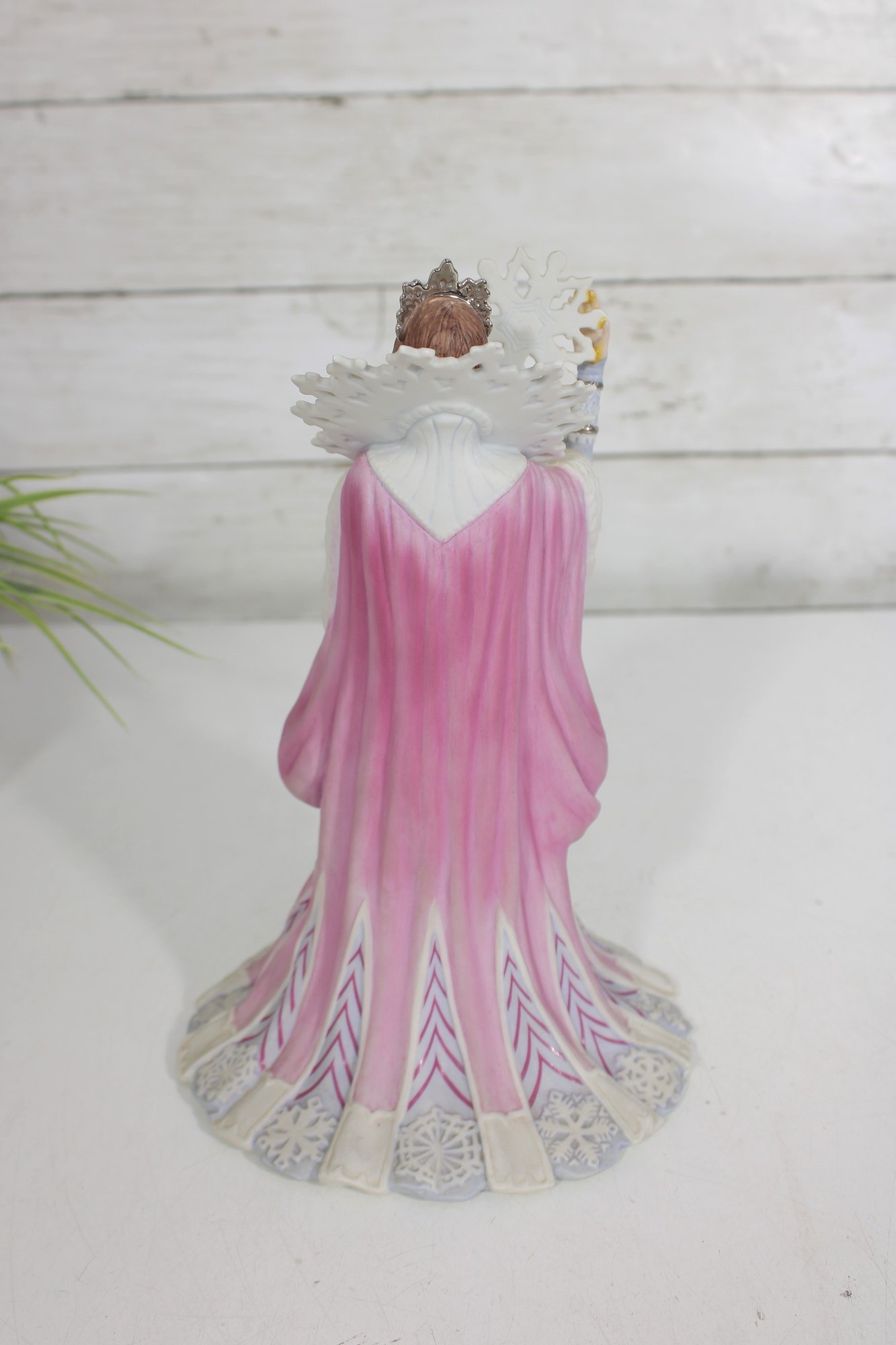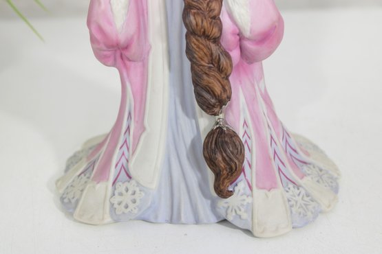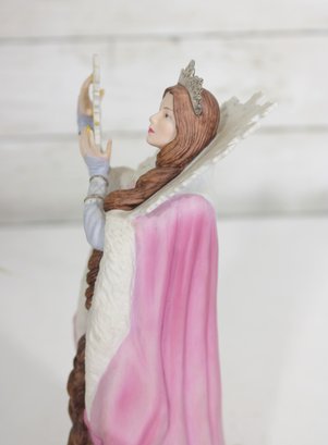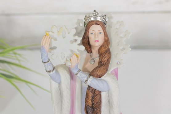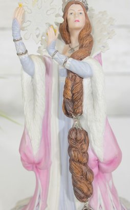 vintage Lenox figurine from the Legendary Princess Collection, featuring The Snow Queen in a regal and enchanting pose. Crafted in fine porcelain, this beautifully detailed piece captures the icy grace of the character, holding a delicate snowflake while adorned in a flowing gown of soft white, lavender, and blush tones.