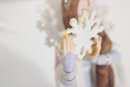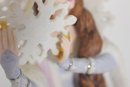 Her long, intricately sculpted braid cascades down the front, complemented by a crown and shimmering accents that enhance the wintry theme. The gown features subtle patterns and refined detailing, showcasing Lenox’s signature artistry and craftsmanship.