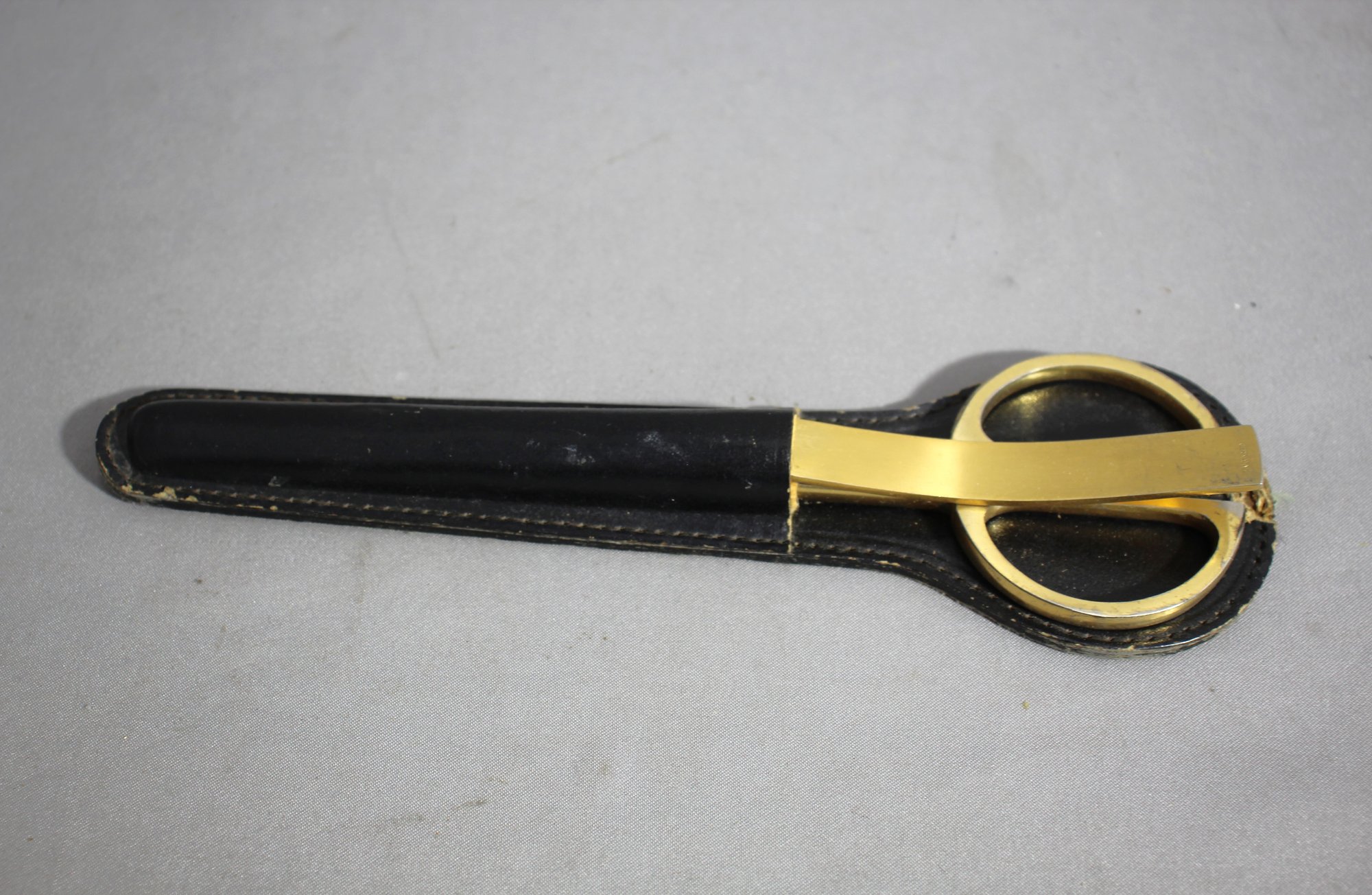 this vintage desk set by LERCHE Solingen, West Germany, features a pair of 22K gold plated scissors that blend both function and style. The set includes an elegant gold-plated letter opener and a scissor, both marked for their quality and origin. The items are housed in a classic black leather case, although it shows signs of wear which adds to its vintage character. Perfect for collectors of fine office accessories or as a distinctive gift,
