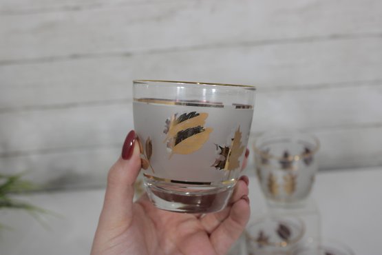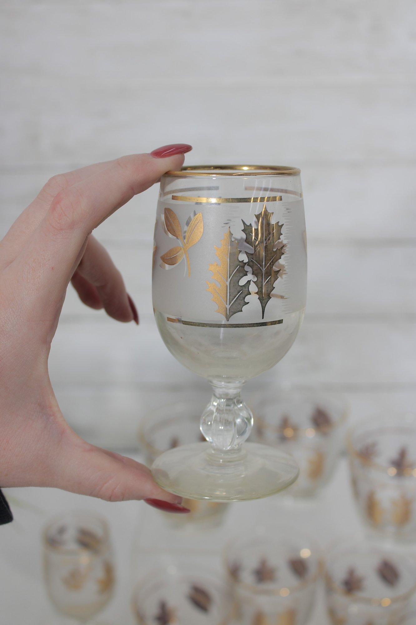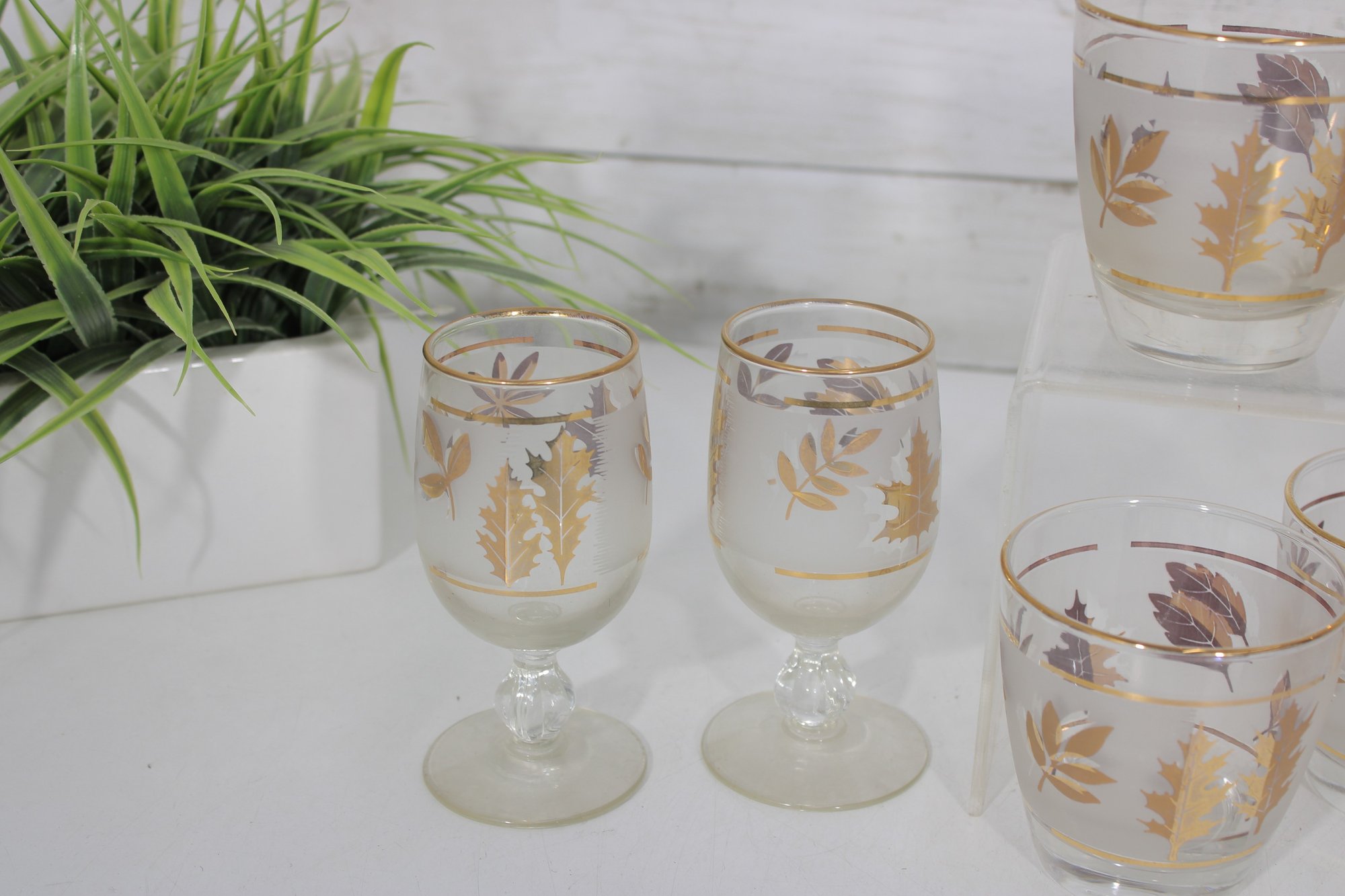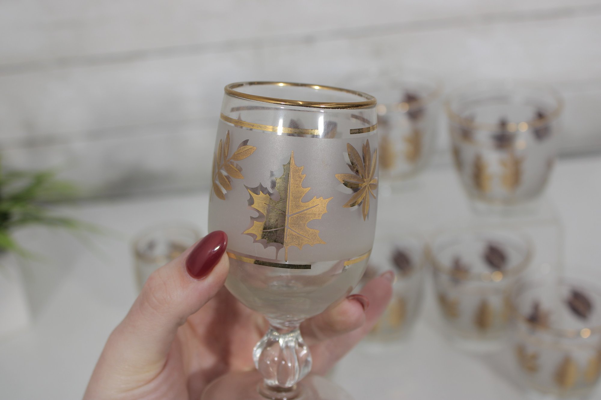 Beautiful vintage Libbey glassware set featuring the classic gold oak leaf frosted pattern. This elegant mid-century barware collection includes a mix of stemmed cordial glasses and lowball tumblers, each decorated with shimmering gold leaf accents that add timeless style to any bar or entertaining space.