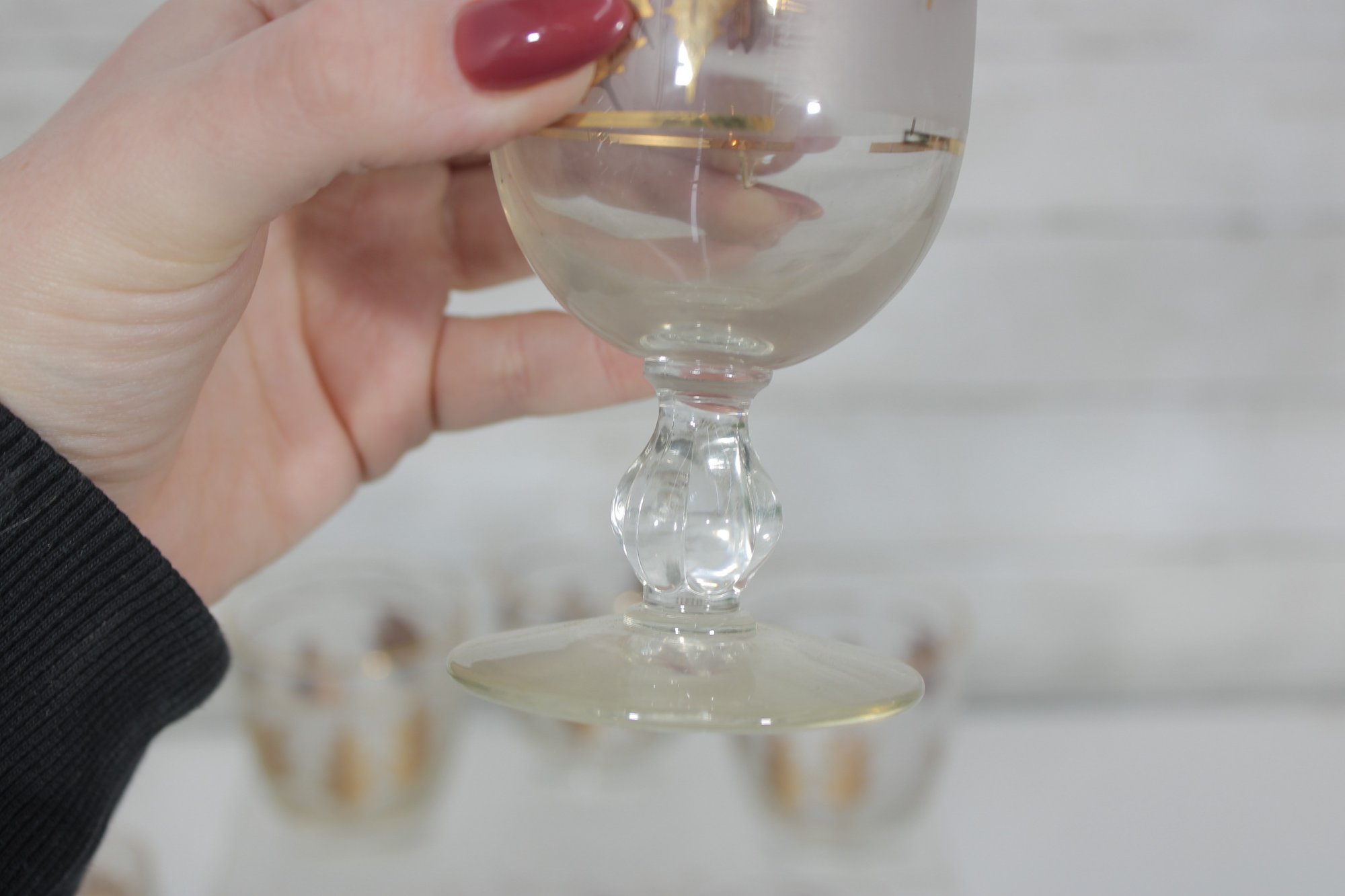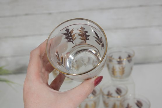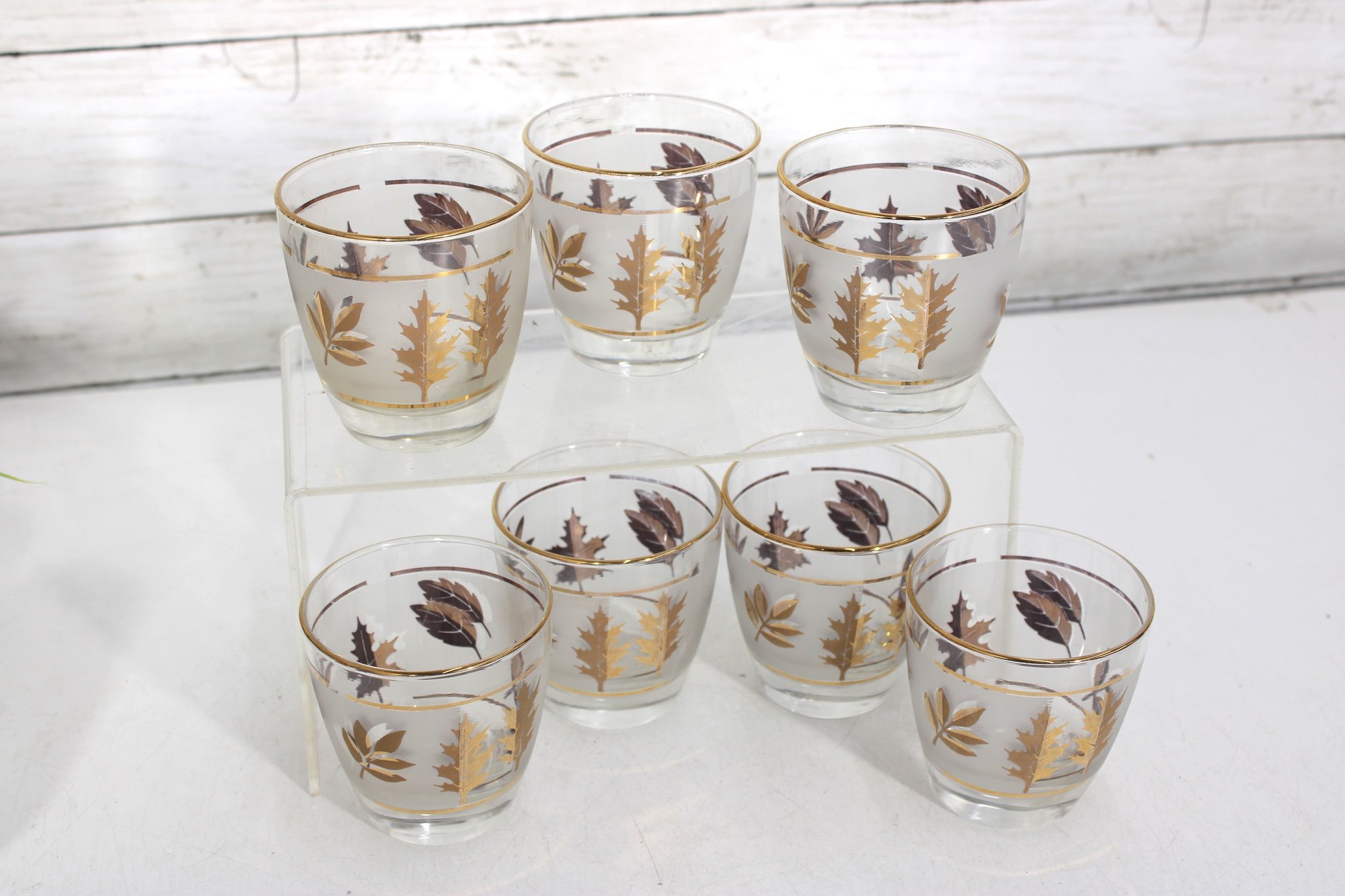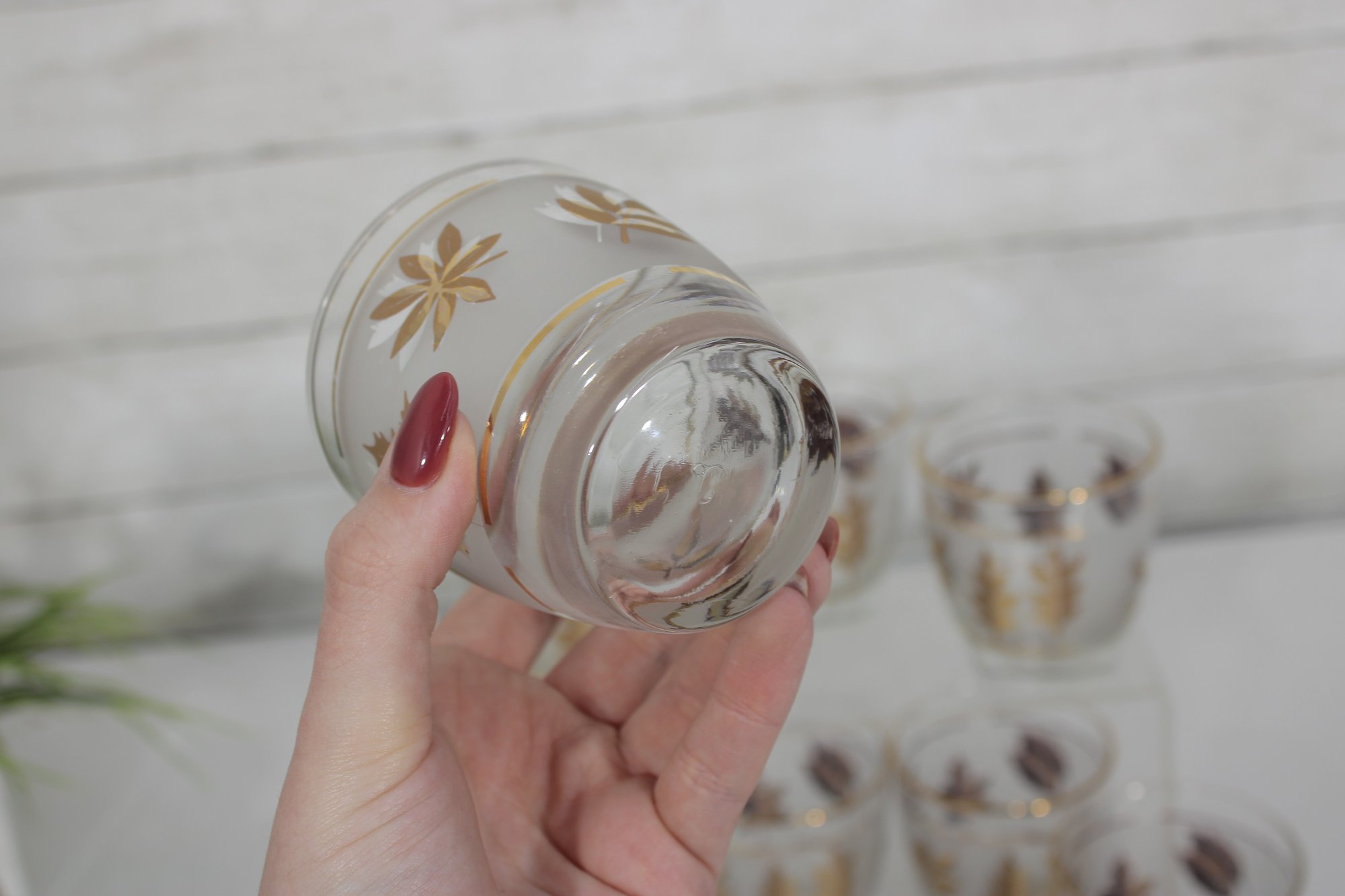 Beautiful vintage Libbey glassware set featuring the classic gold oak leaf frosted pattern. This elegant mid-century barware collection includes a mix of stemmed cordial glasses and lowball tumblers, each decorated with shimmering gold leaf accents that add timeless style to any bar or entertaining space.