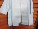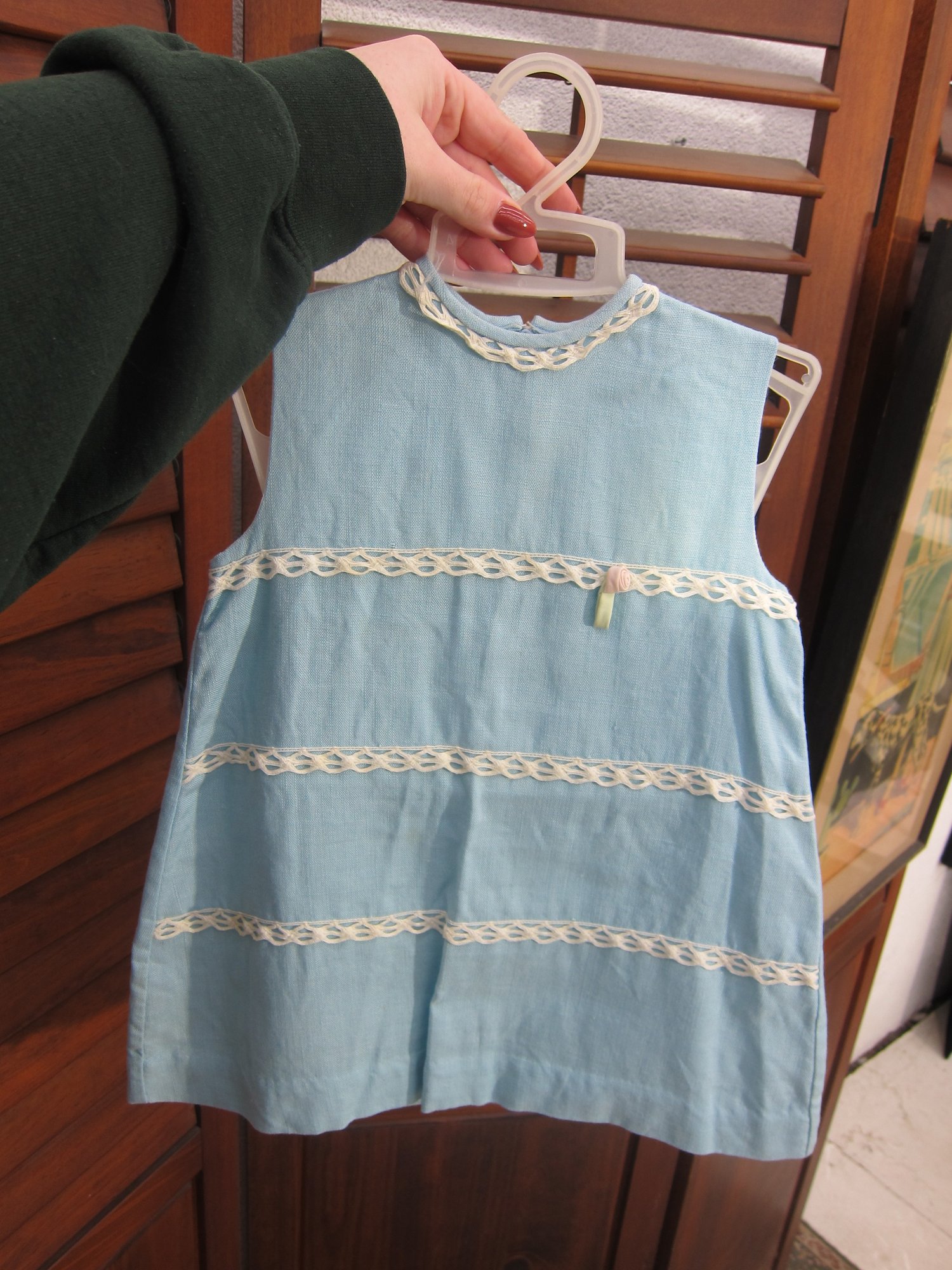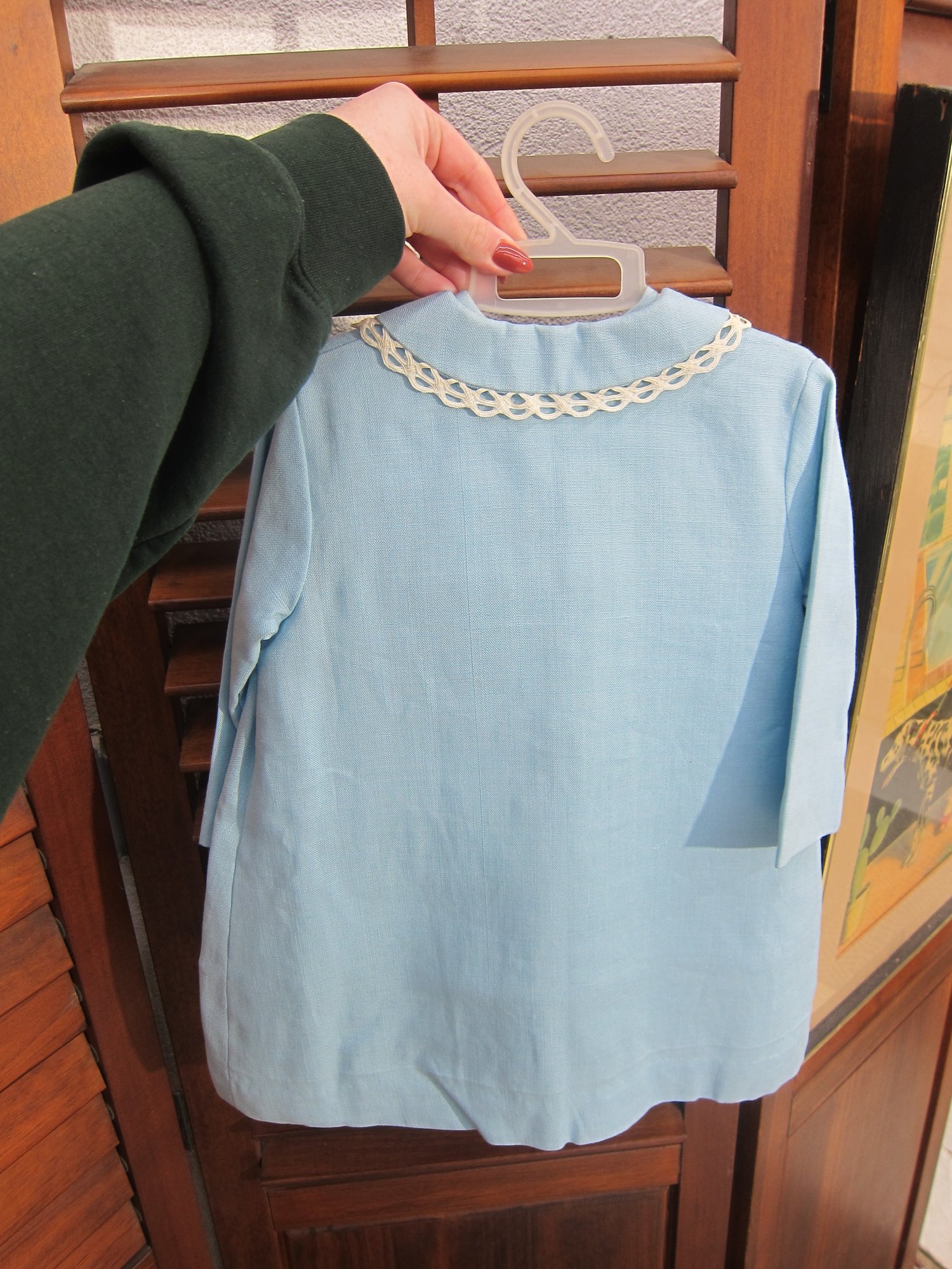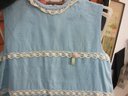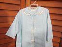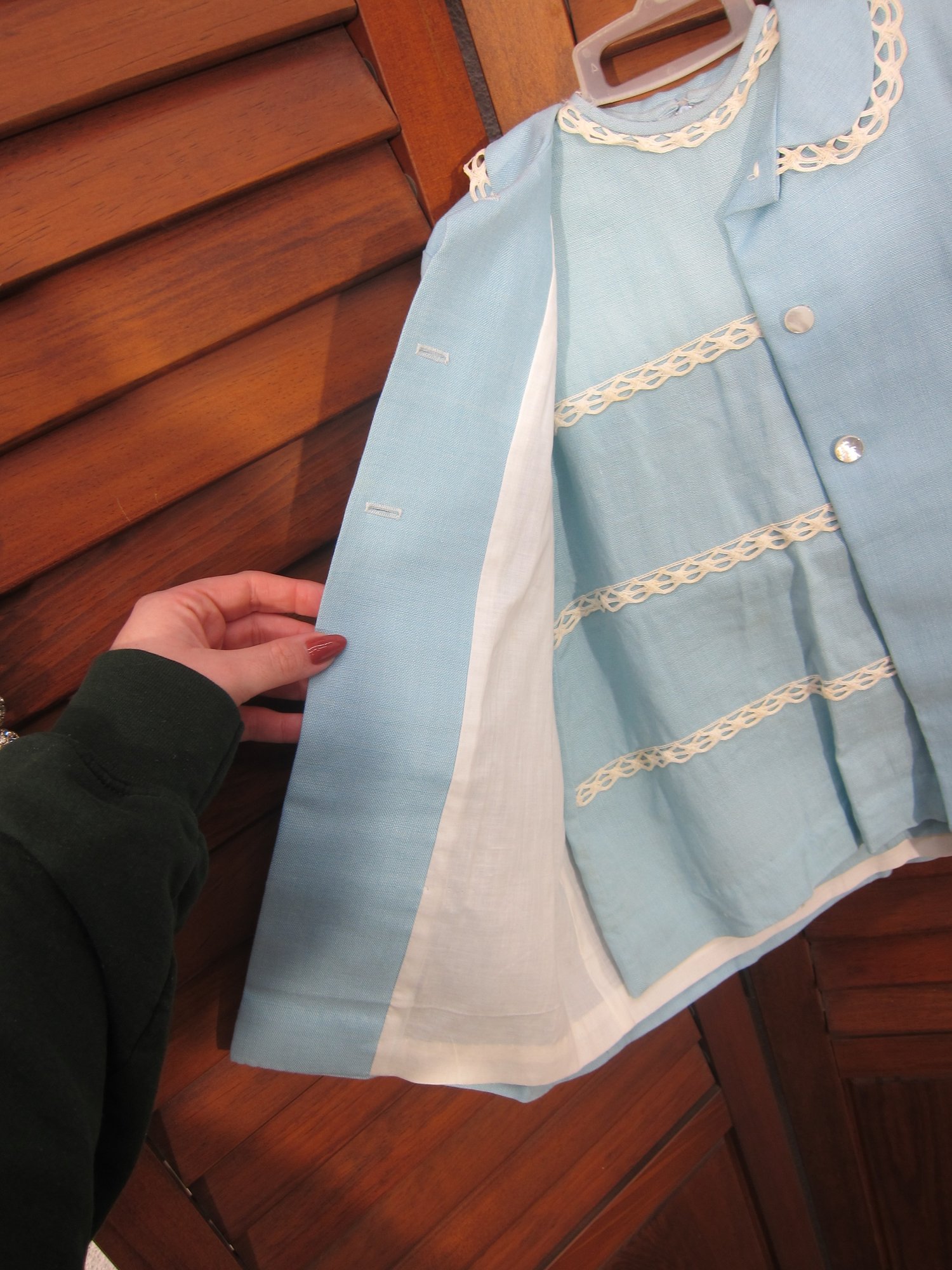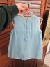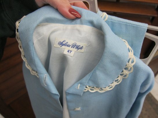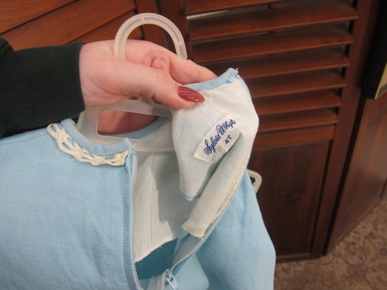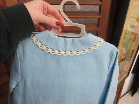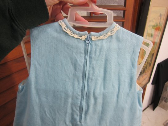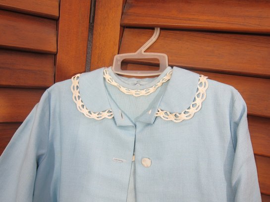Charming vintage child’s two-piece outfit featuring a light blue dress with a coordinating matching jacket. The dress showcases delicate trim detailing across the bodice and a simple, timeless silhouette, while the jacket features a scalloped collar and decorative accents that complete the classic look.