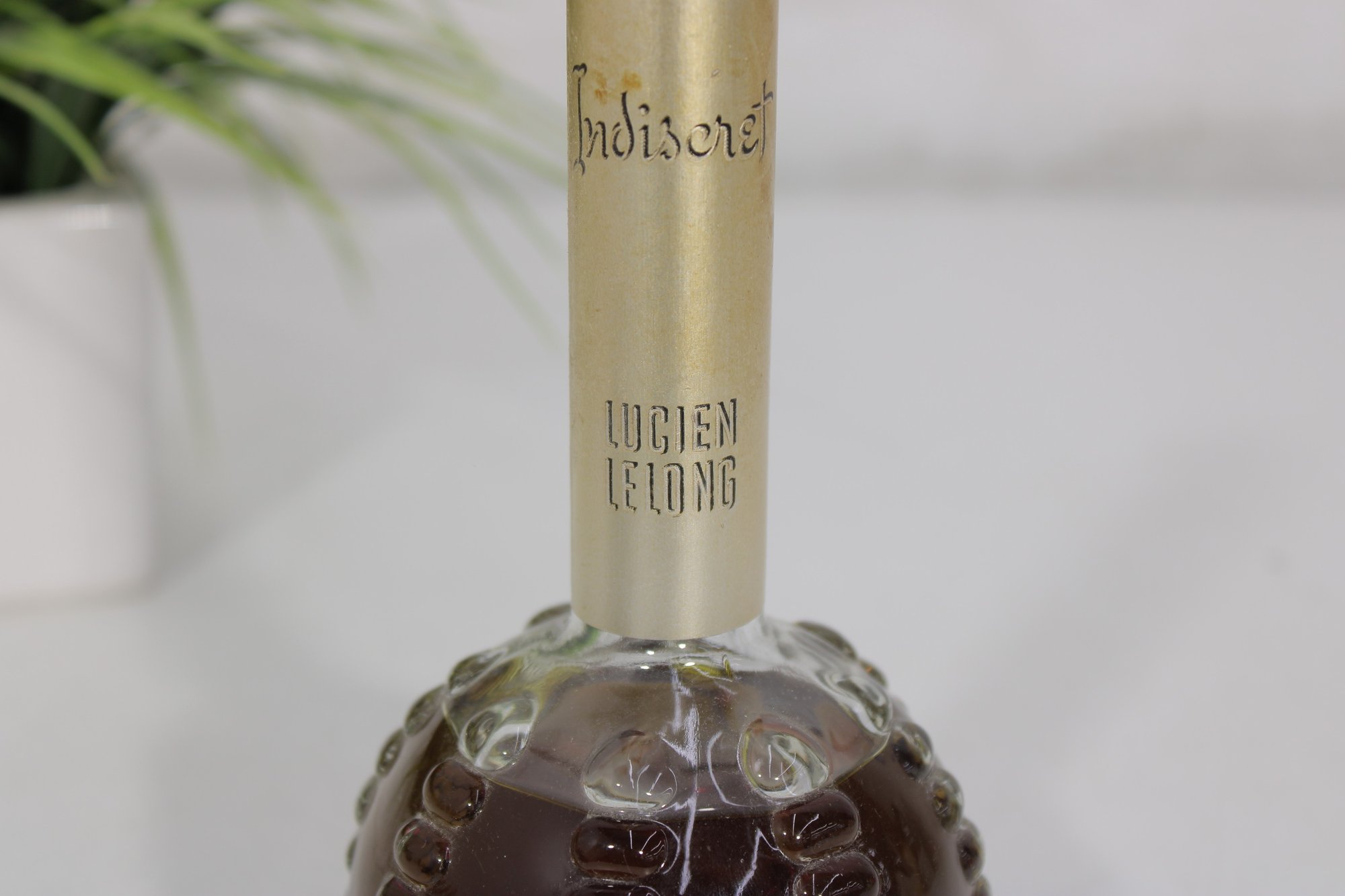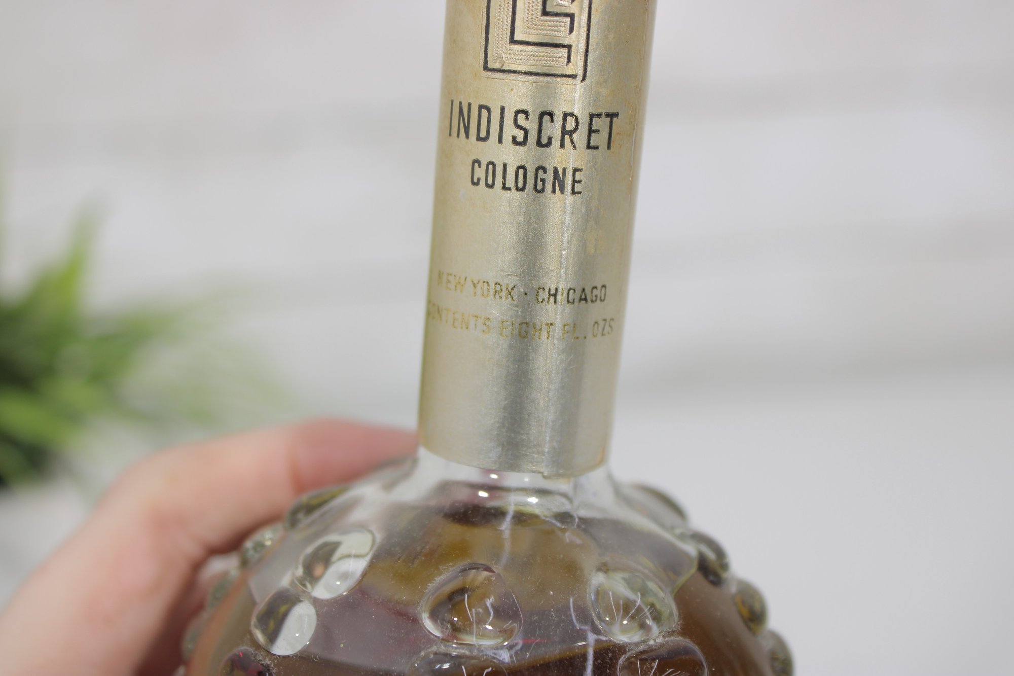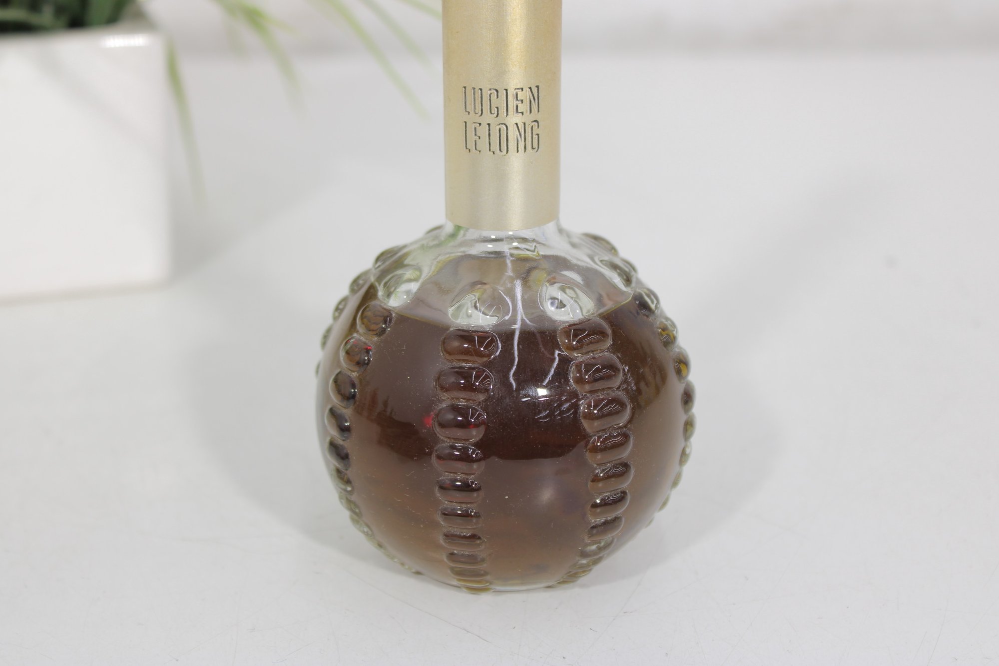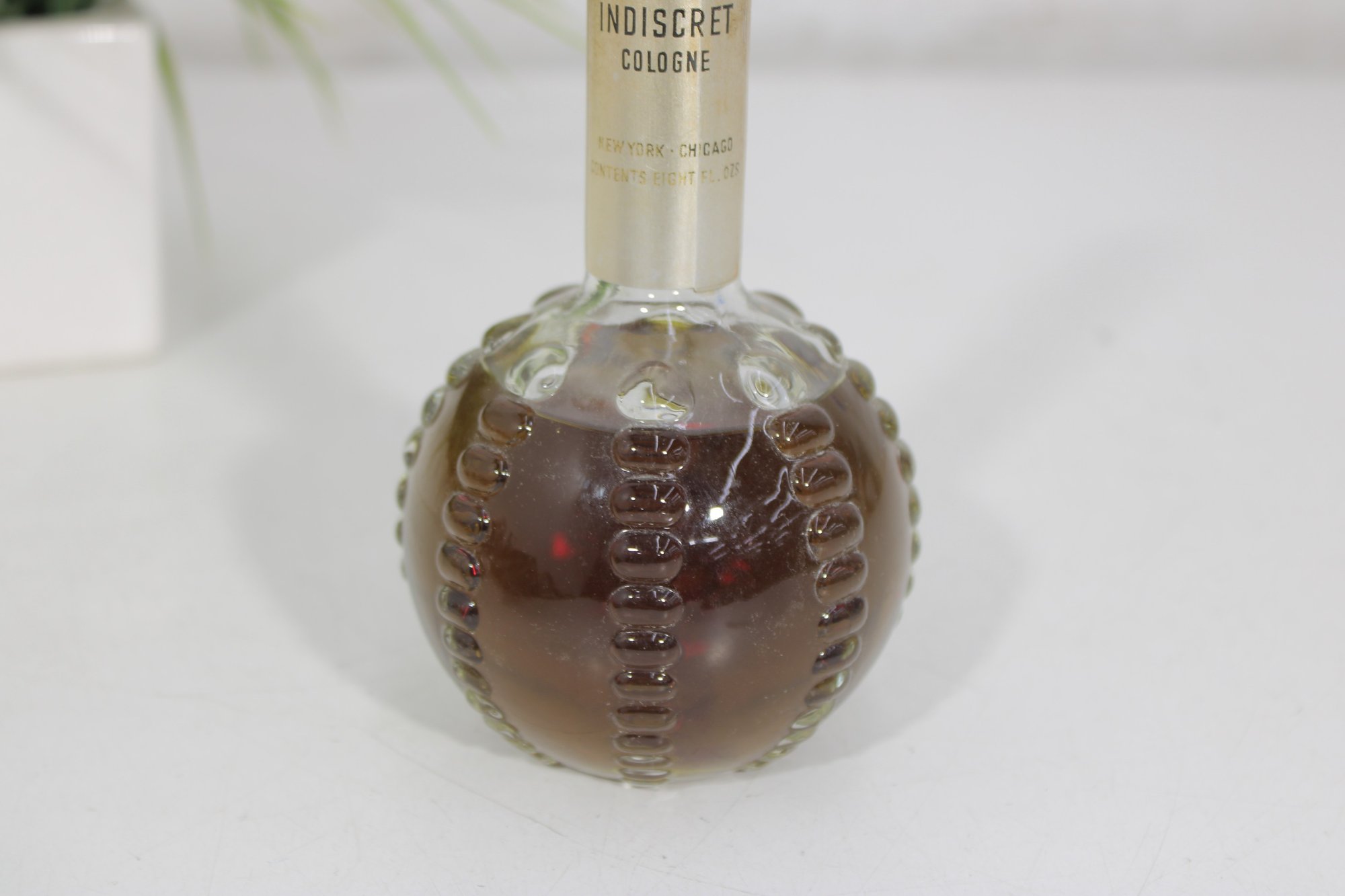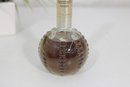 This elegant fragrance bottle features a round, textured hobnail glass base with a long slender neck and original cap.