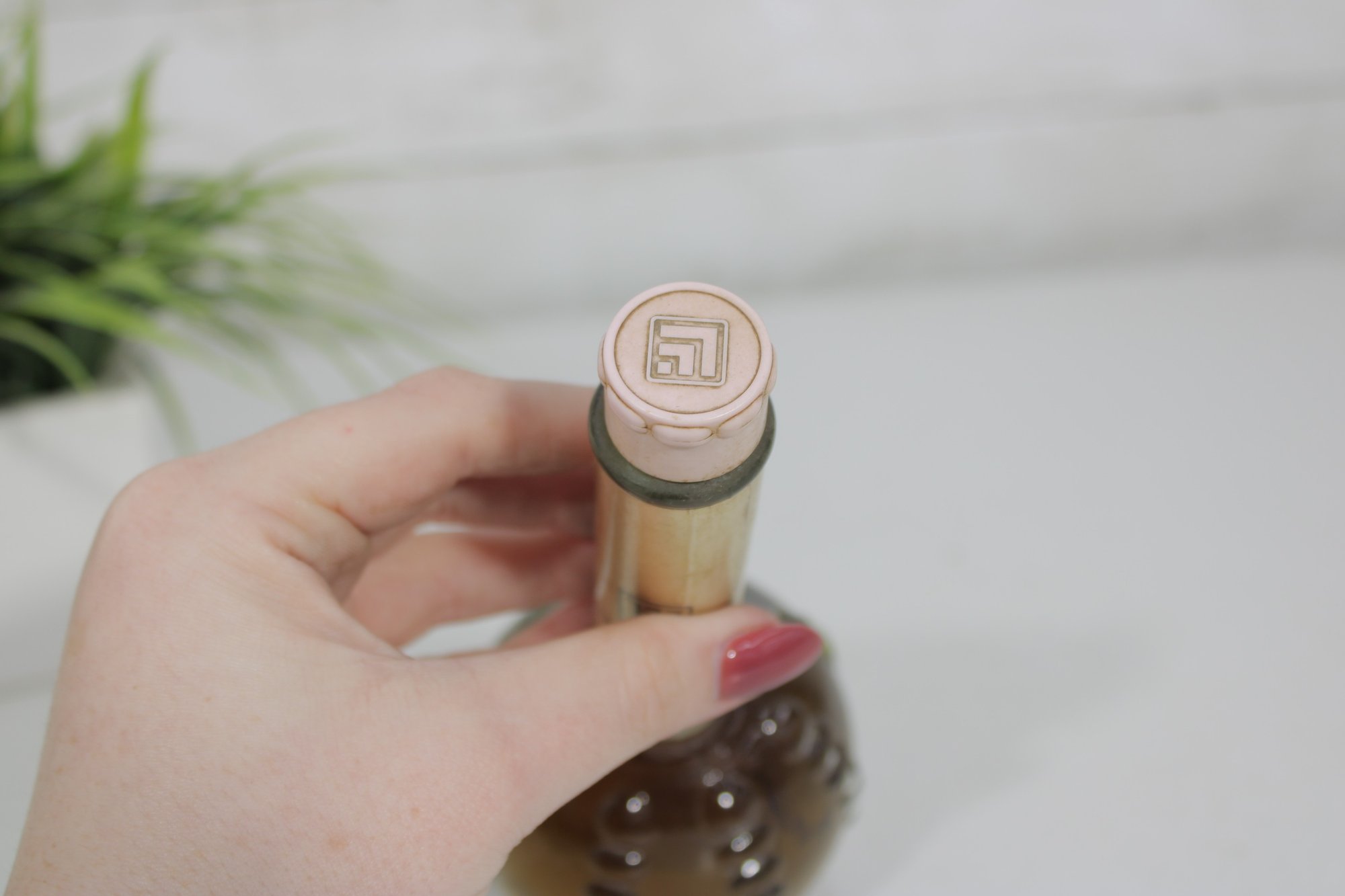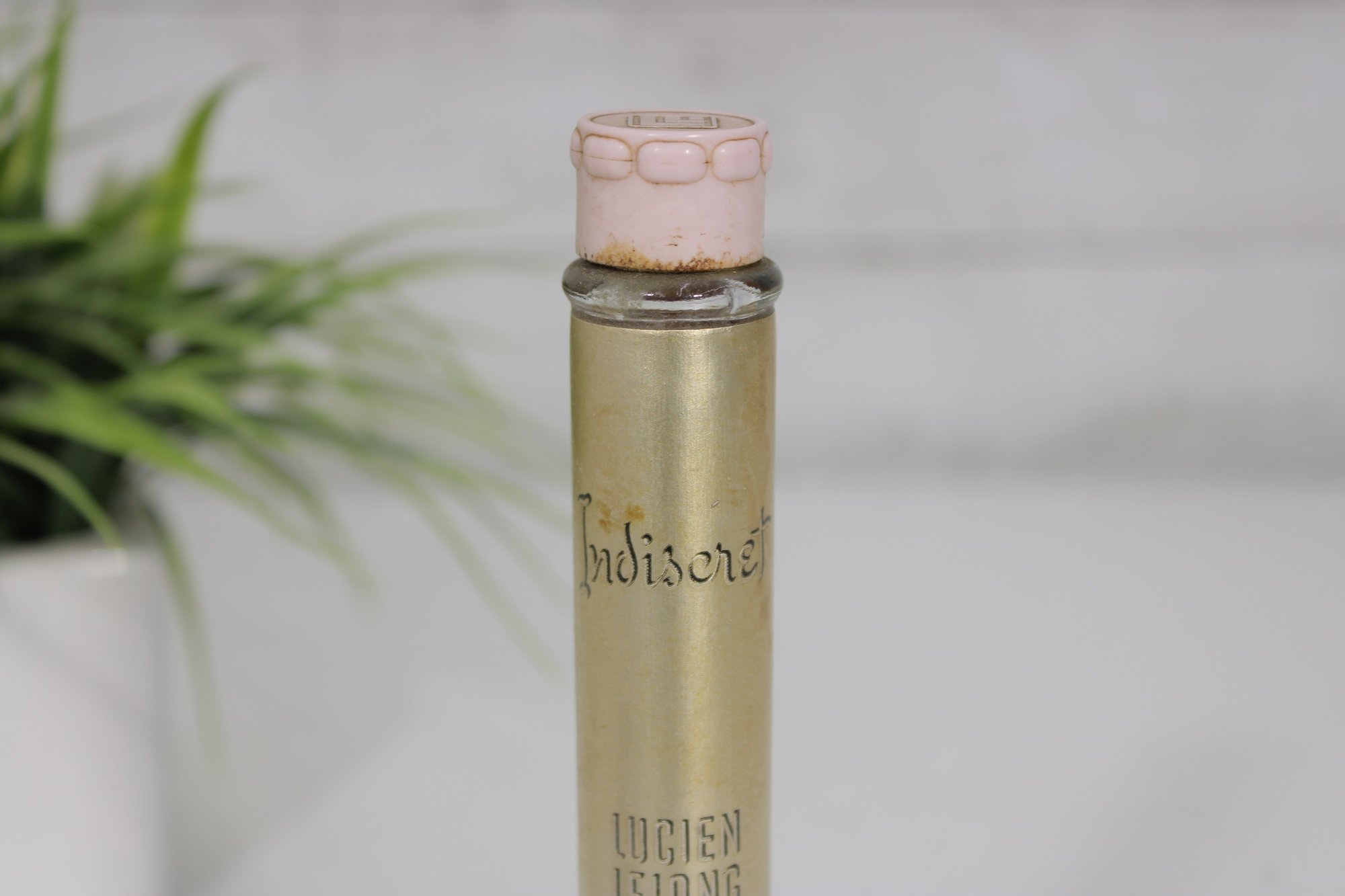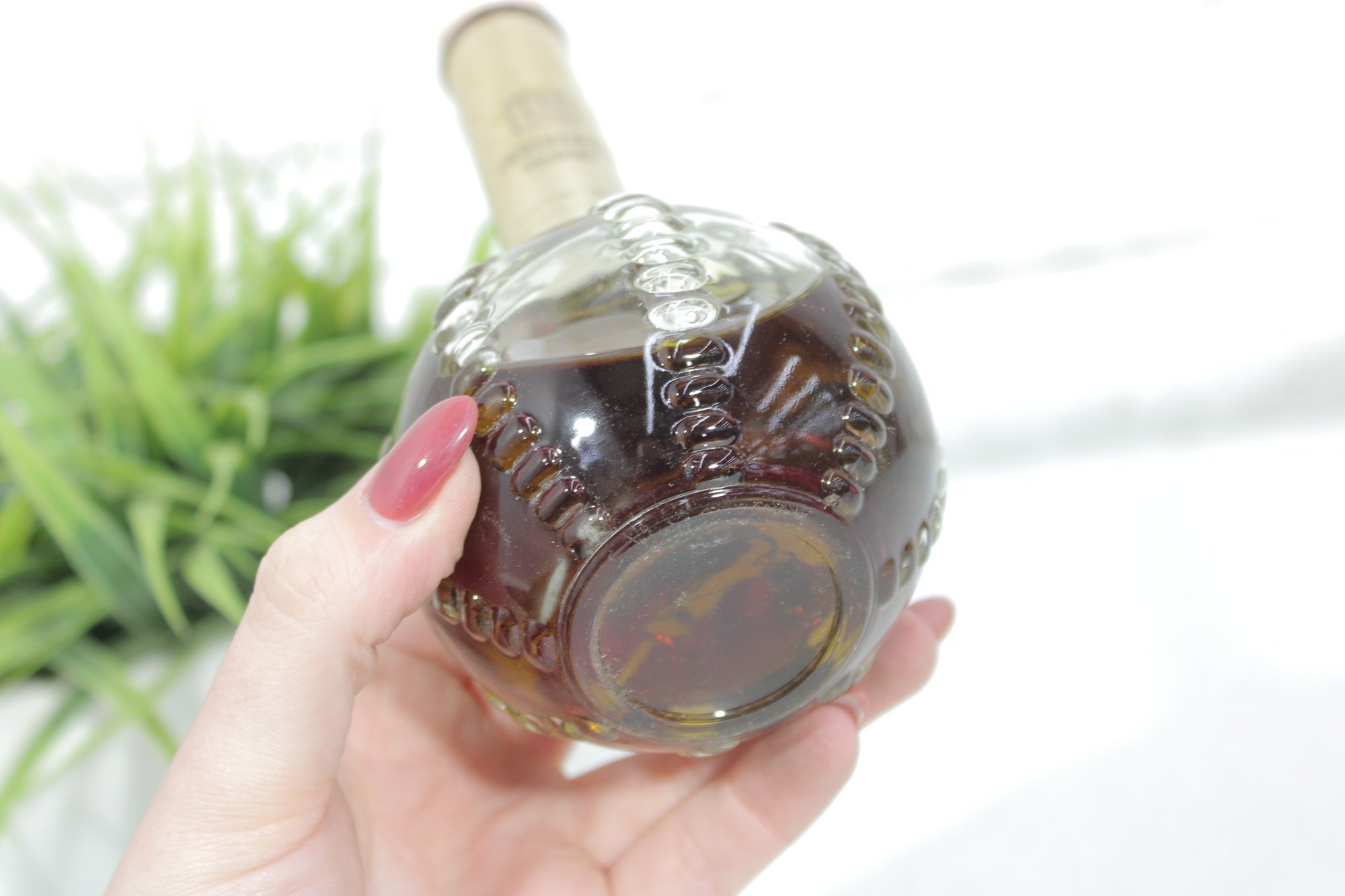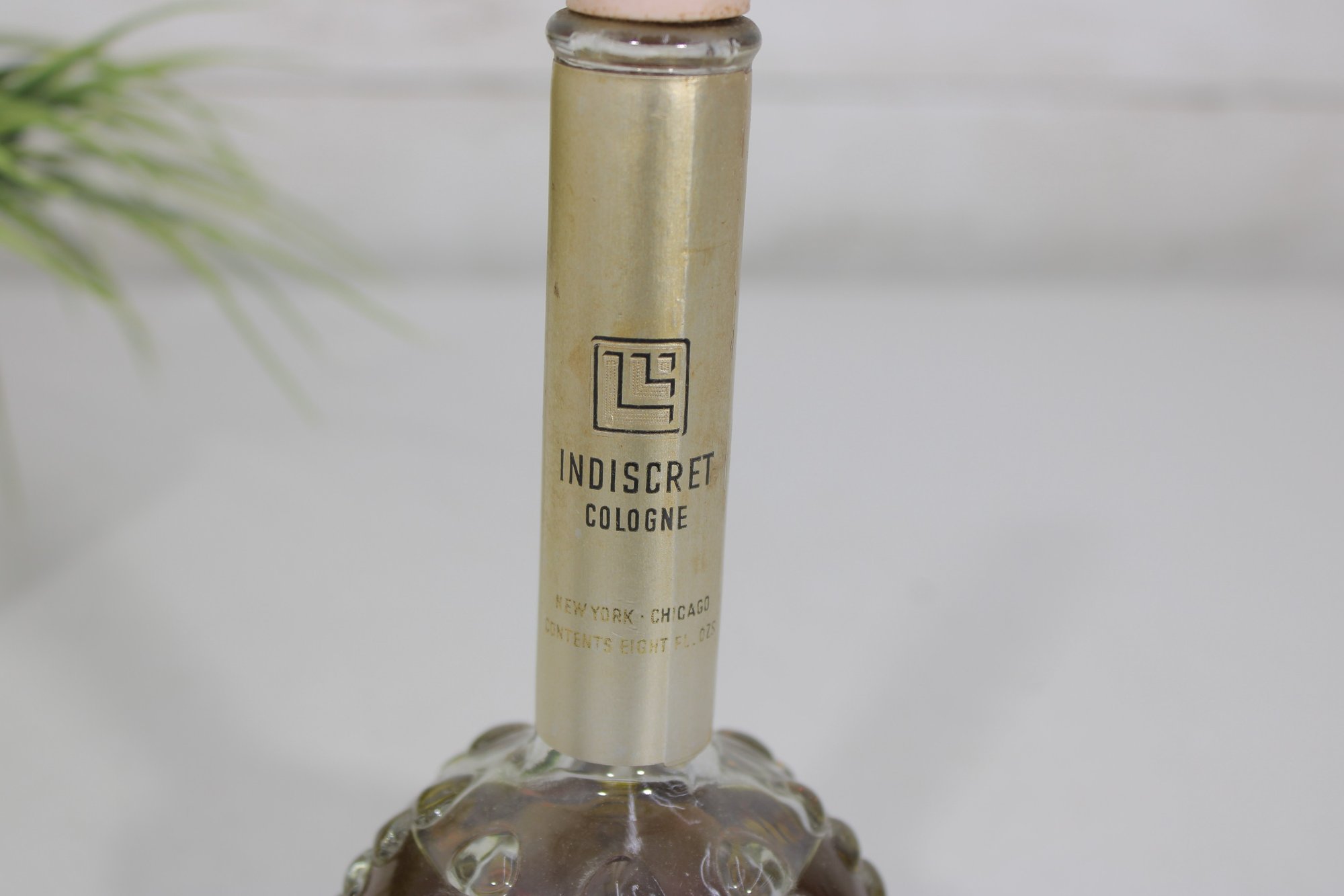 This elegant fragrance bottle features a round, textured hobnail glass base with a long slender neck and original cap.