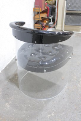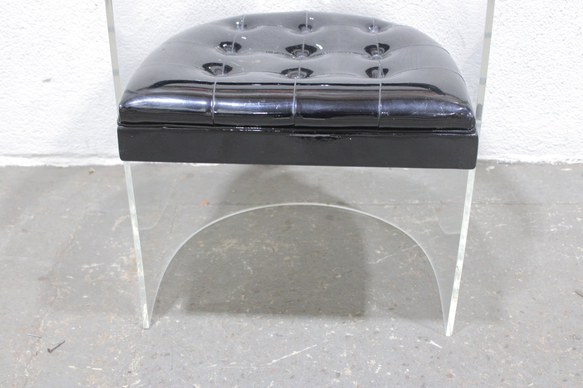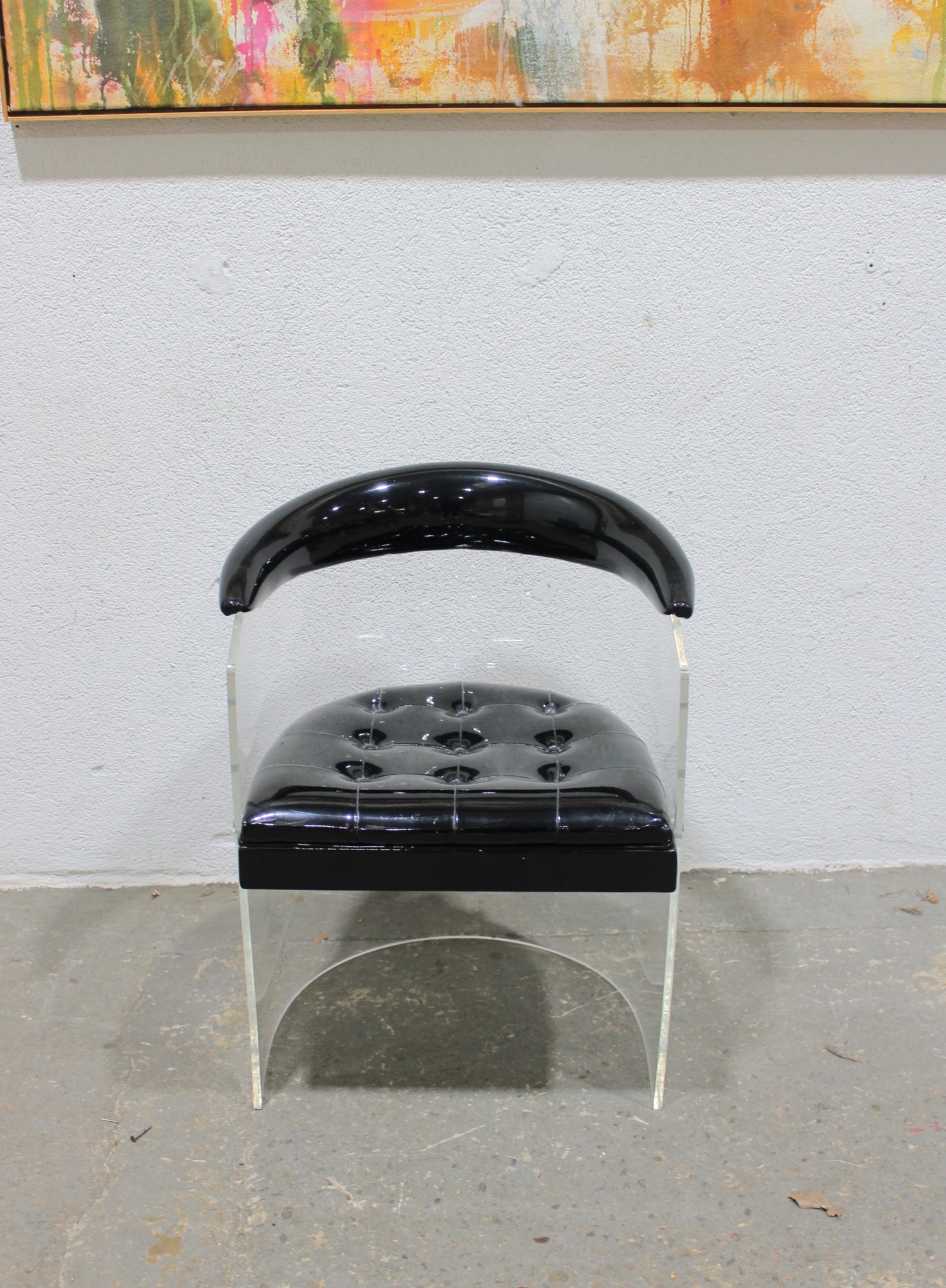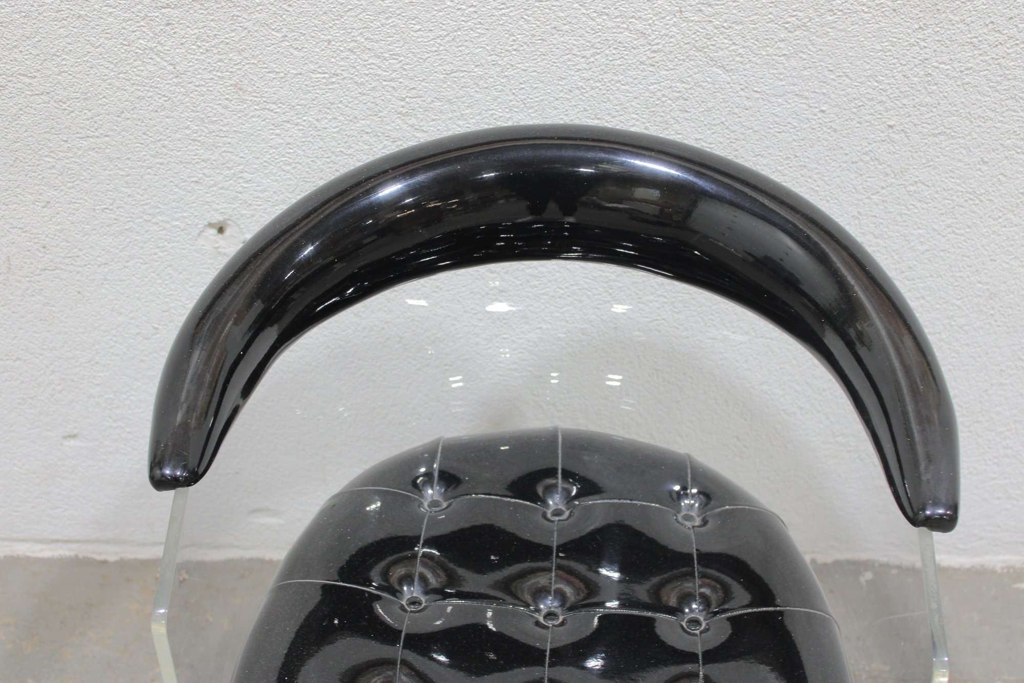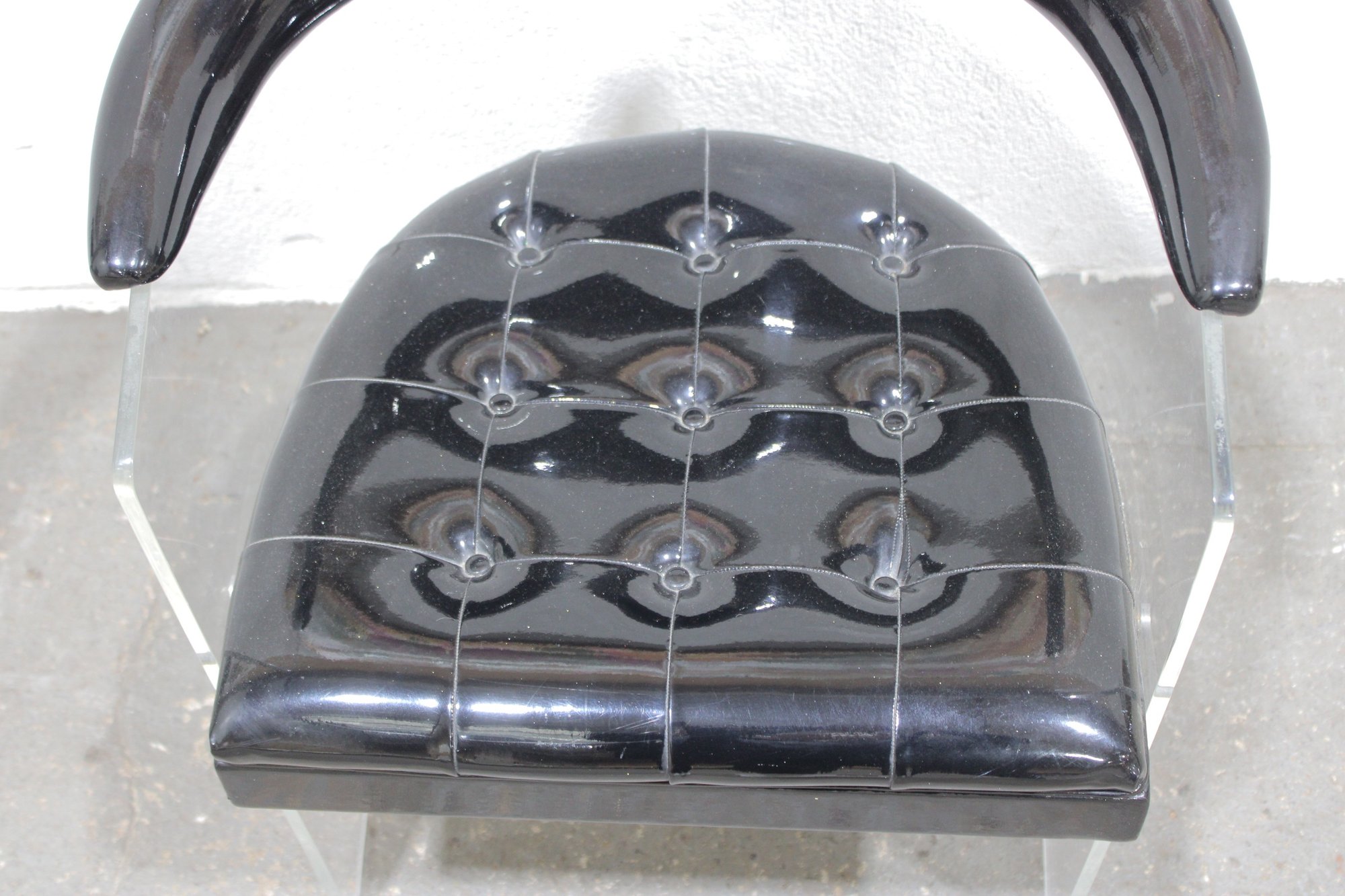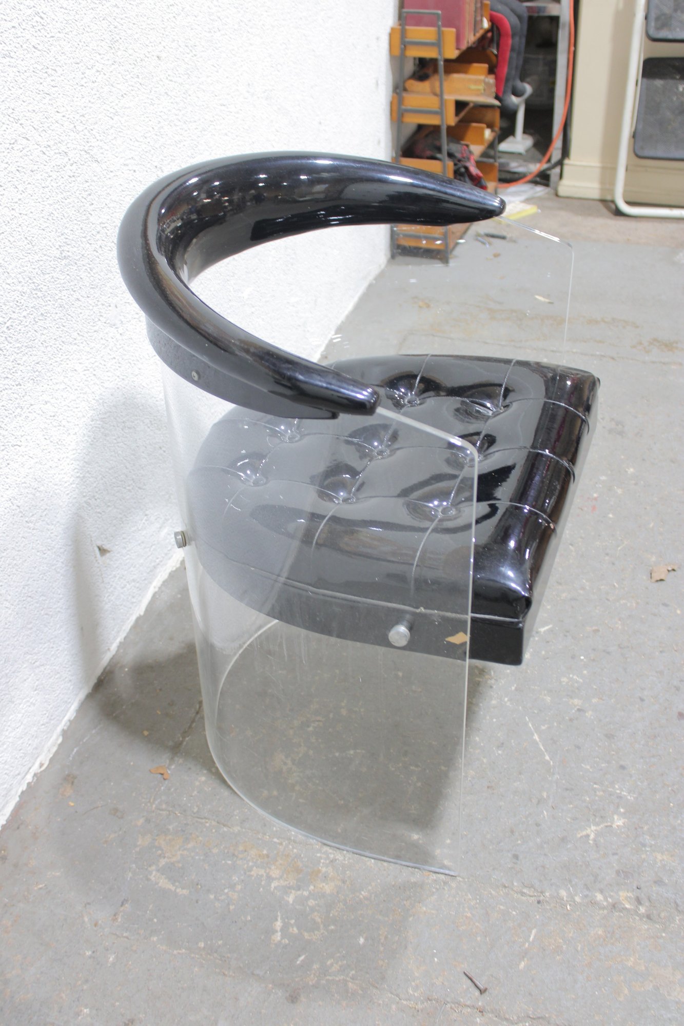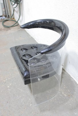 vintage lucite accent chair featuring a bold, sculptural design with a clear acrylic frame and a glossy black patent-style upholstered seat and curved armrest. The transparent lucite base gives the chair a light, floating appearance, while the dramatic curved top adds a distinctive modern edge.