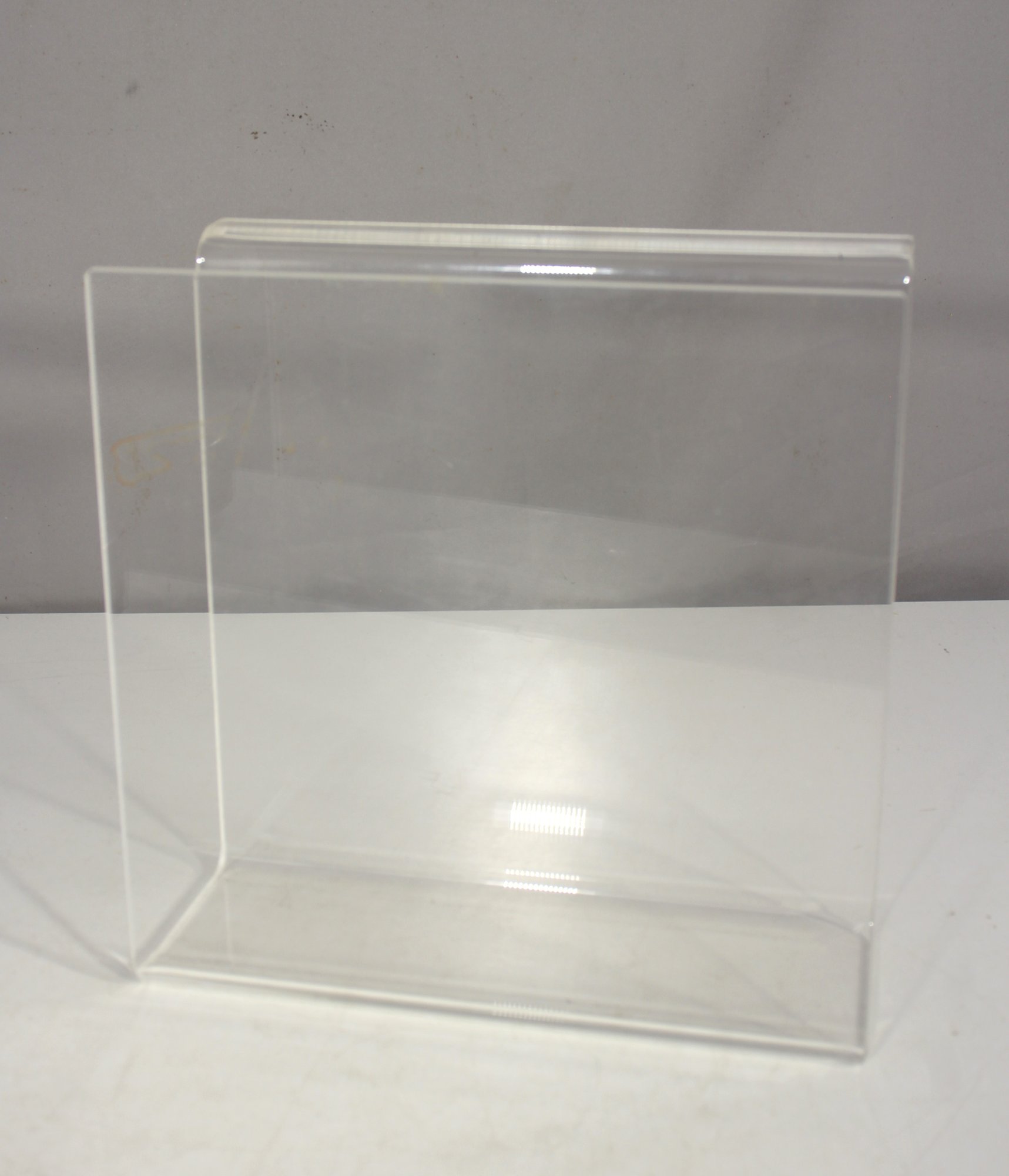 Upgrade your office or home workspace with this vintage Lucite file stand, combining functionality with a chic minimalist design. Crafted from clear acrylic, this stand features a modern, streamlined look with a gently curved top edge, perfect for organizing documents, folders, or magazines while keeping your space clutter-free.