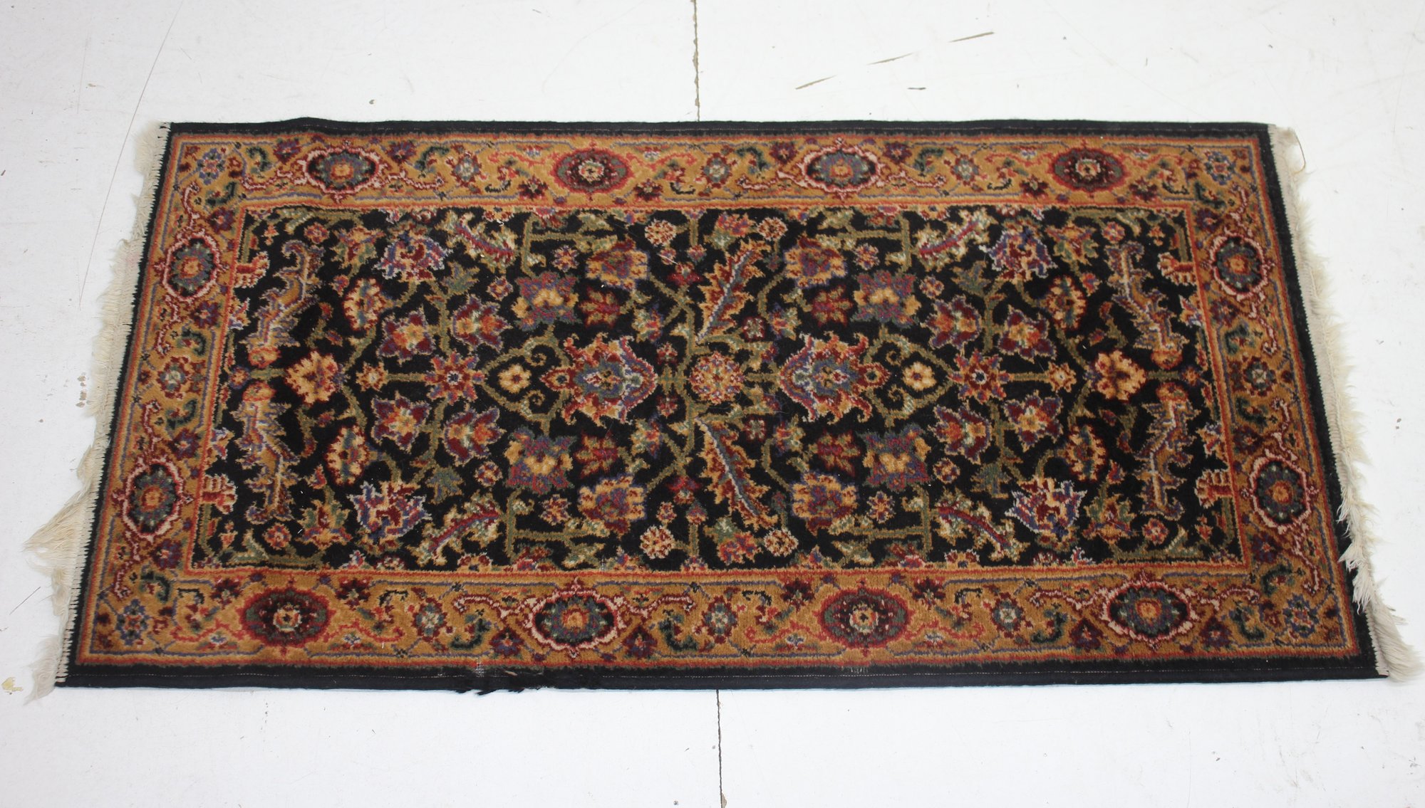 This exquisite handmade vintage Oriental rug measures approximately 47 inches by 24 inches. It features a rich black field adorned with intricate floral and vine motifs, surrounded by a detailed multi-colored border with traditional patterns. The rug showcases fine craftsmanship with vibrant colors and an elegant design, perfect for enhancing any interior space.