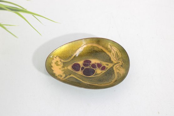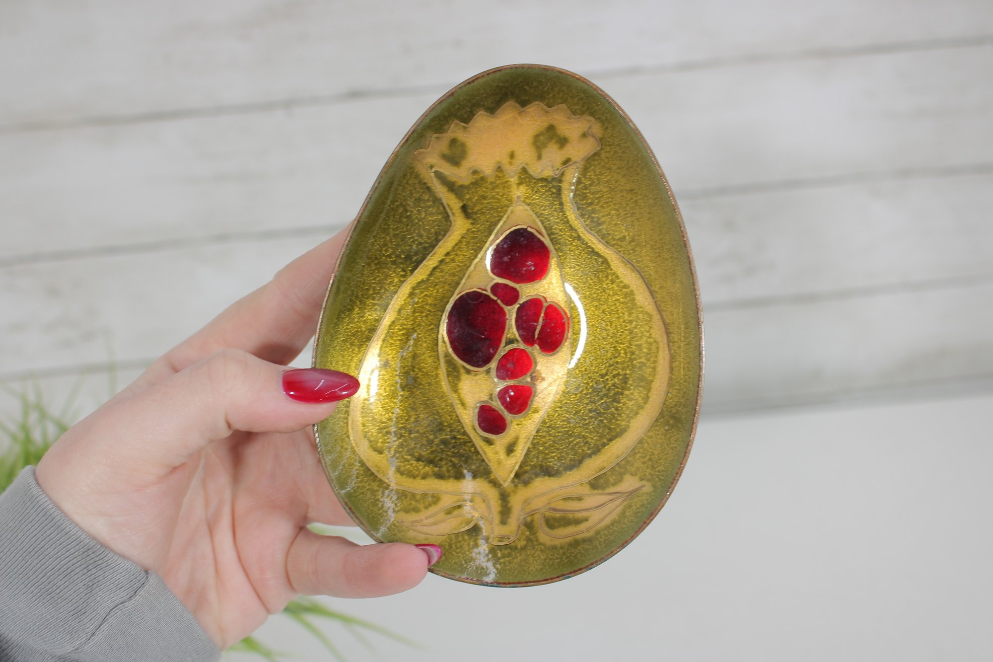 Lovely vintage enamel on copper oval bowl by Maggie Howe, dating to the 1950s. This beautifully crafted piece features a stylized pomegranate motif in rich red tones set against a warm golden interior, symbolizing abundance and classic mid-century design aesthetics. The exterior is finished in a soft turquoise enamel, creating a striking contrast.