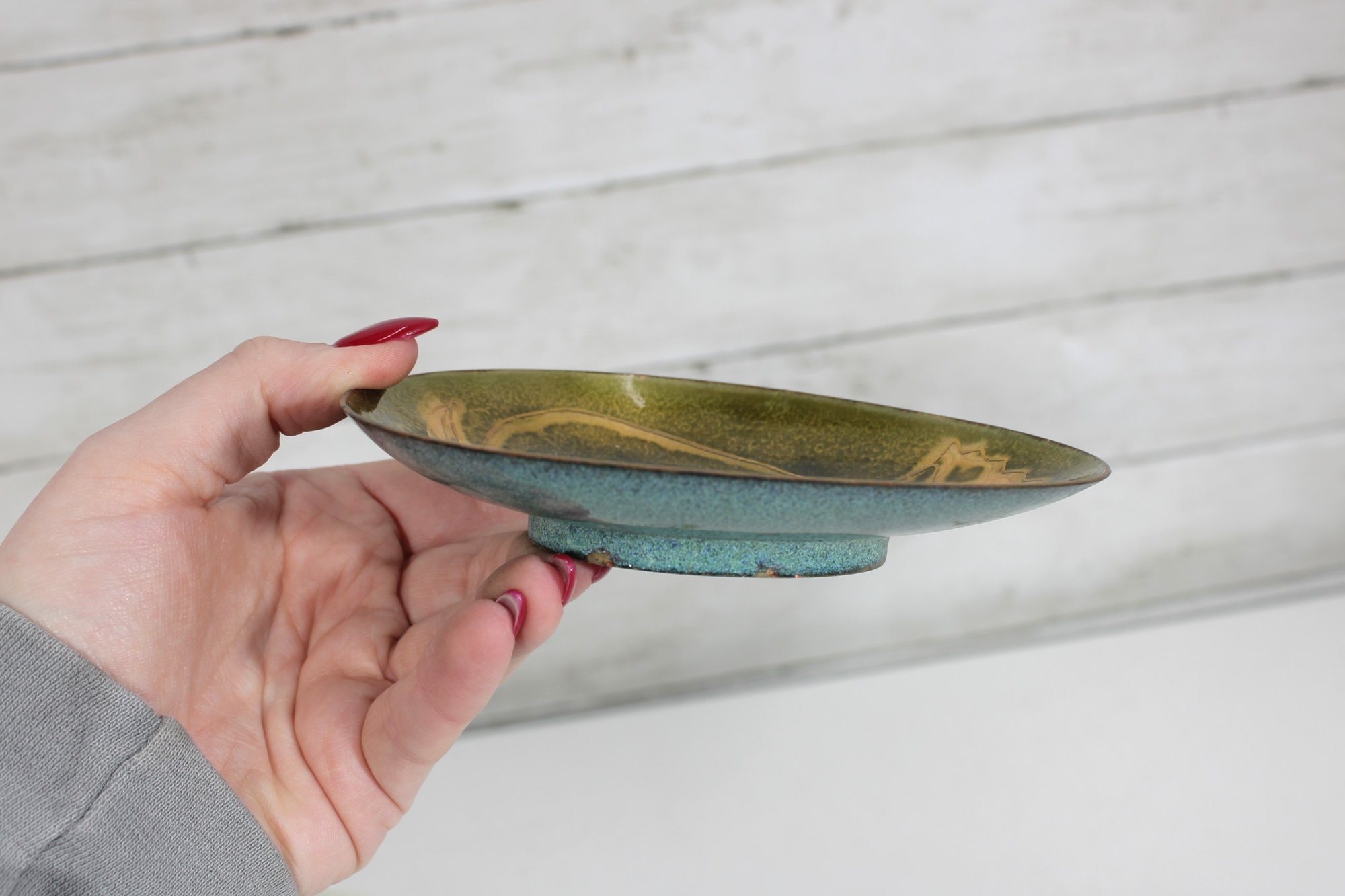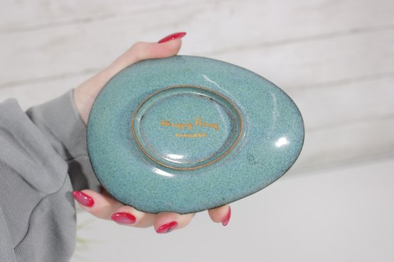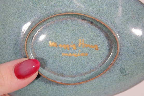 The underside is signed “Maggie Howe” along with “handmade,” confirming its authenticity and artisan quality. Its elegant oval shape and compact size make it perfect as a trinket dish, catchall, or decorative display piece.
