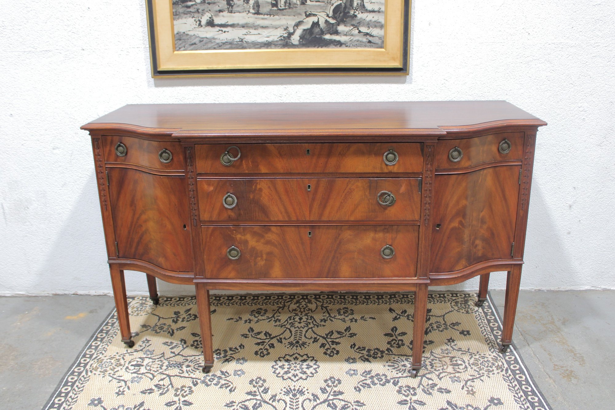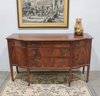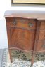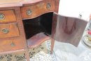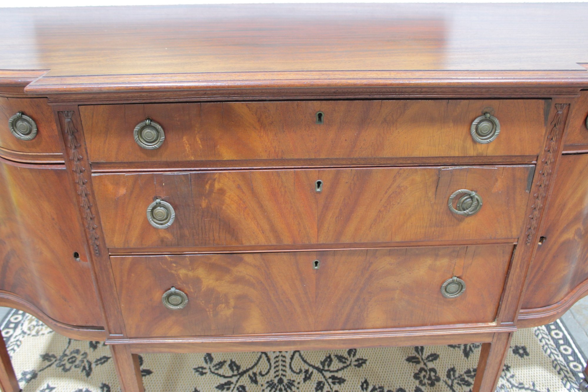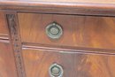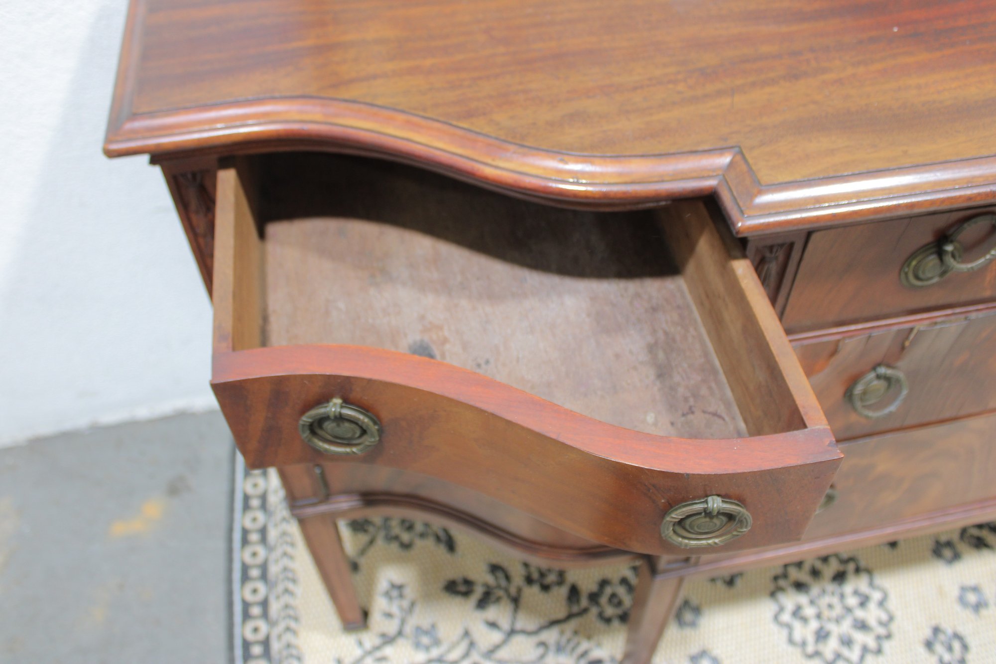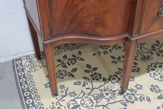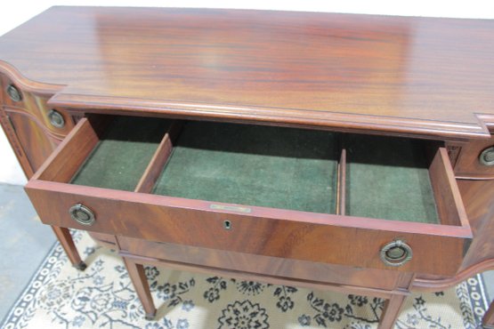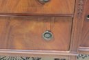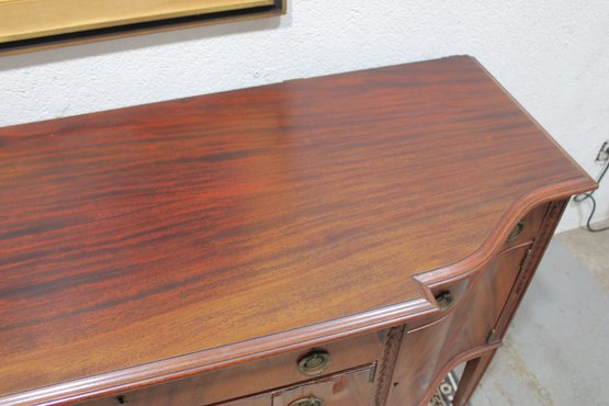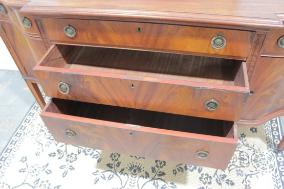 vintage mahogany sideboard or buffet server, showcasing elegant traditional styling and fine wood craftsmanship. This piece features rich mahogany tones with striking veneer grain patterns, gracefully curved drawer fronts, and classic brass hardware.