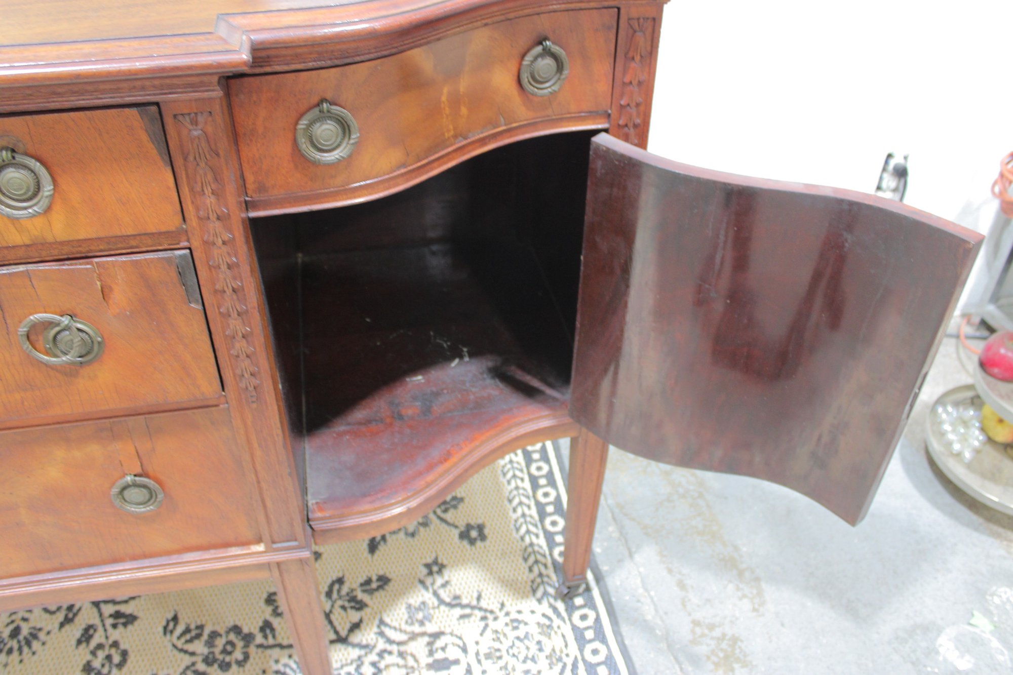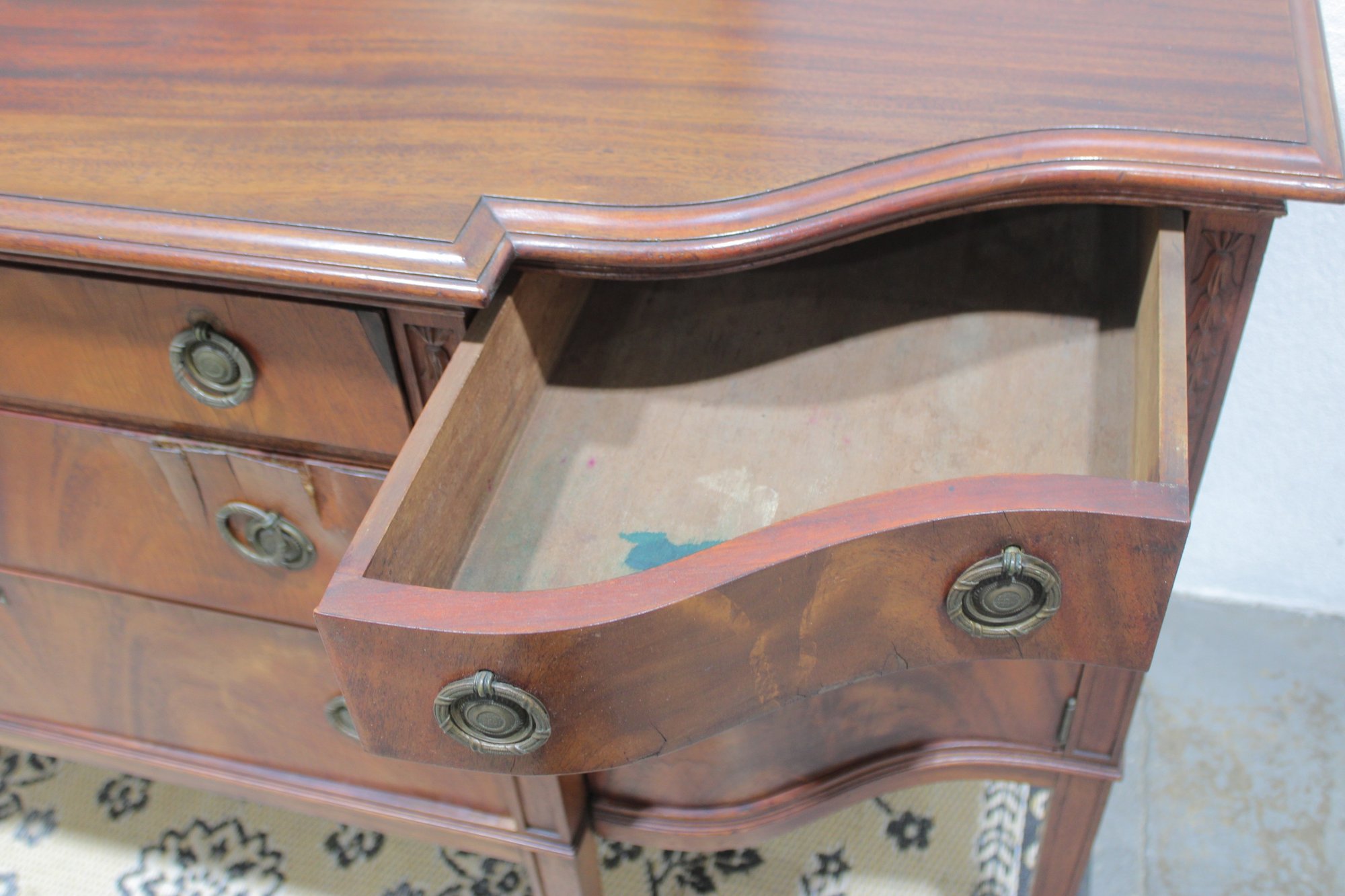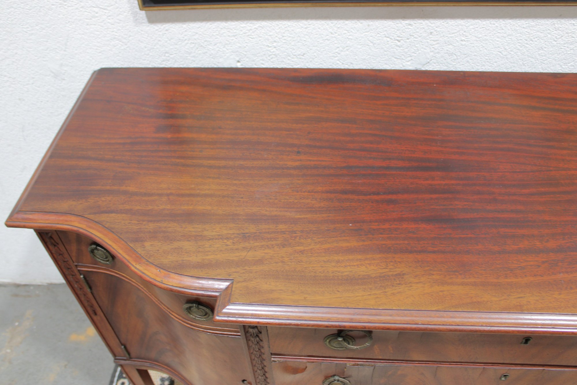 vintage mahogany sideboard or buffet server, showcasing elegant traditional styling and fine wood craftsmanship. This piece features rich mahogany tones with striking veneer grain patterns, gracefully curved drawer fronts, and classic brass hardware.