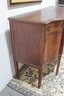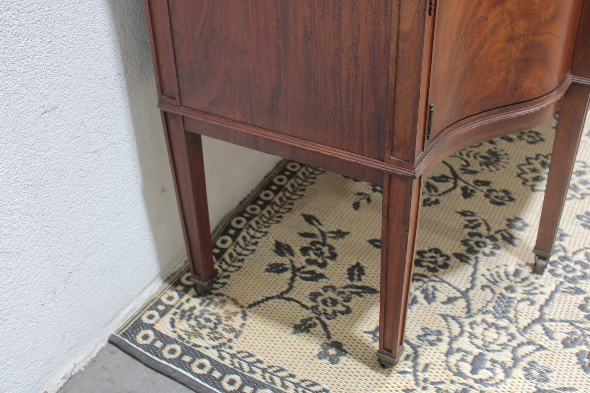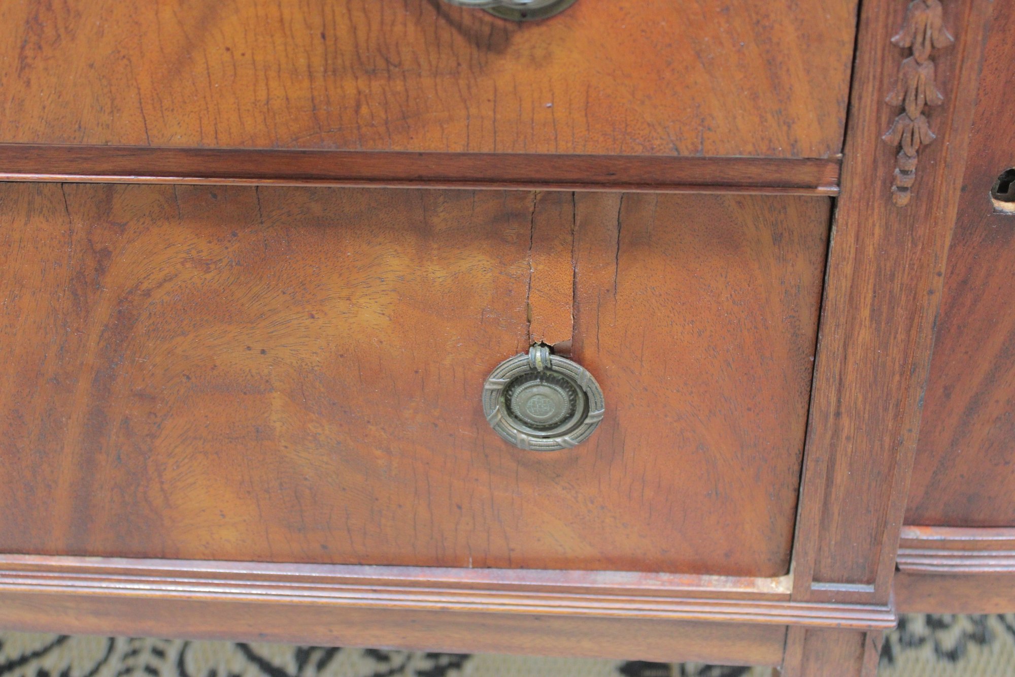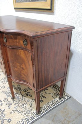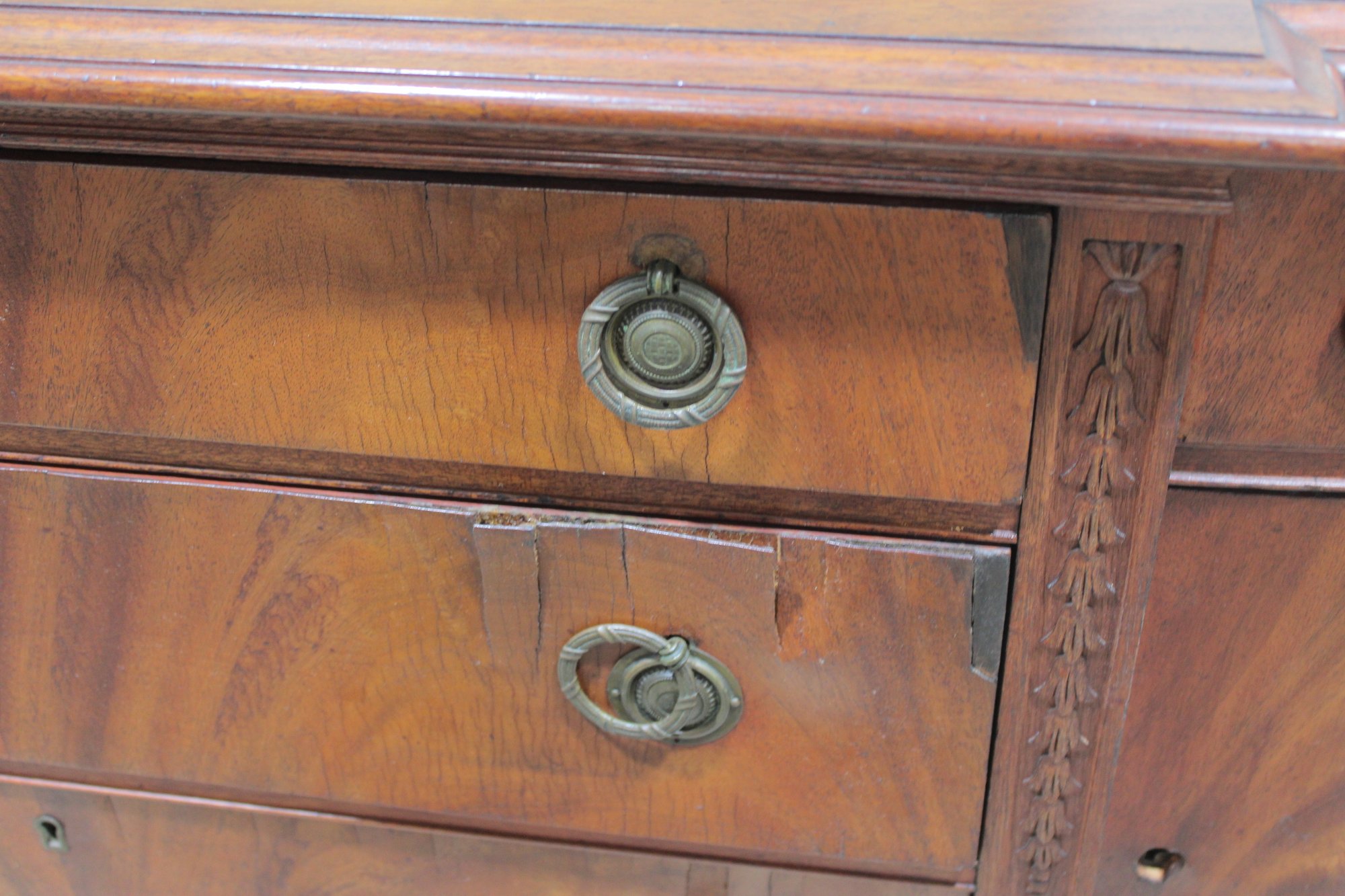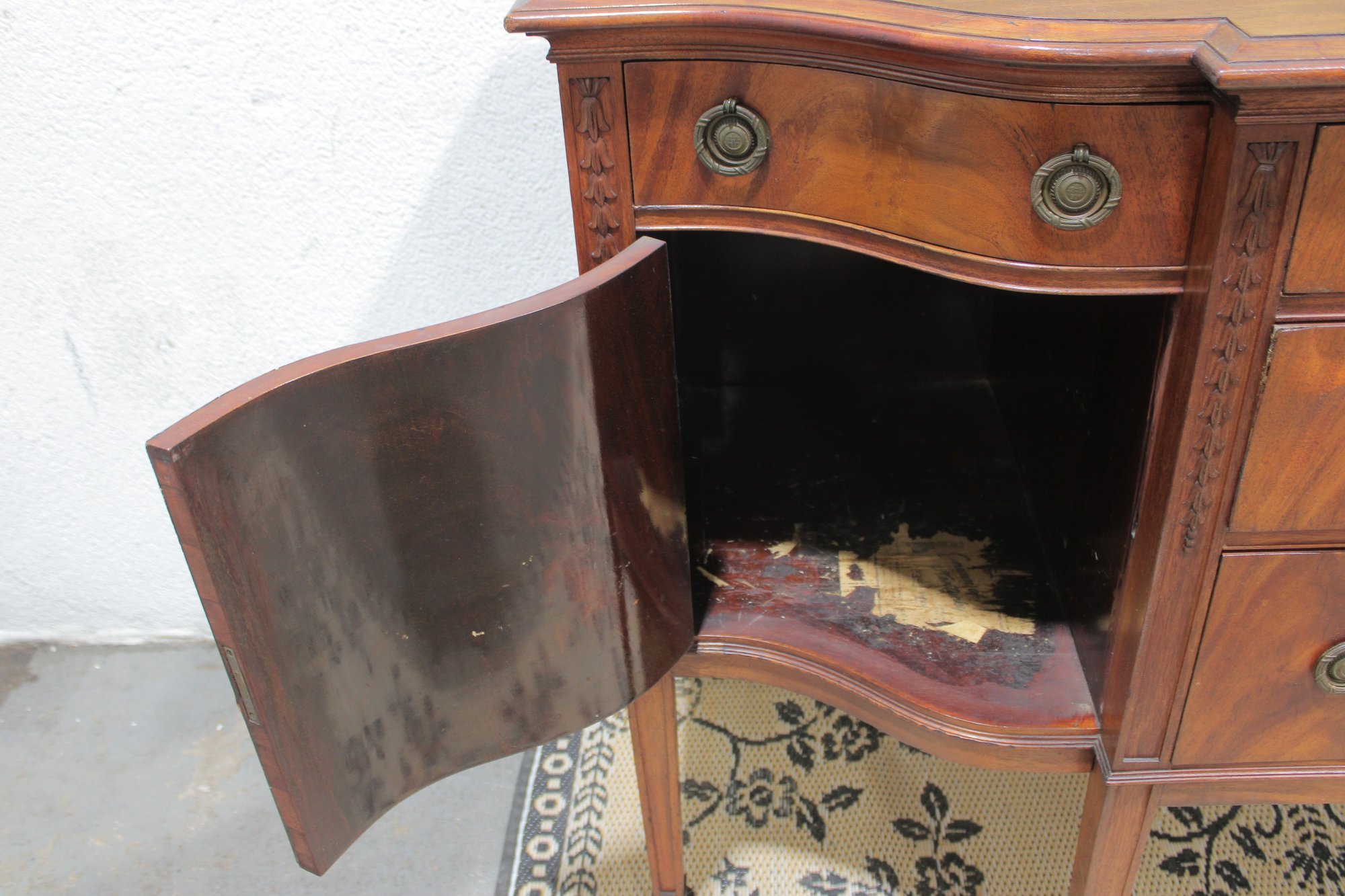 vintage mahogany sideboard or buffet server, showcasing elegant traditional styling and fine wood craftsmanship. This piece features rich mahogany tones with striking veneer grain patterns, gracefully curved drawer fronts, and classic brass hardware.