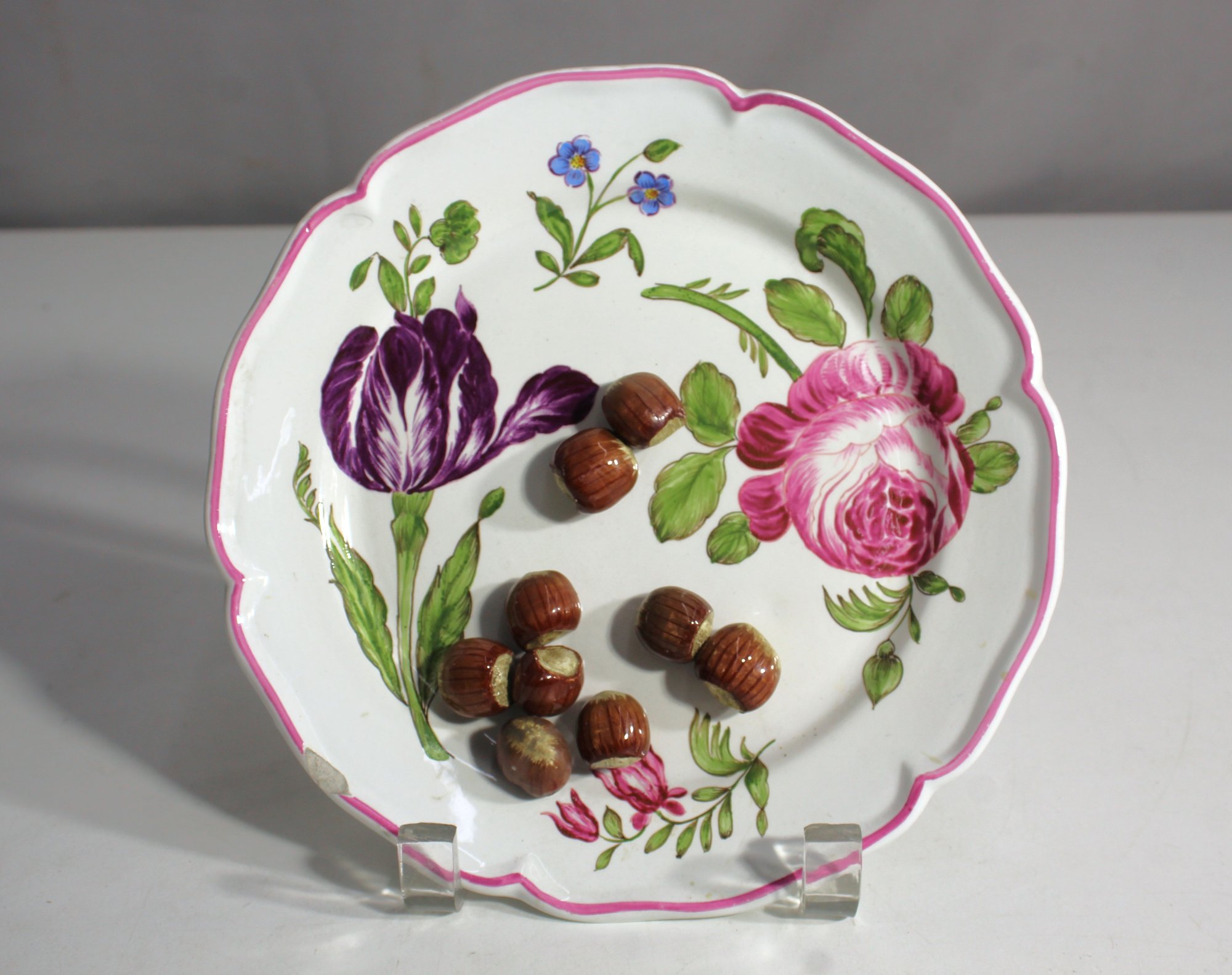 This beautiful vintage Majolica plate features hand-painted floral designs with vivid purple and pink flowers, along with finely sculpted hazelnuts, creating a charming and rustic presentation. The plate is adorned with a scalloped edge outlined in pink, adding to its decorative appeal.