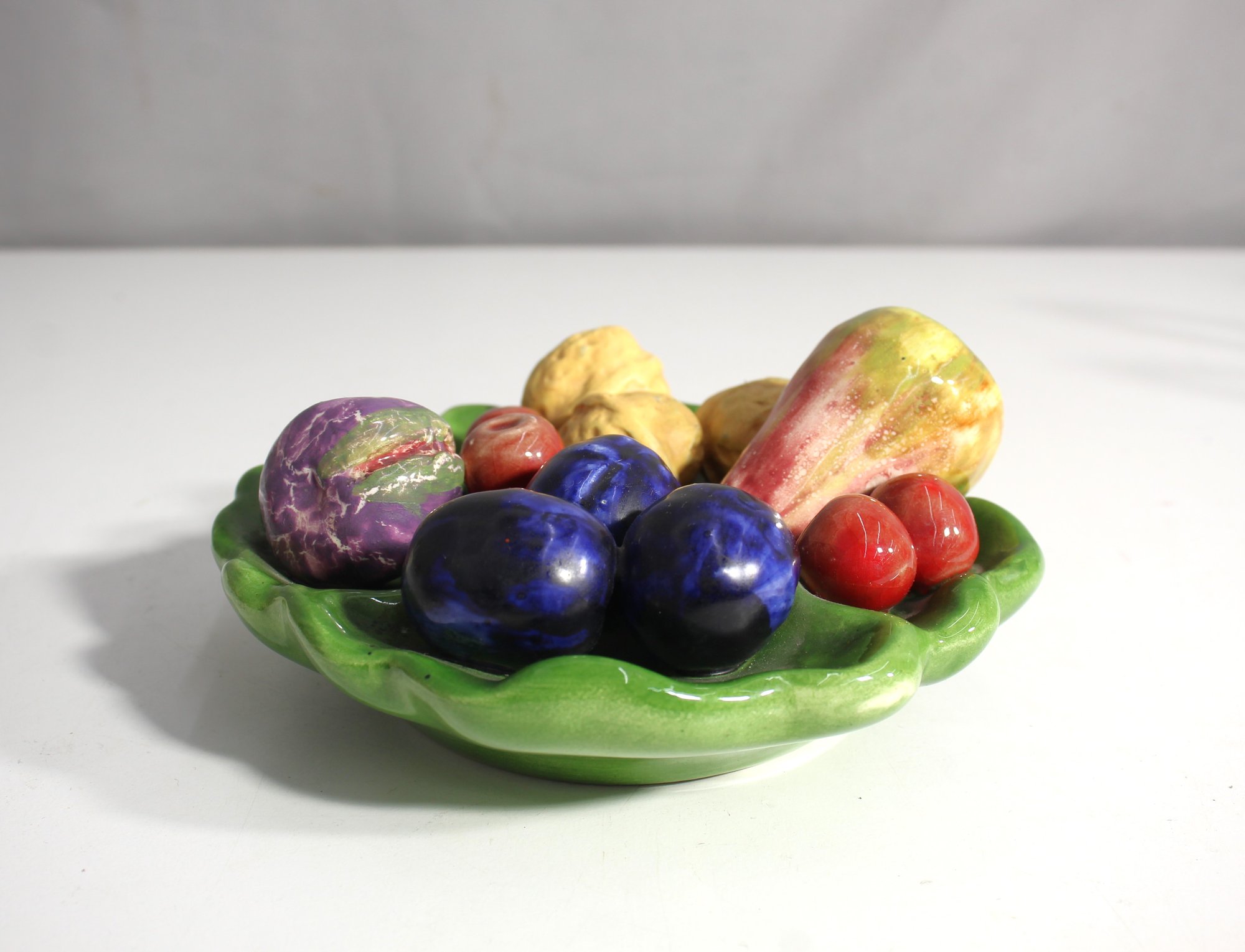 This delightful vintage Majolica-style fruit basket plate features a vibrant assortment of sculpted fruits, including figs, walnuts, plums, and cherries, all arranged on a green leafy base. The realistic detailing and bright colors make this piece a cheerful addition to any kitchen or dining room.
