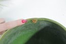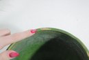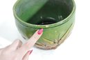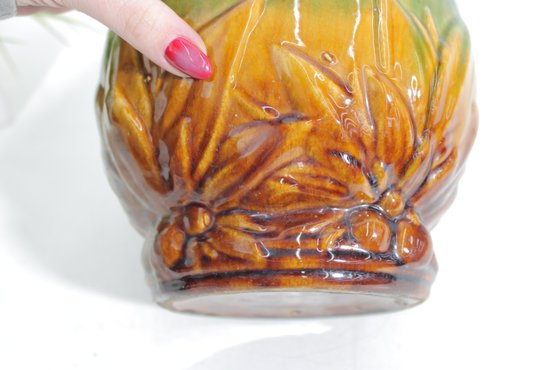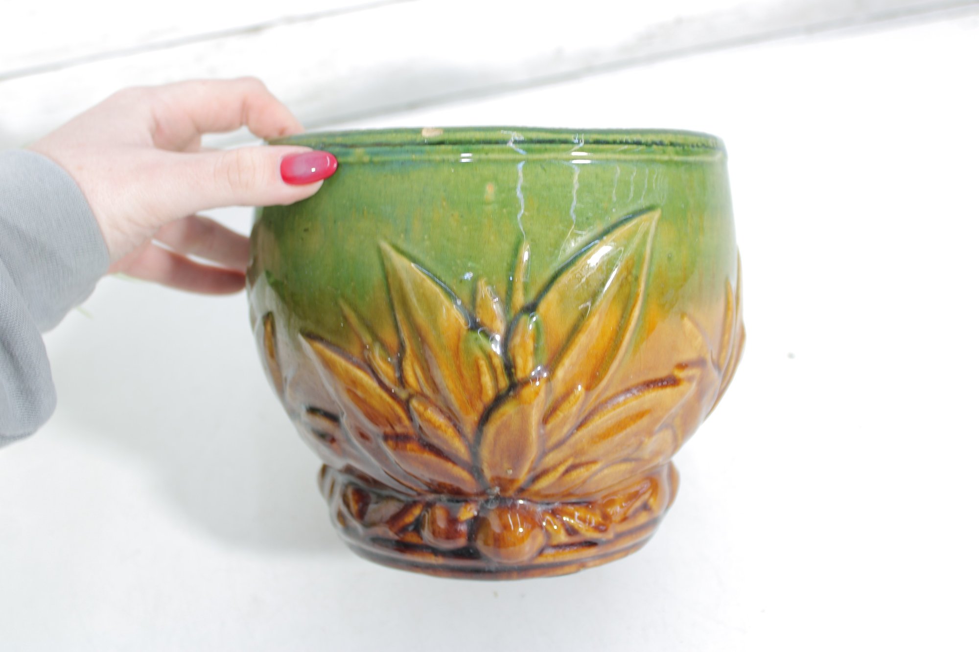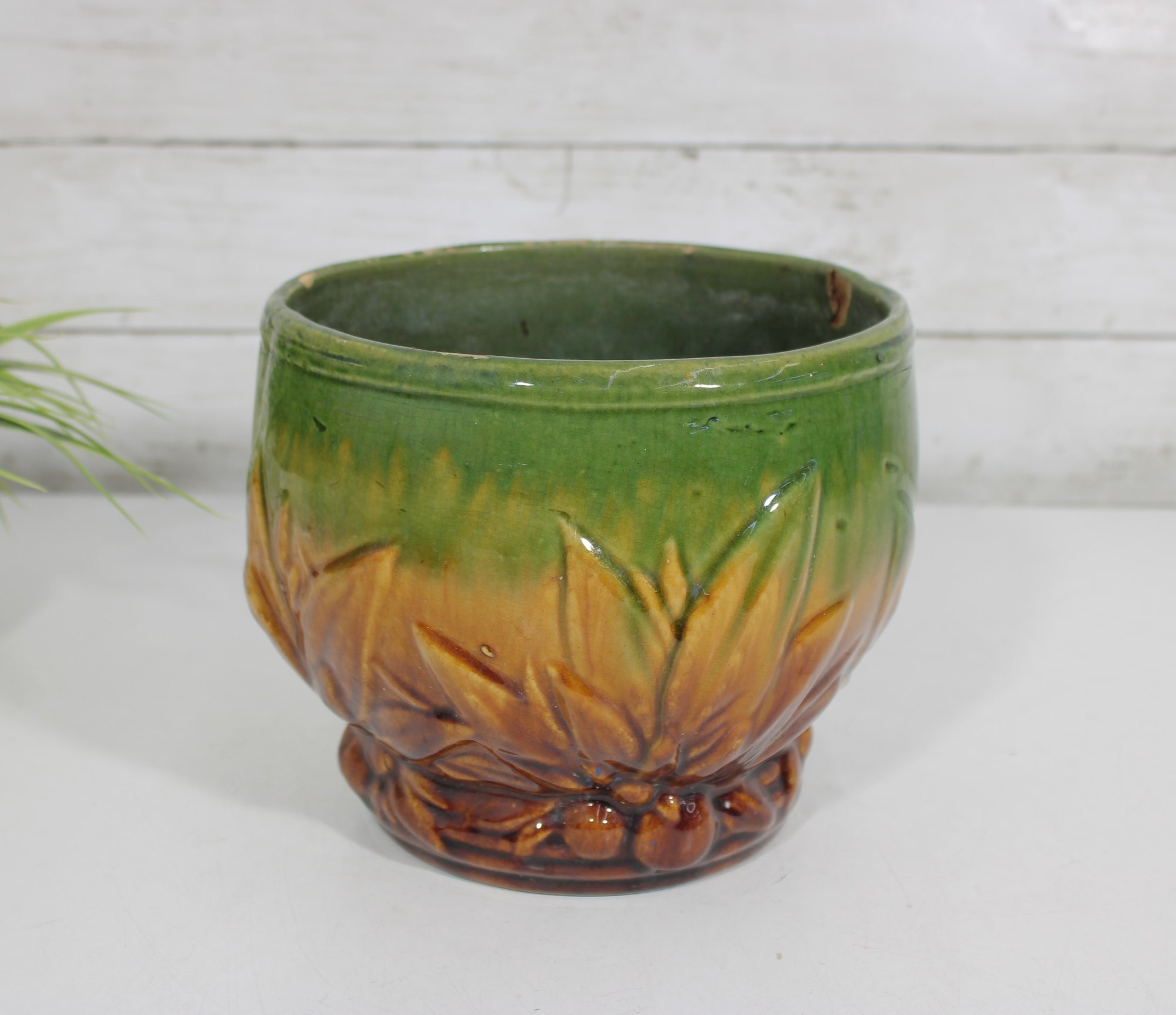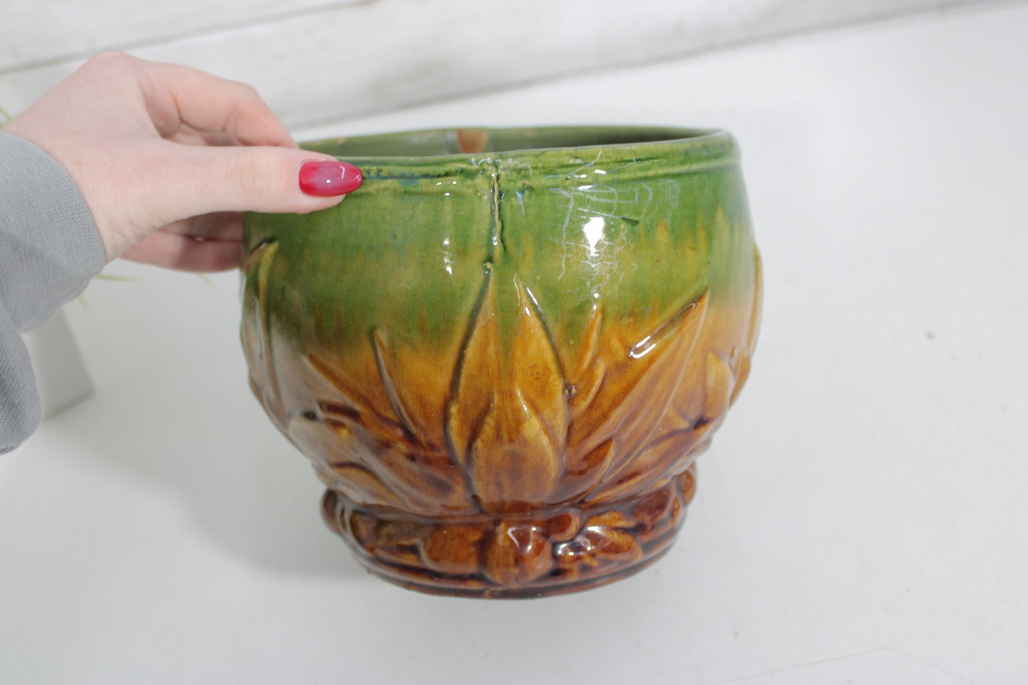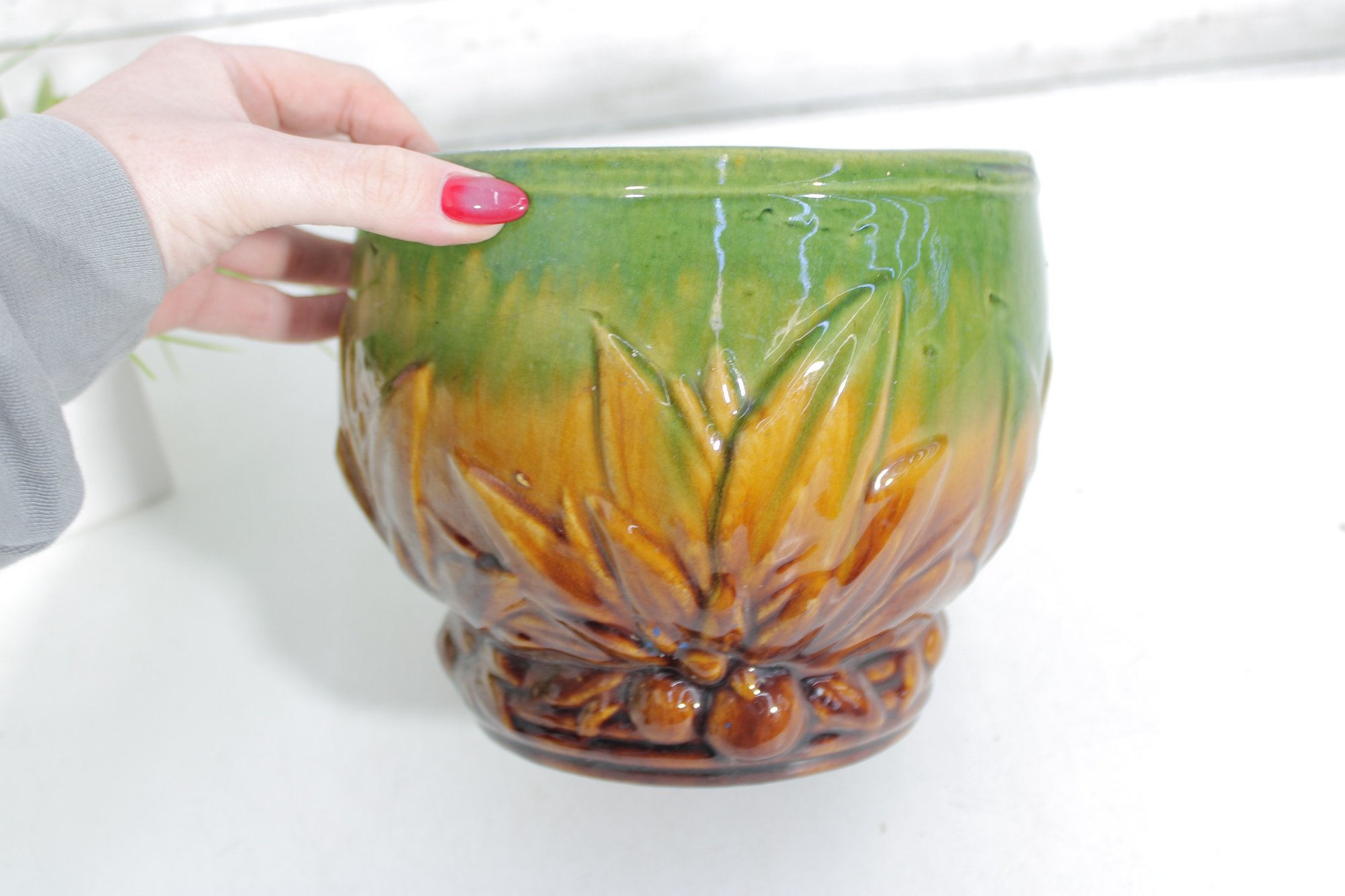 Beautiful vintage majolica jardinière planter featuring a rich, nature-inspired glaze in deep green and warm amber tones. The exterior showcases a raised leaf motif with textured detailing, giving it a classic, organic look typical of majolica pottery.