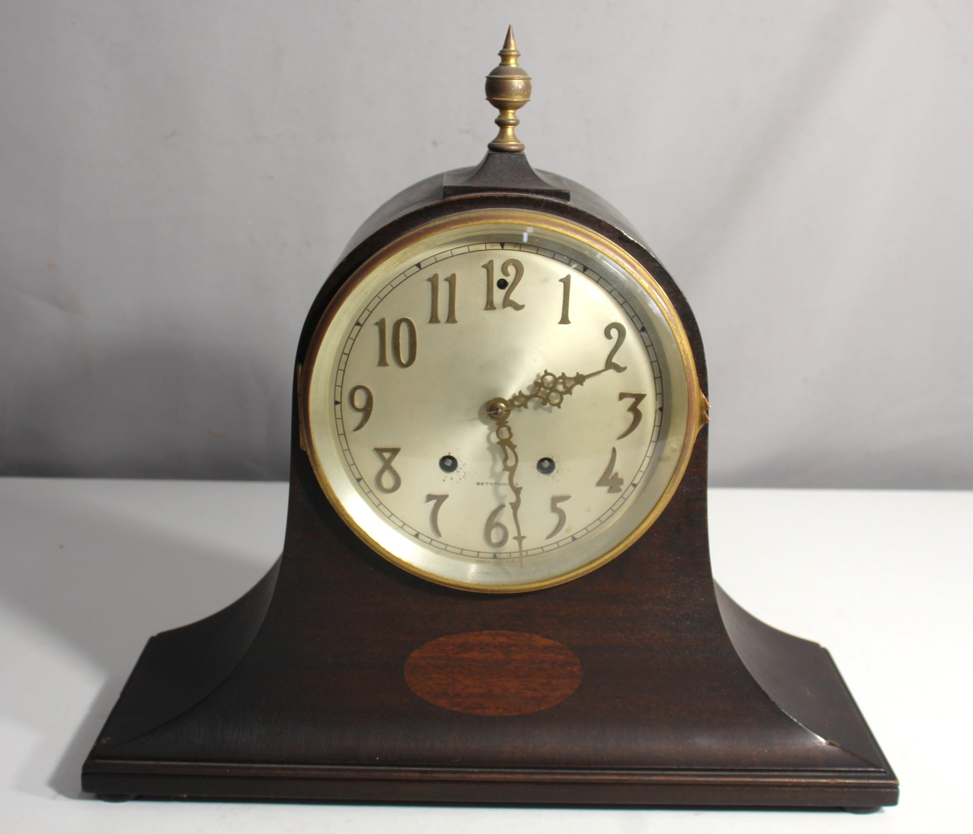 This elegant vintage mantel clock features a wood casing with brass accents and a decorative finial on top. The clock includes its original winding key. The interior mechanism appears intact, but the clock is untested and sold as-is. Please review the provided images for a closer look at the clock's details and condition, including the face, hands, and movement. Ideal for collectors or as a restoration project.