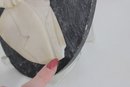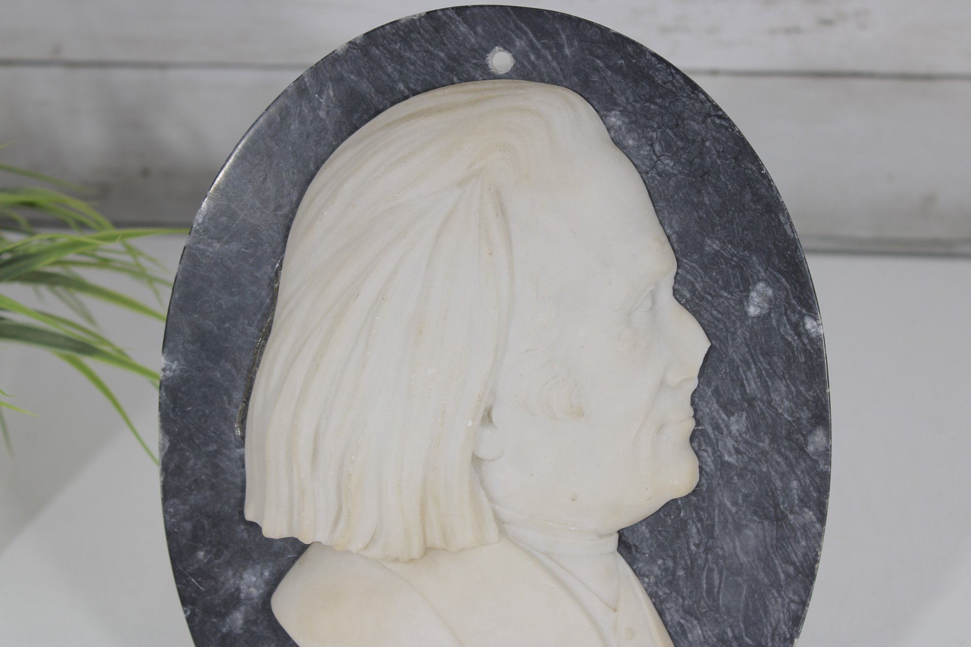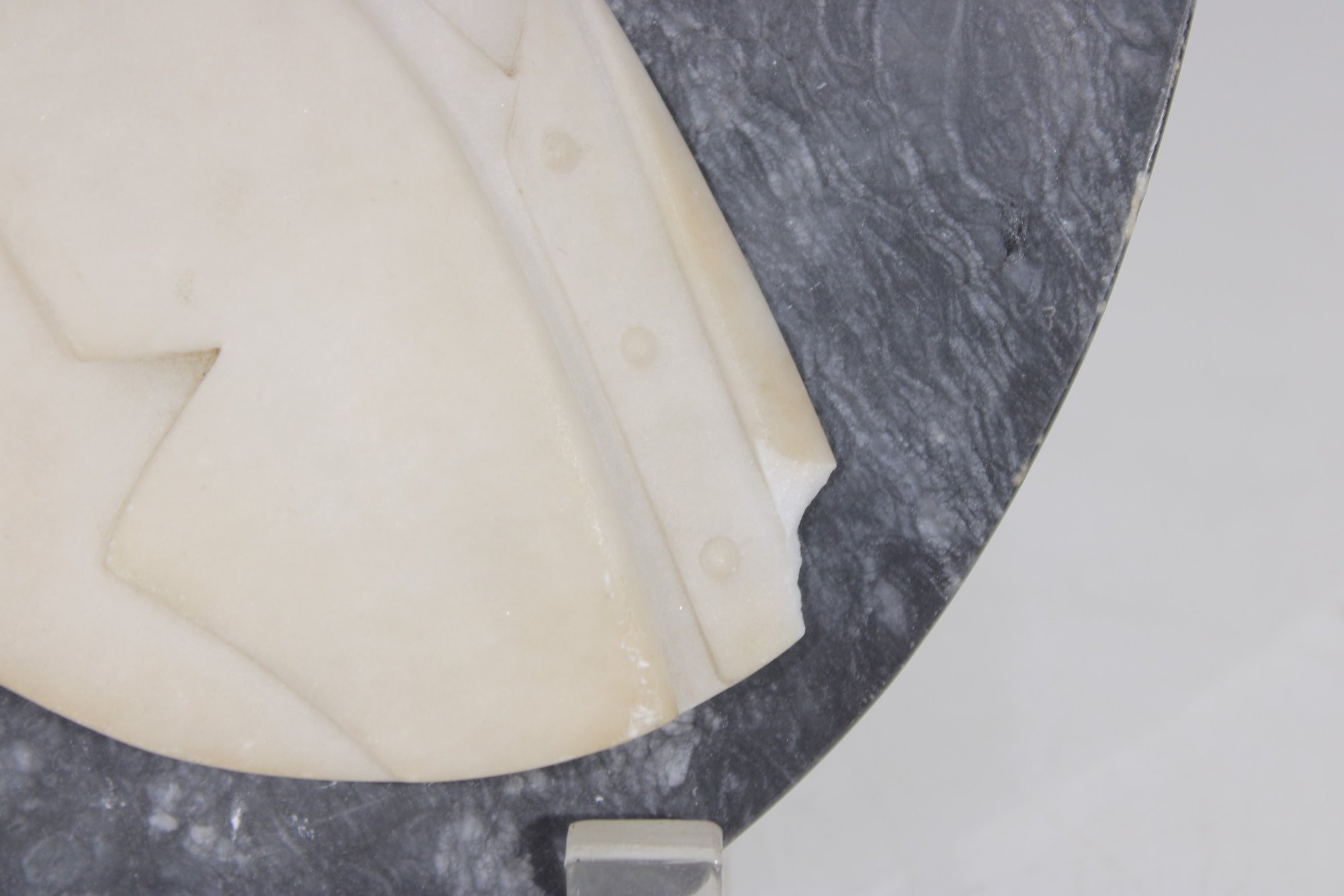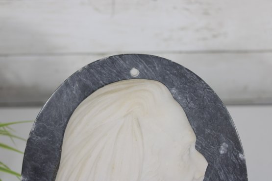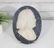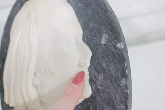 Vintage marble relief portrait plaque featuring the profile of a gentleman carved in light stone and mounted on an oval dark marble backing. The piece displays a classic cameo-style design with detailed carving of the figure’s hair, facial features, and clothing.