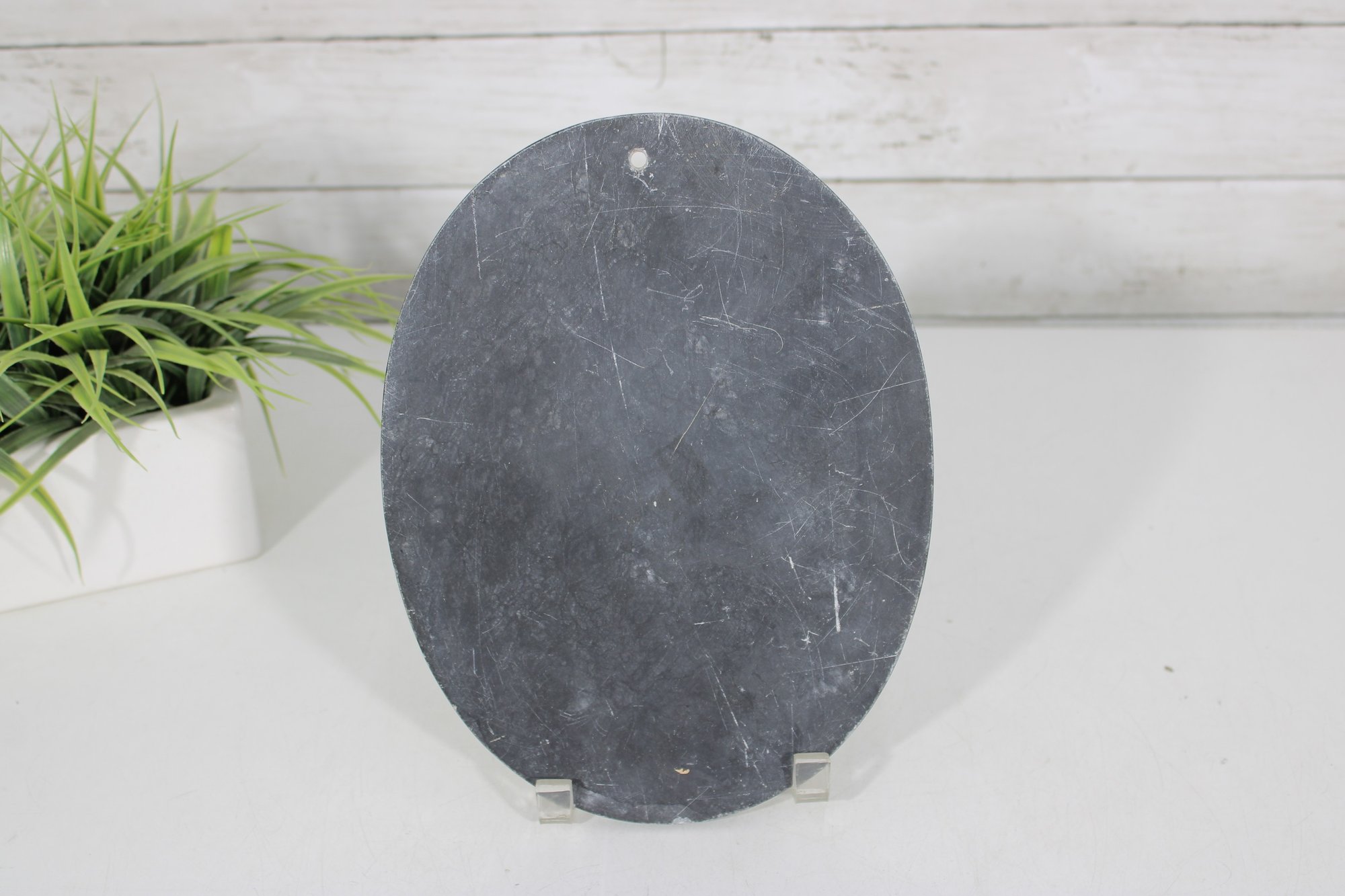 The contrast between the light relief carving and darker marble background gives the plaque a striking decorative appearance. A small hole at the top allows it to be displayed on a wall.