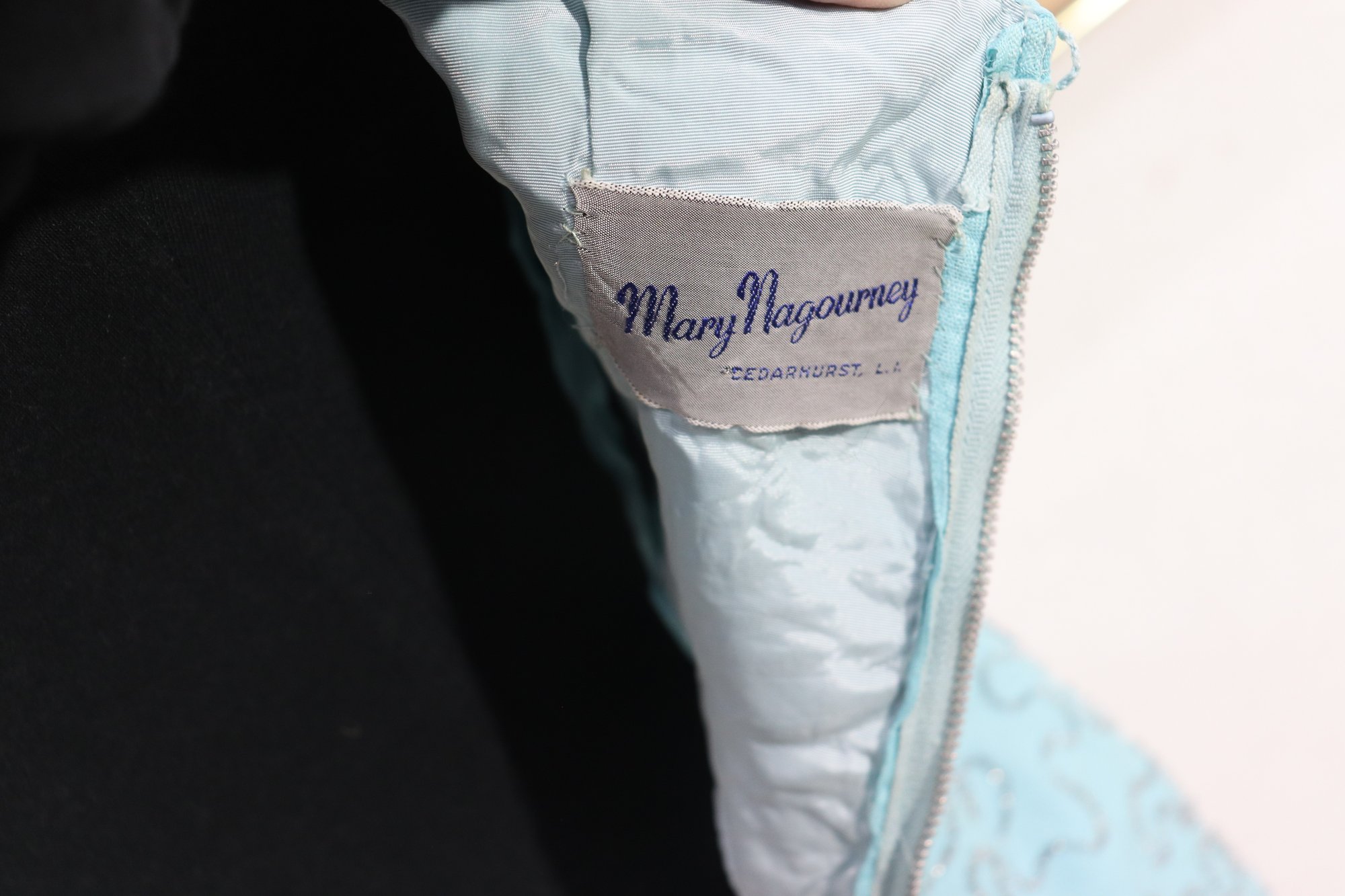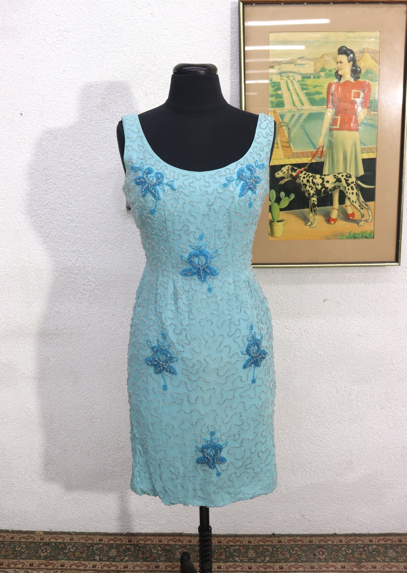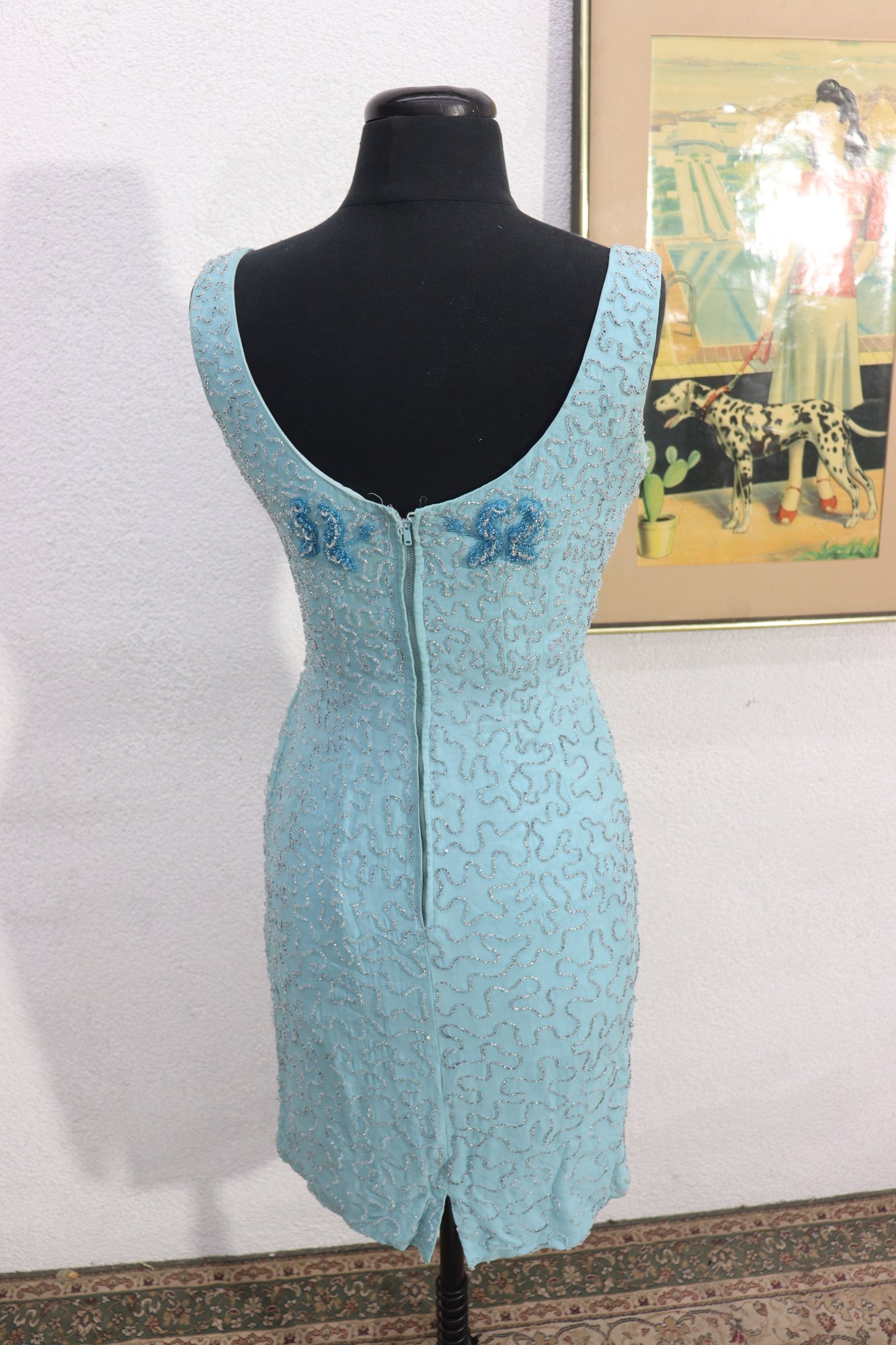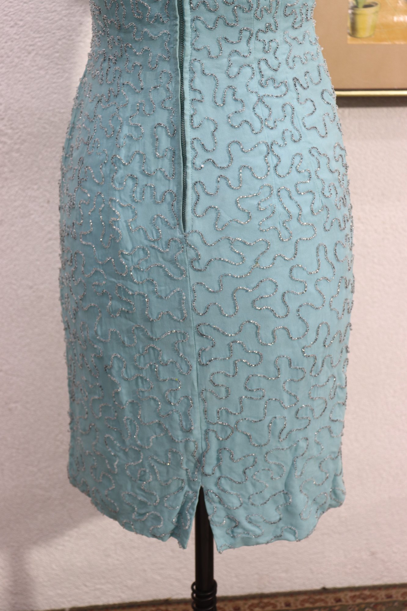 Finished with a back zipper closure and fully lined interior for structure and comfort. A beautiful choice for cocktail events, vintage-inspired occasions, or collectors of mid-century fashion.