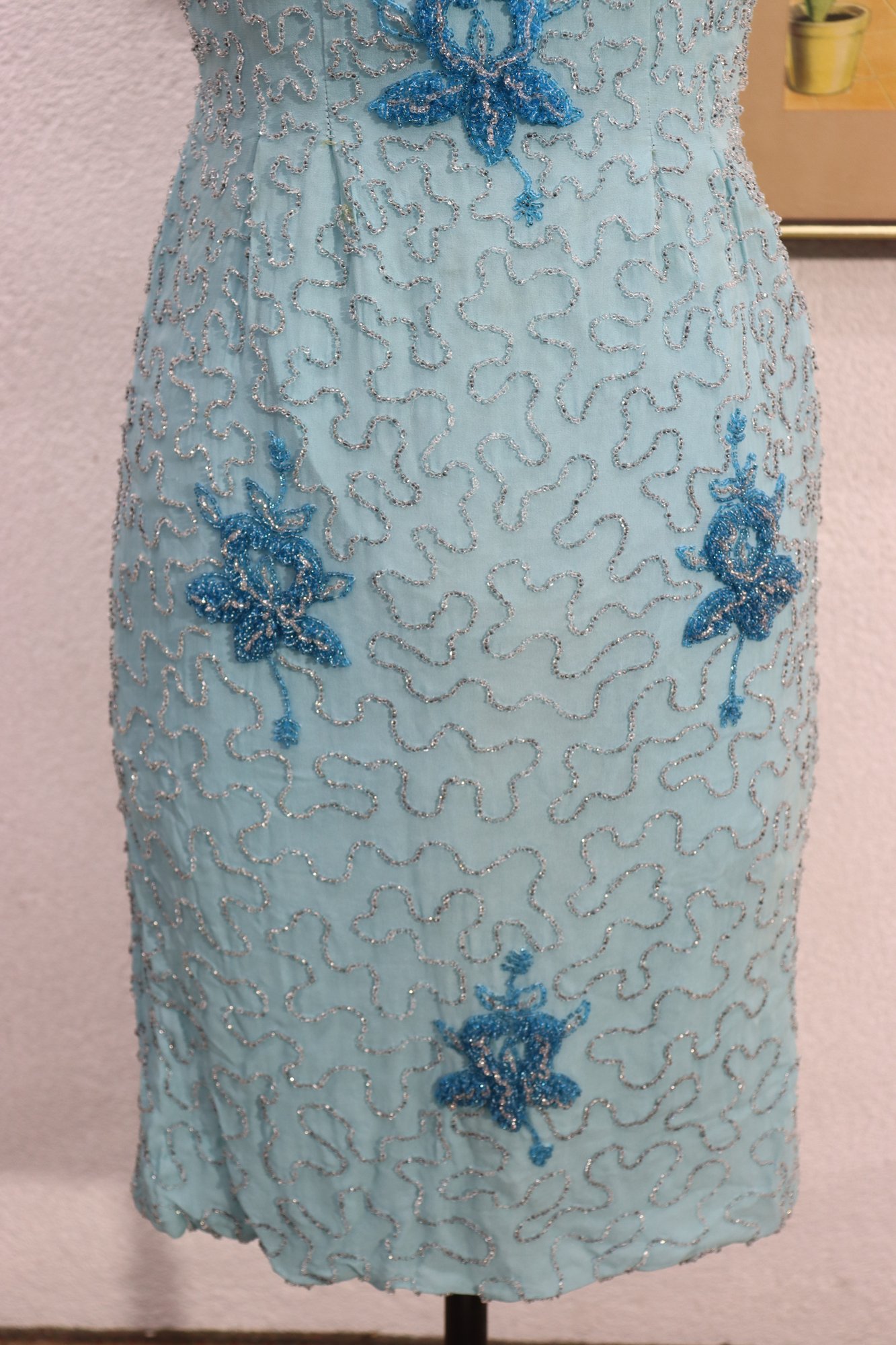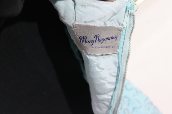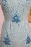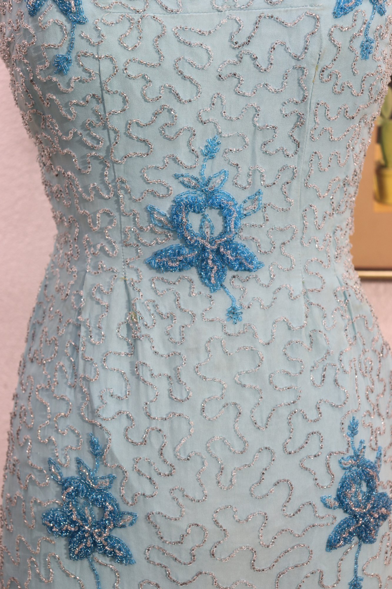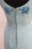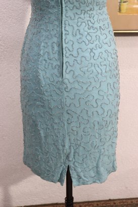 vintage cocktail dress by Mary Magnin, crafted in a soft powder blue with intricate allover beadwork. The dress features delicate floral bead motifs set against a swirling beaded background, giving it wonderful texture and visual depth. Designed in a classic sleeveless sheath silhouette with a graceful scoop neckline, this piece offers timeless vintage sophistication.
