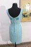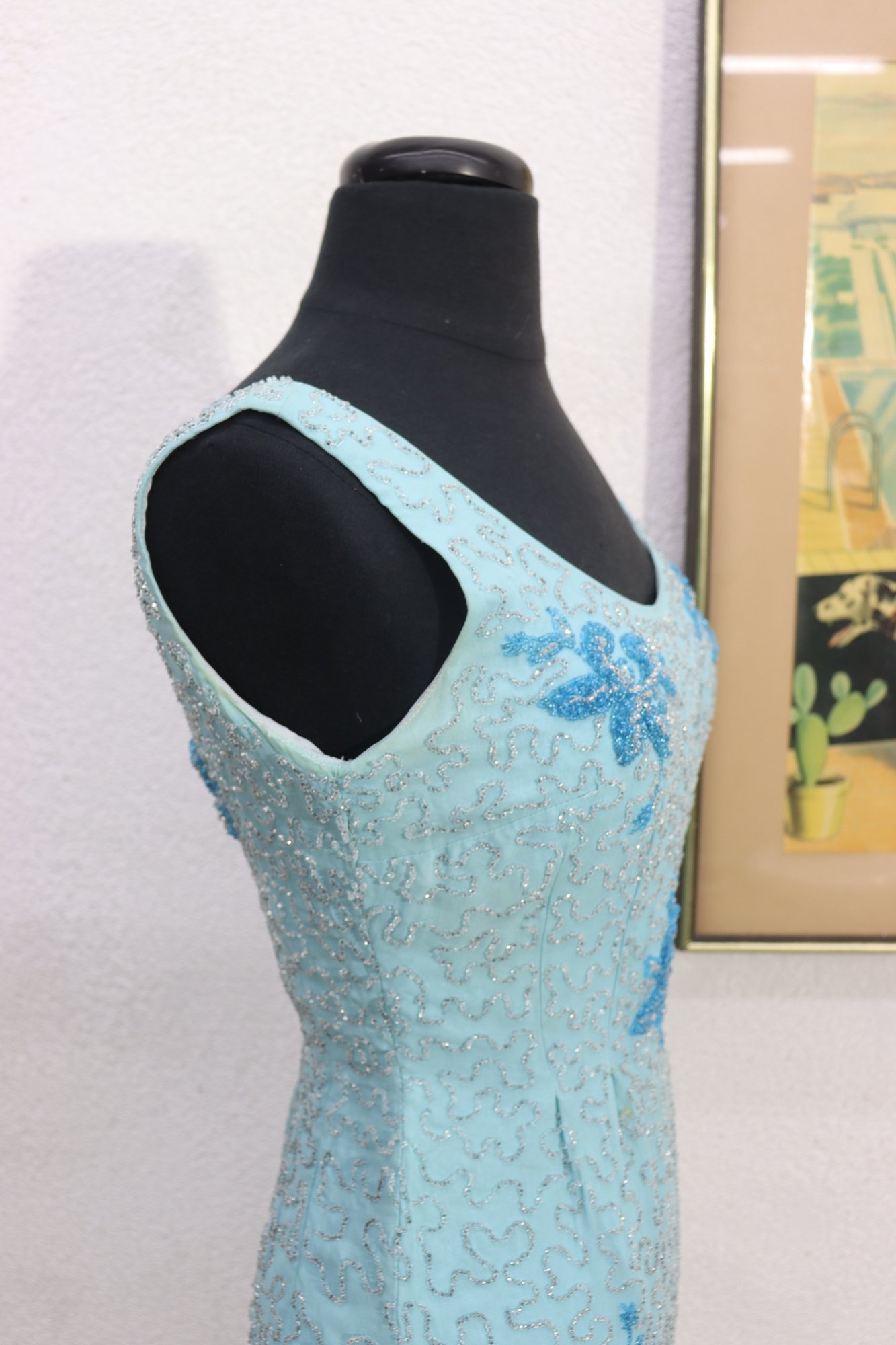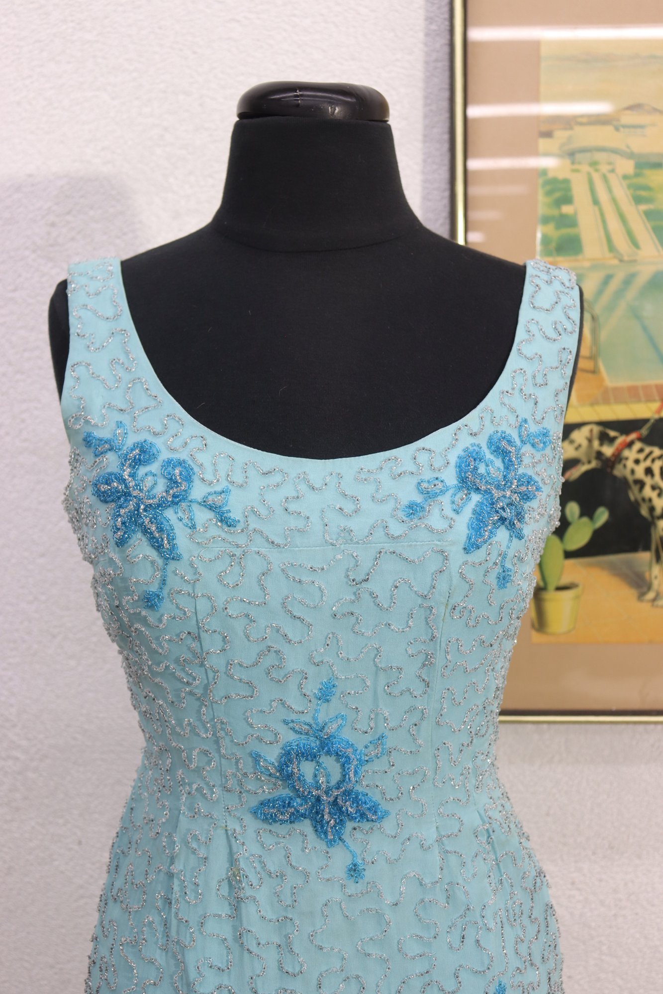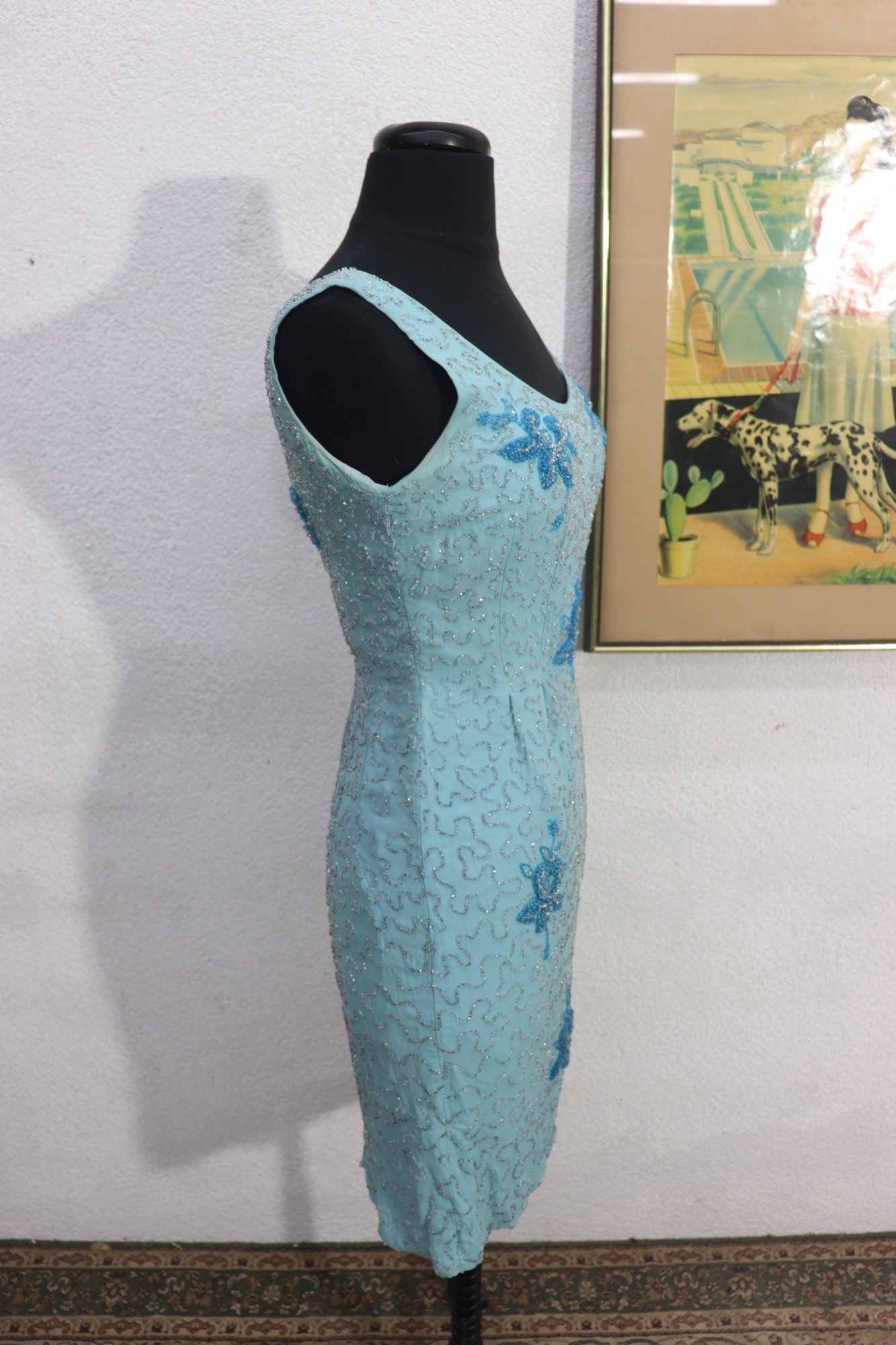 vintage cocktail dress by Mary Magnin, crafted in a soft powder blue with intricate allover beadwork. The dress features delicate floral bead motifs set against a swirling beaded background, giving it wonderful texture and visual depth. Designed in a classic sleeveless sheath silhouette with a graceful scoop neckline, this piece offers timeless vintage sophistication.
