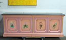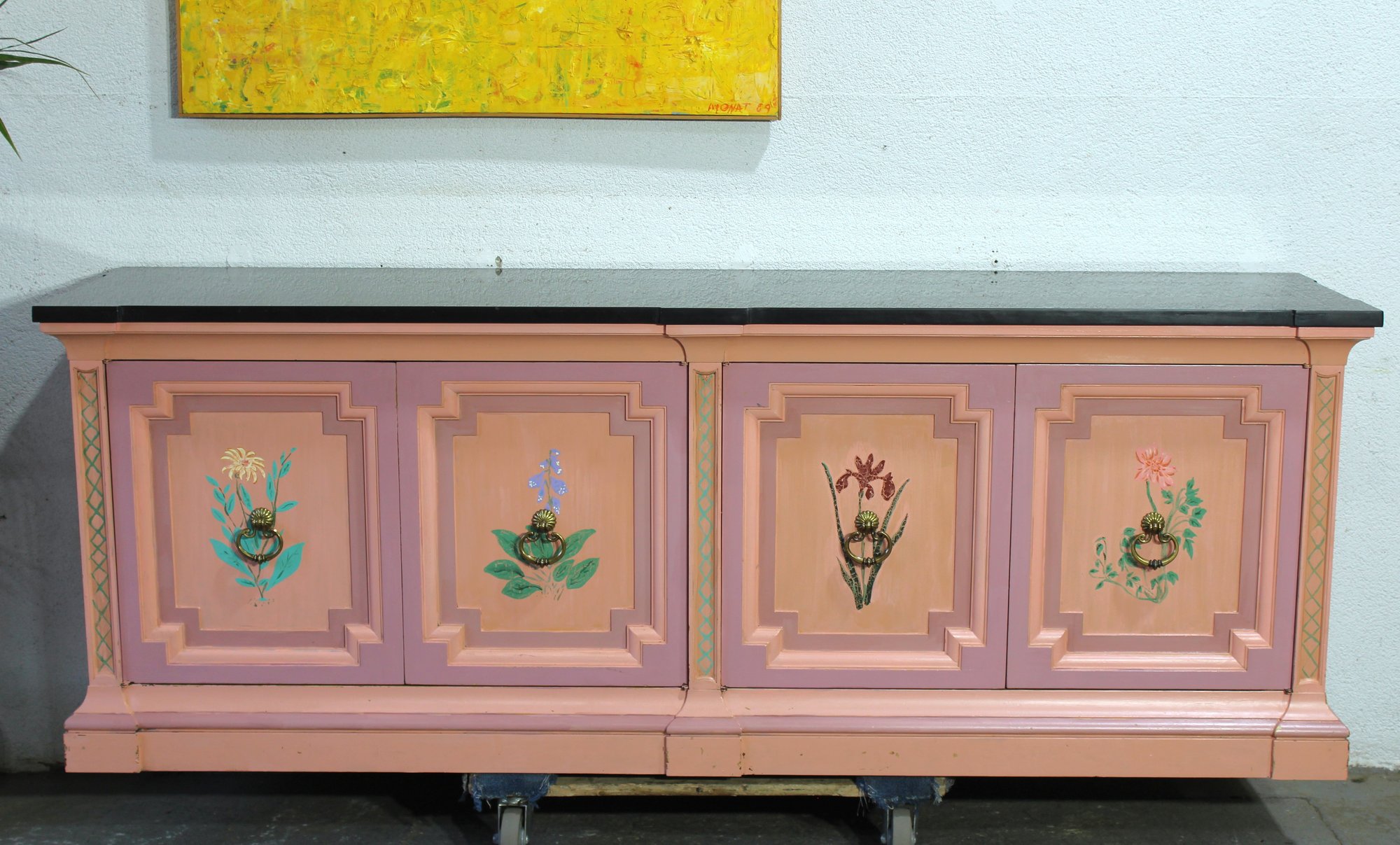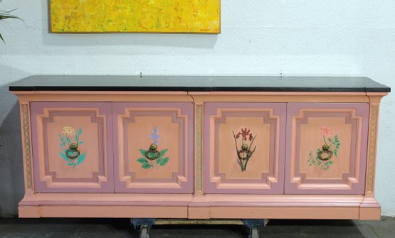 This charming vintage sideboard features a striking pink painted finish with beautifully hand-painted floral designs on each of its four panels. The piece is topped with a sleek black marble surface, offering a luxurious contrast to the pastel tones. The sideboard offers ample storage behind its detailed doors and is perfect for adding a pop of color and vintage elegance to any room. Ideal for use in a dining room, living area, or as a decorative accent piece.