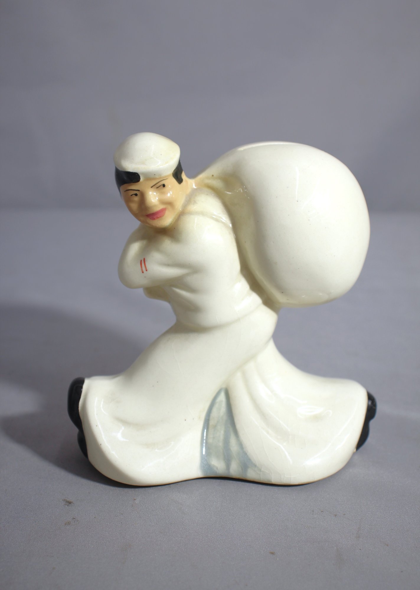 Set sail with this charming Vintage McCoy Pottery Sailor Coin Piggy Bank, a delightful addition to any collection. This unique piece features a whimsical sailor figurine, crafted with attention to detail, from the joyful expression to the dynamic pose as he carries a large sack over his shoulder. The sailor is dressed in a traditional white uniform, complete with a sailor cap, adding a nostalgic touch to the design. This piggy bank is not only a decorative item but also a functional piece for saving your coins. It stands at approximately 7 inches tall and shows some signs of age, including minor surface wear