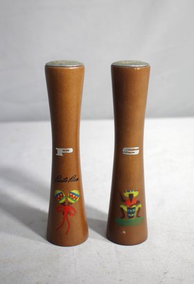 pair of vintage mid-century modern (MCM) wooden salt and pepper shakers with a unique Puerto Rico theme. These elegant shakers are designed in the Danish style, featuring sleek, tapered bodies and adorned with colorful hand-painted designs that reflect the vibrant culture of Puerto Rico.