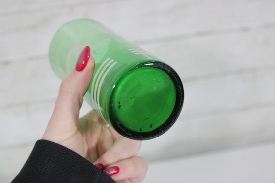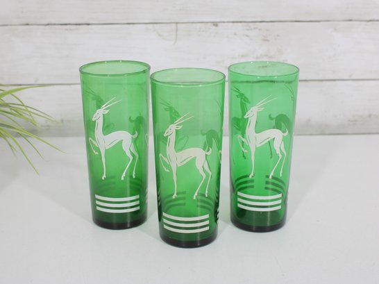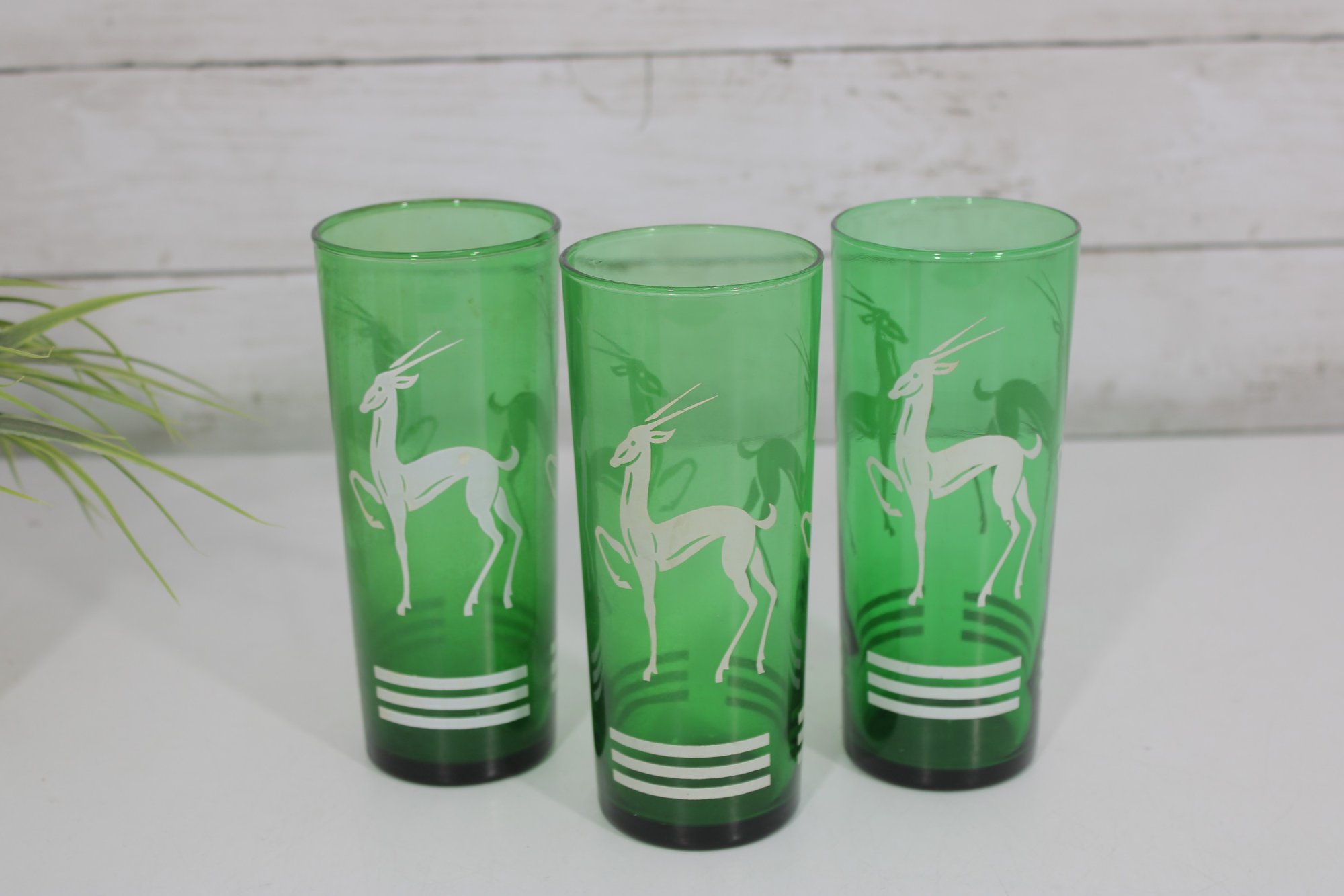 set of 3 vintage mid-century modern barware glasses, featuring elegant gazelle/antelope motifs in crisp white against vibrant green glass.