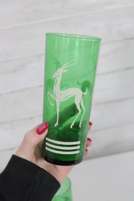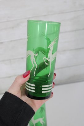 Each glass stands approximately 6.5 inches tall and has a classic highball shape with a slightly darker green base. The design includes a graceful gazelle figure paired with horizontal stripe accents near the bottom, giving these glasses a distinctly retro, modernist look.