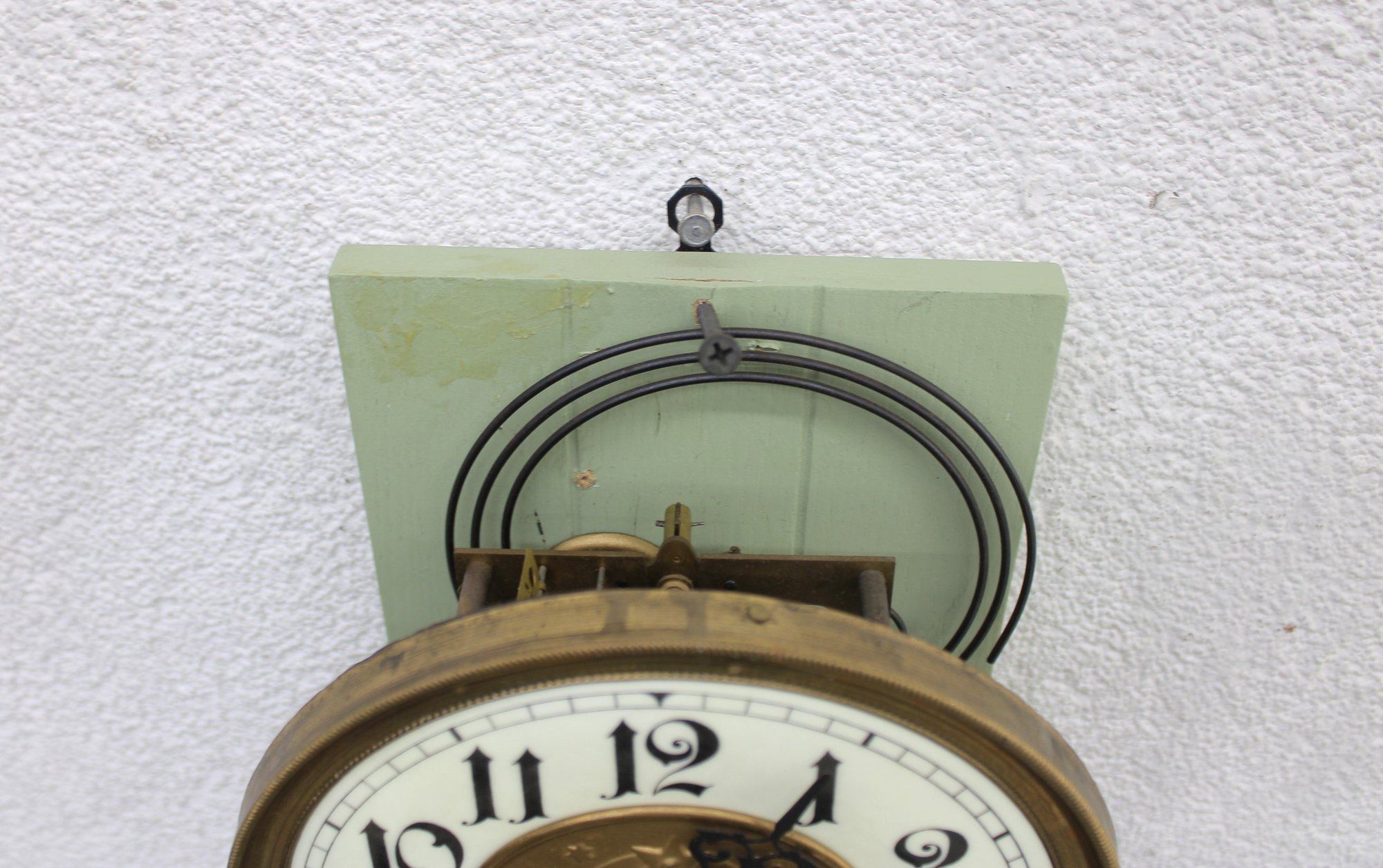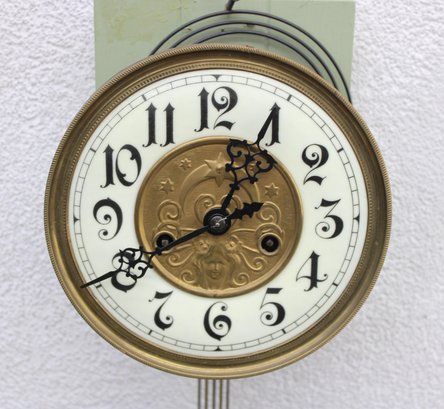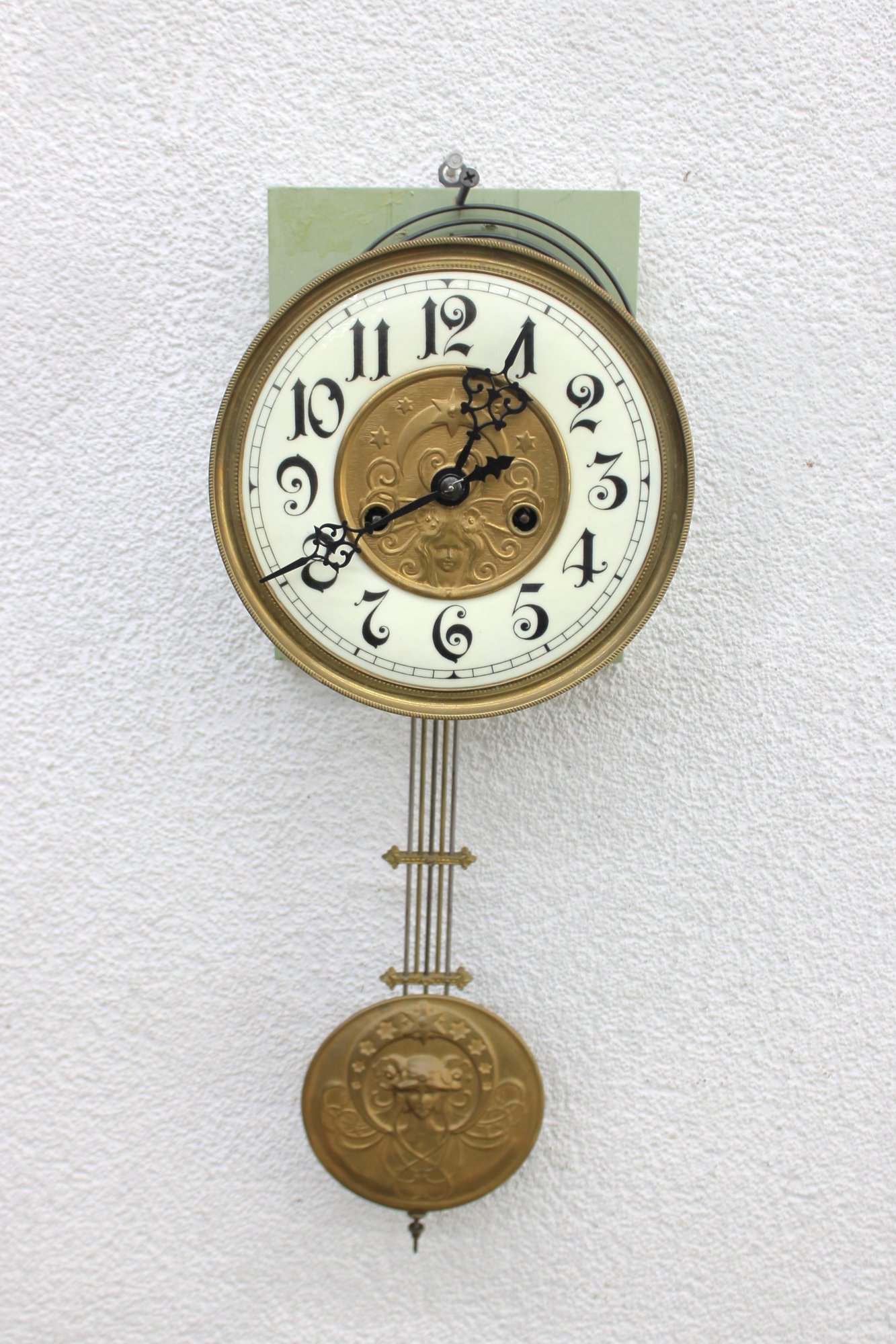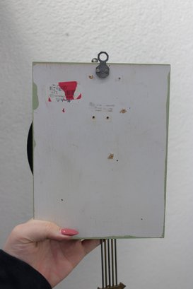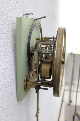 The clock is mounted on a rectangular backboard with an exposed mechanical movement visible from the side, adding to its antique charm and craftsmanship appeal. The hanging pendulum with embossed decoration enhances its classic aesthetic.