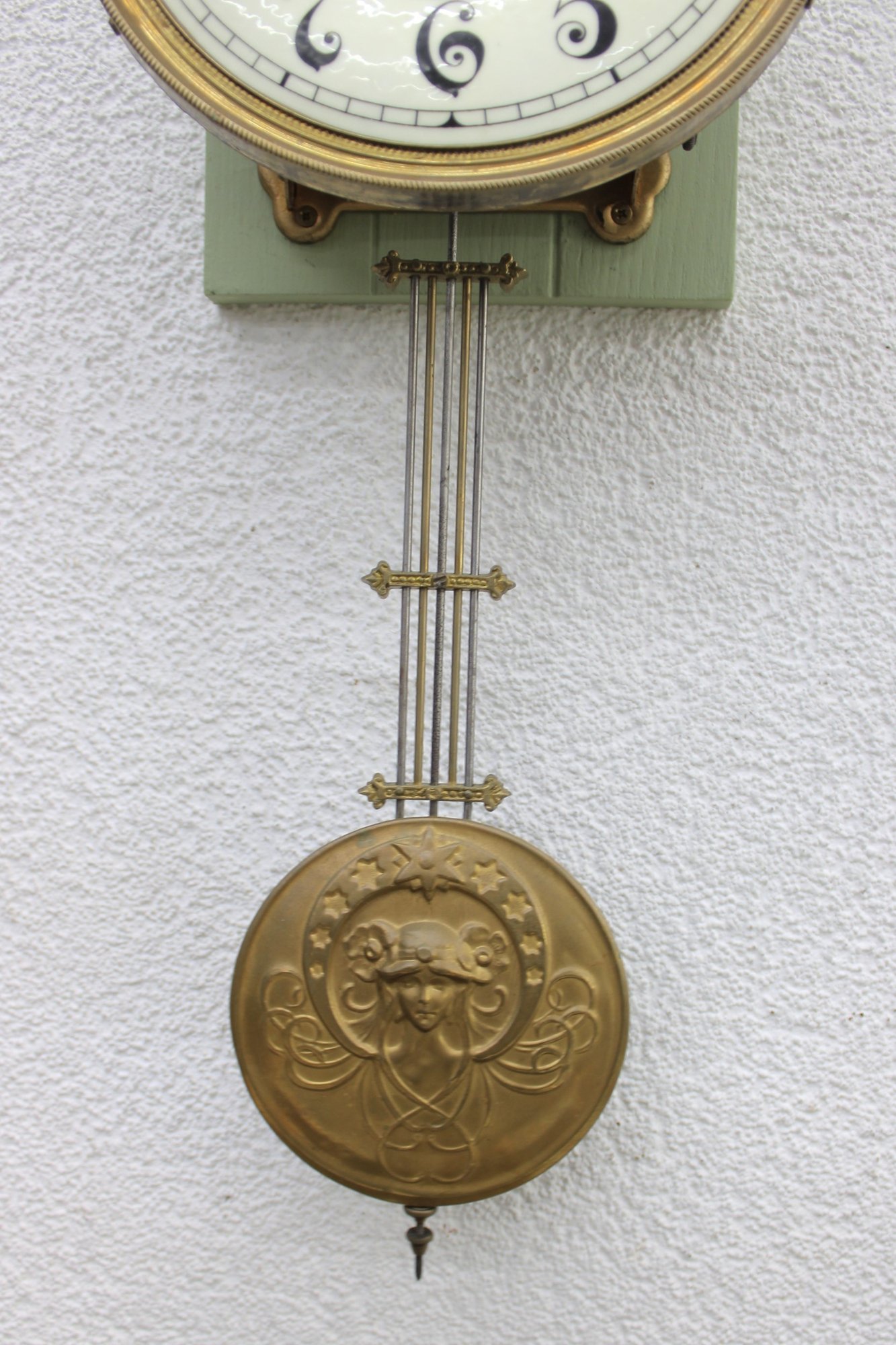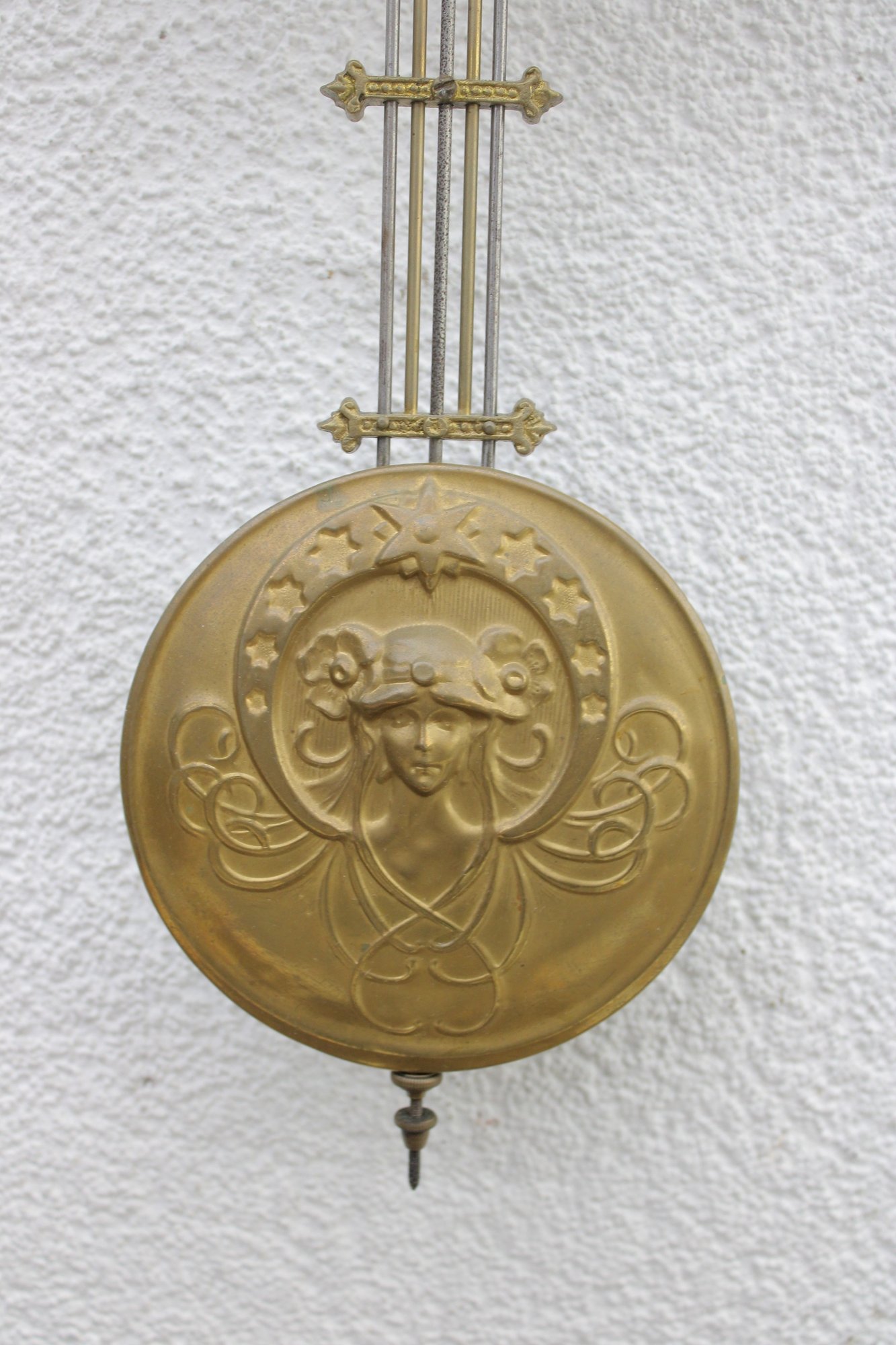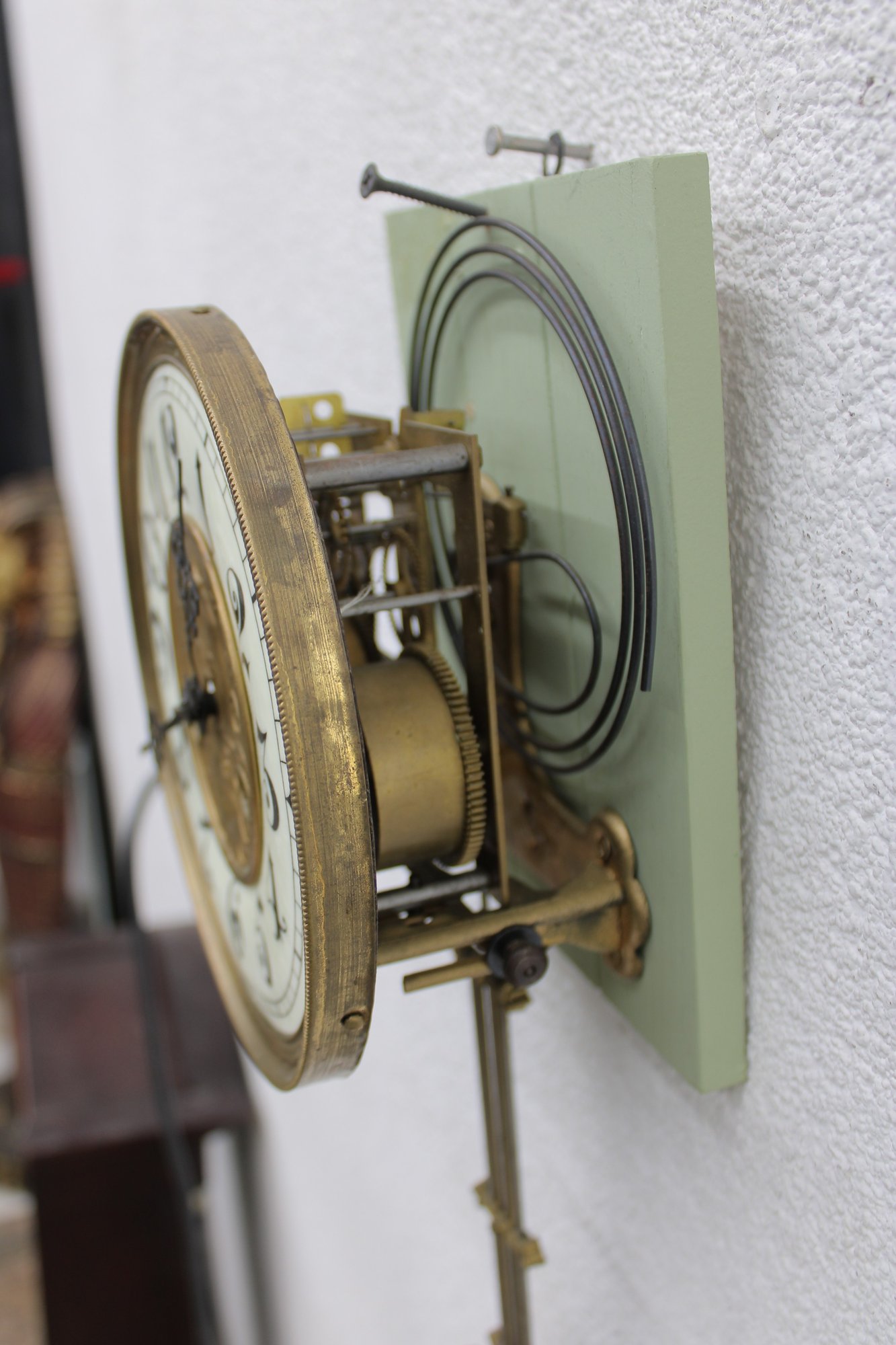 The clock is mounted on a rectangular backboard with an exposed mechanical movement visible from the side, adding to its antique charm and craftsmanship appeal. The hanging pendulum with embossed decoration enhances its classic aesthetic.