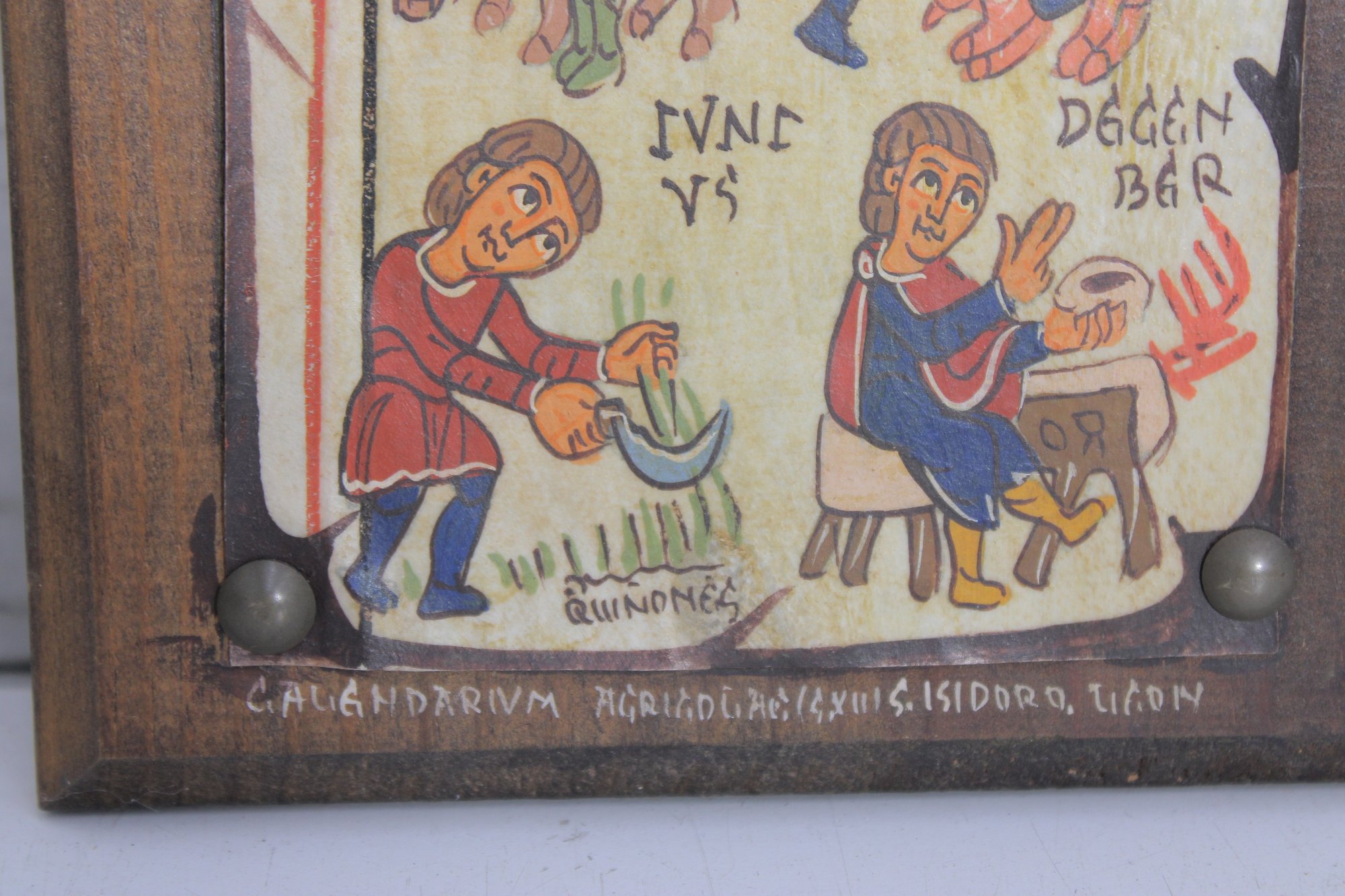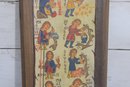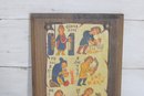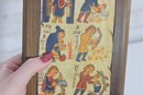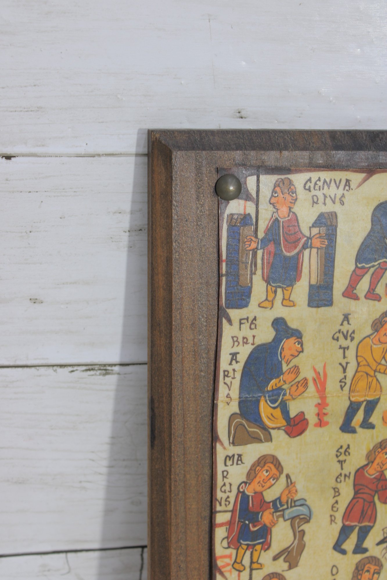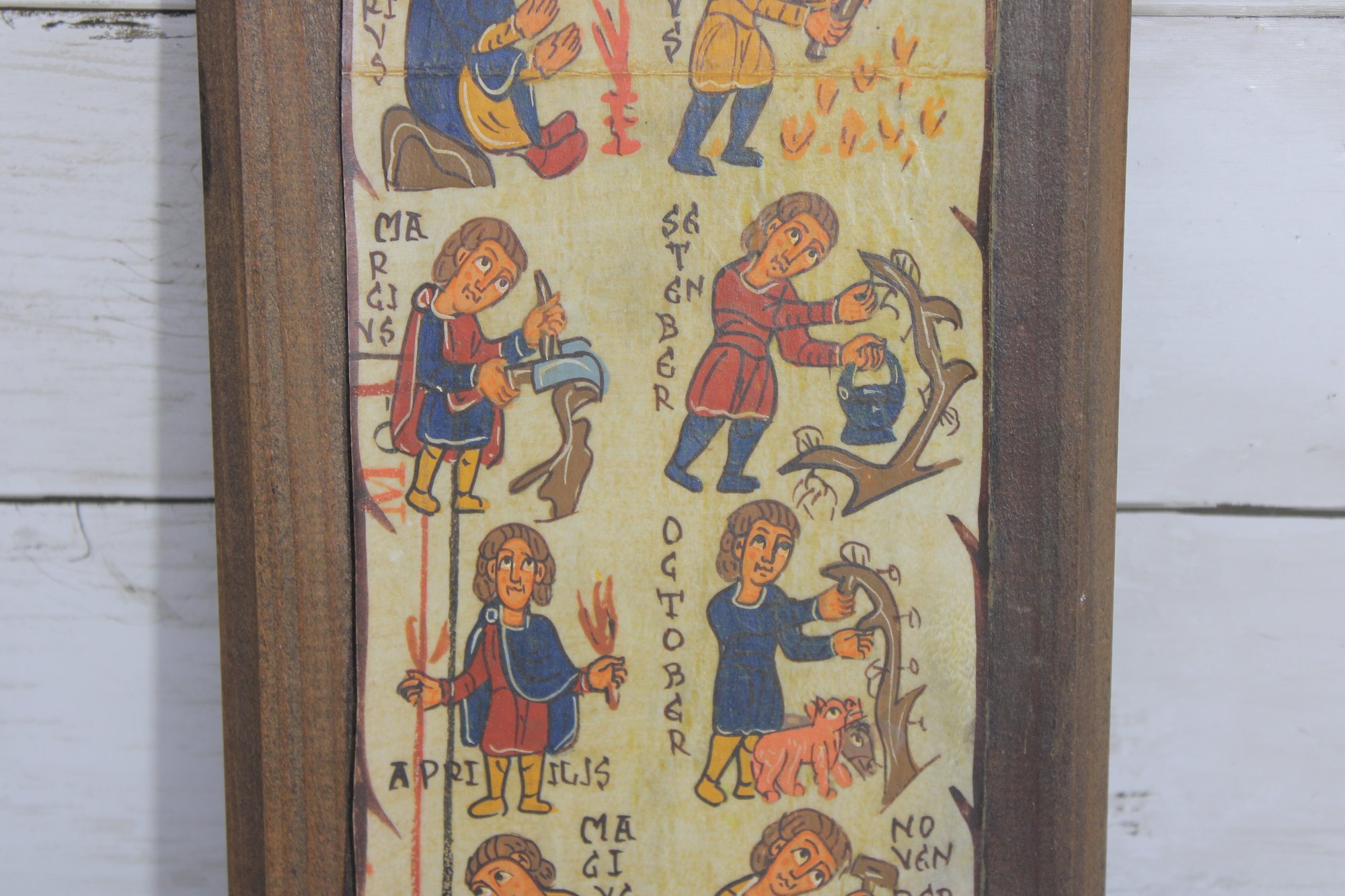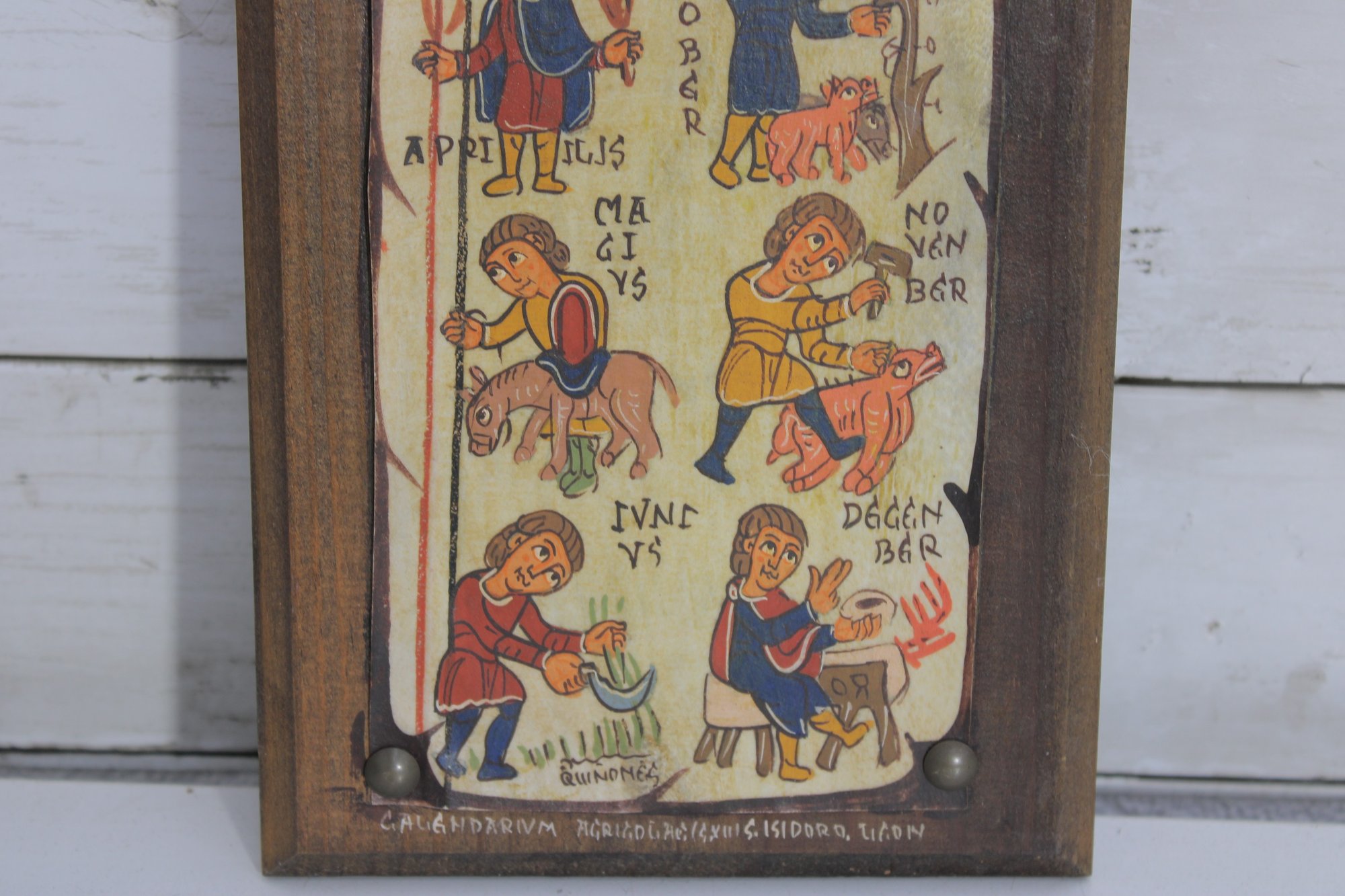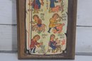 Charming vintage folk art–style plaque featuring colorful medieval-inspired illustrations arranged in a vertical calendar-like format. The piece shows small hand-drawn figures performing seasonal or daily tasks, accompanied by decorative lettering that gives it an old-world European manuscript aesthetic.