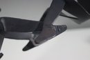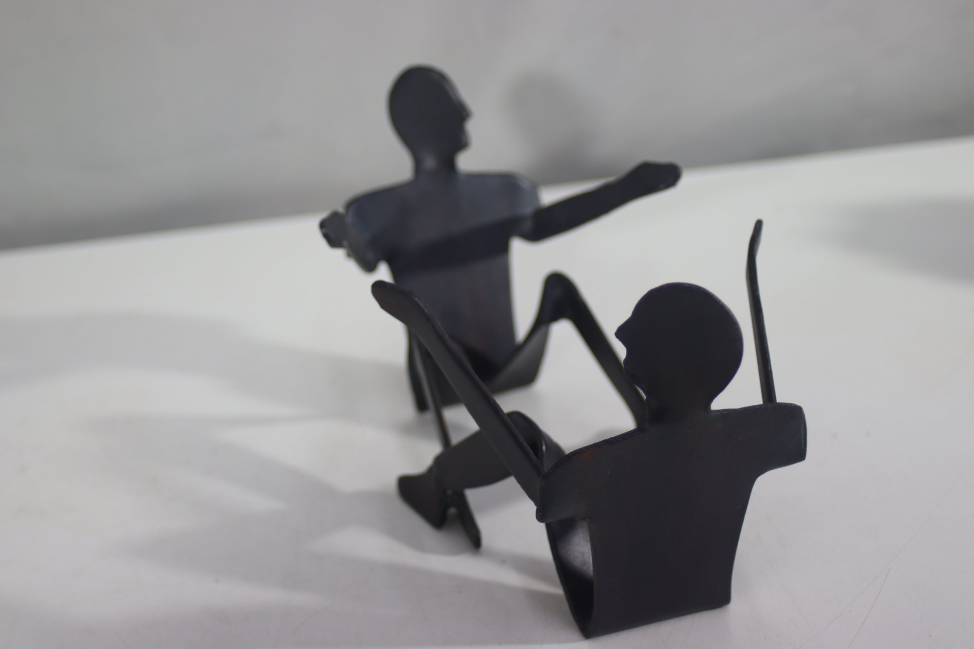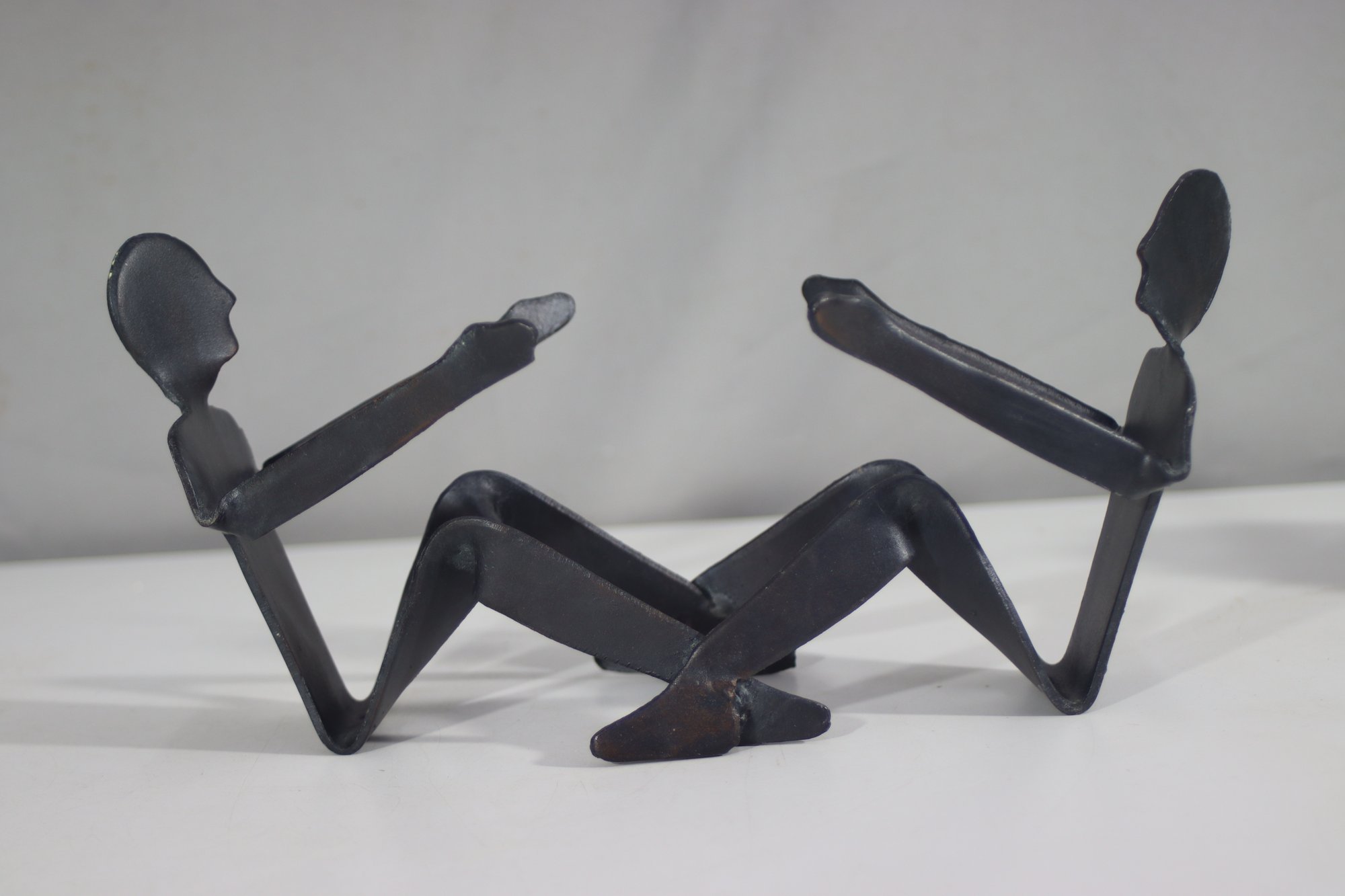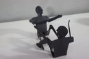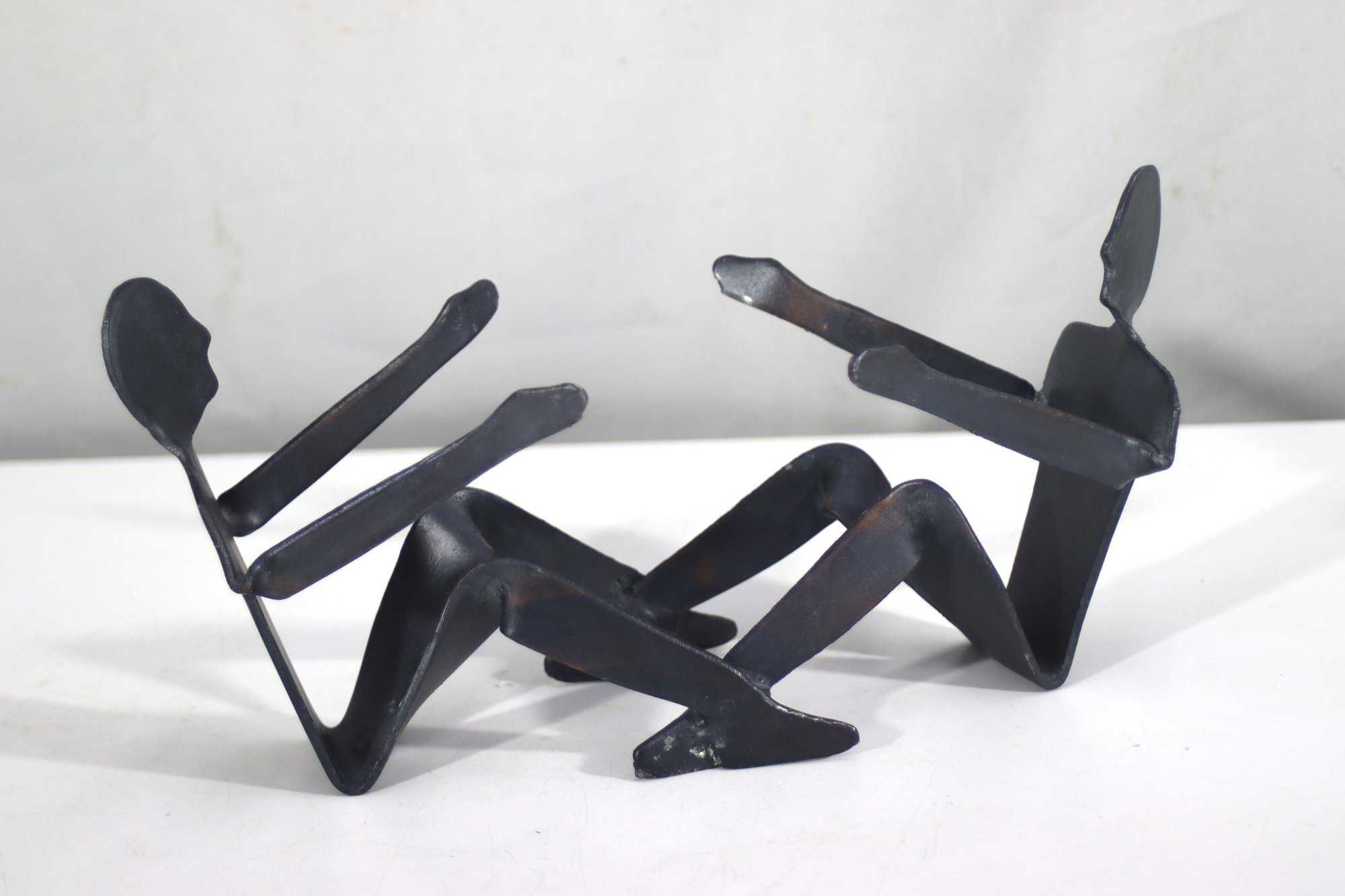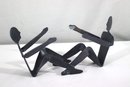 This unique vintage metal sculpture features two abstract human figures engaged in a dynamic pose, appearing to be in motion. Crafted from solid metal with a dark, aged patina, this artistic piece exhibits a minimalist yet expressive design. The figures have a fluid, modernist style with simple, elongated limbs and silhouetted faces. Perfect as a conversation starter or a bold accent piece, this sculpture would complement an industrial, modern, or minimalist decor. Ideal for collectors of vintage metal art and handmade sculptures.