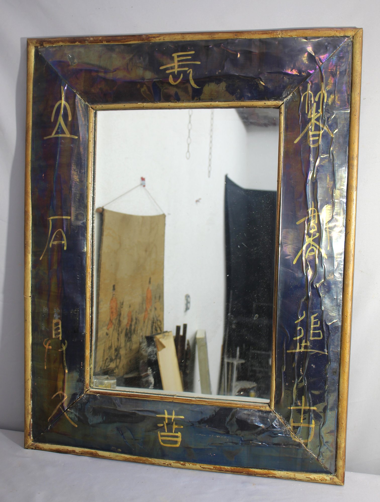 The frame exhibits a striking iridescent finish that plays with light, adding depth and intrigue. Each character is meticulously crafted, adding a cultural and artistic flair that enhances its aesthetic value.