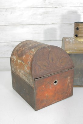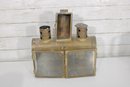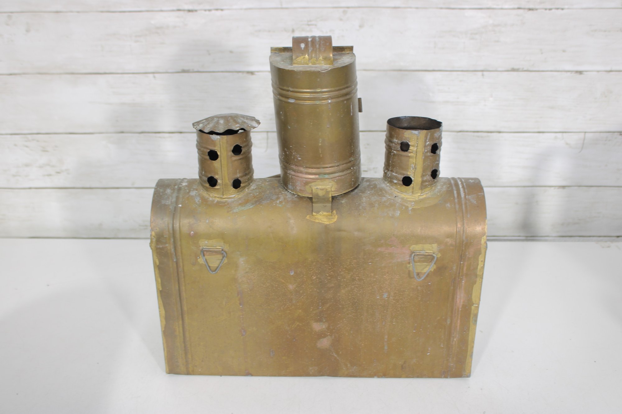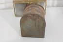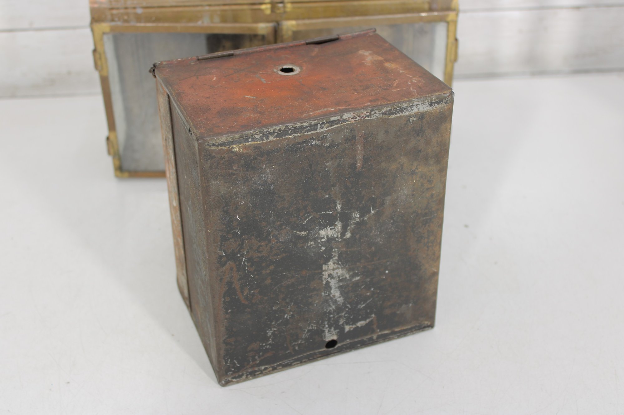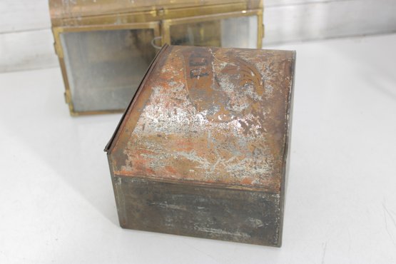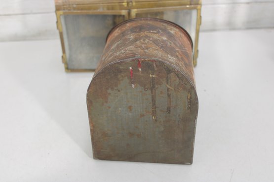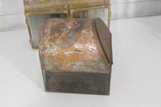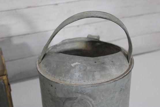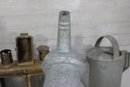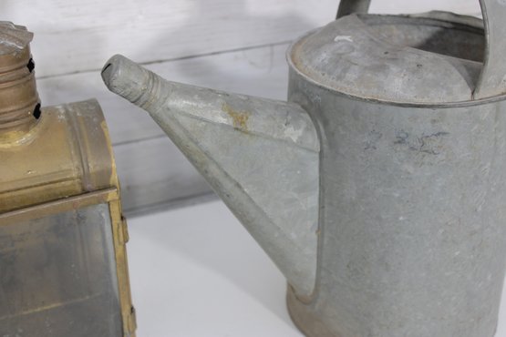 vintage group lot featuring a mix of rustic metal décor and garden-themed pieces. This assortment includes two galvanized watering cans in different sizes, a brass-tone double burner lantern with glass panels, and a weathered metal tin box. Each item showcases aged character and patina, making the lot perfect for farmhouse décor, garden displays, or rustic vintage collections.