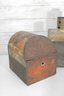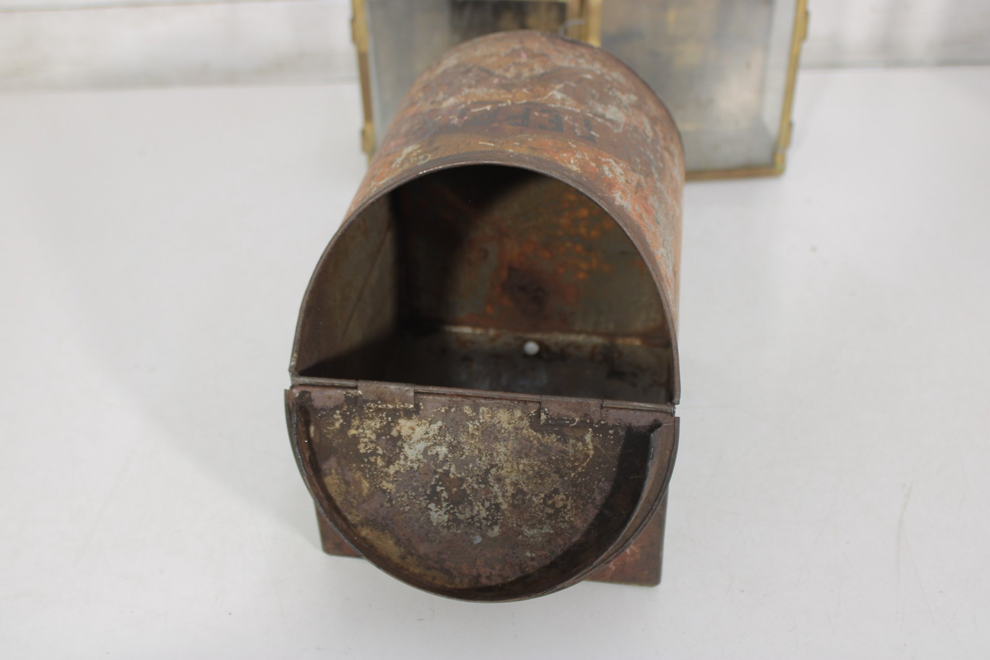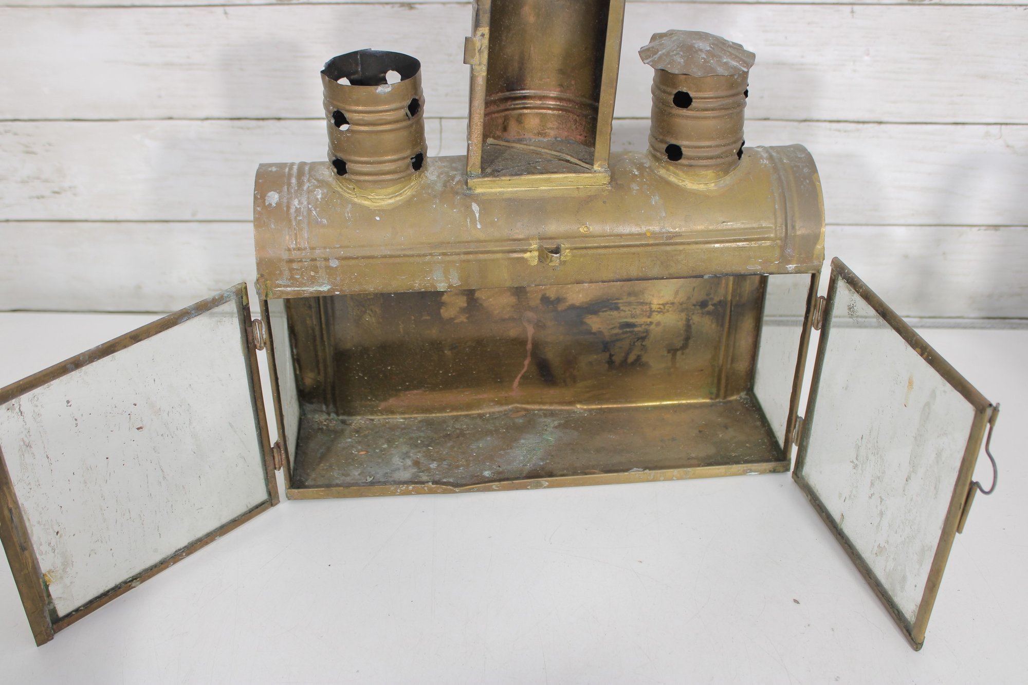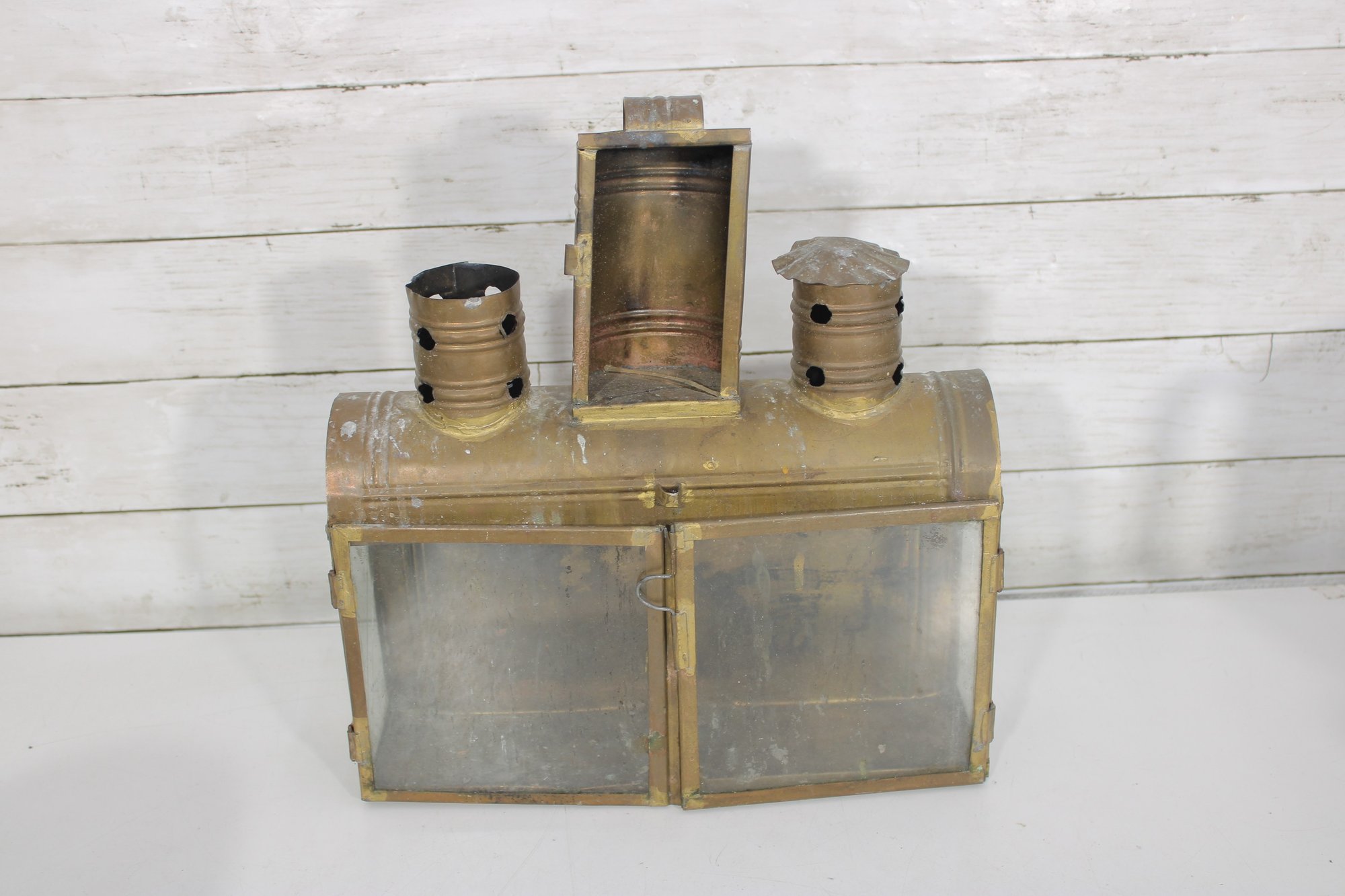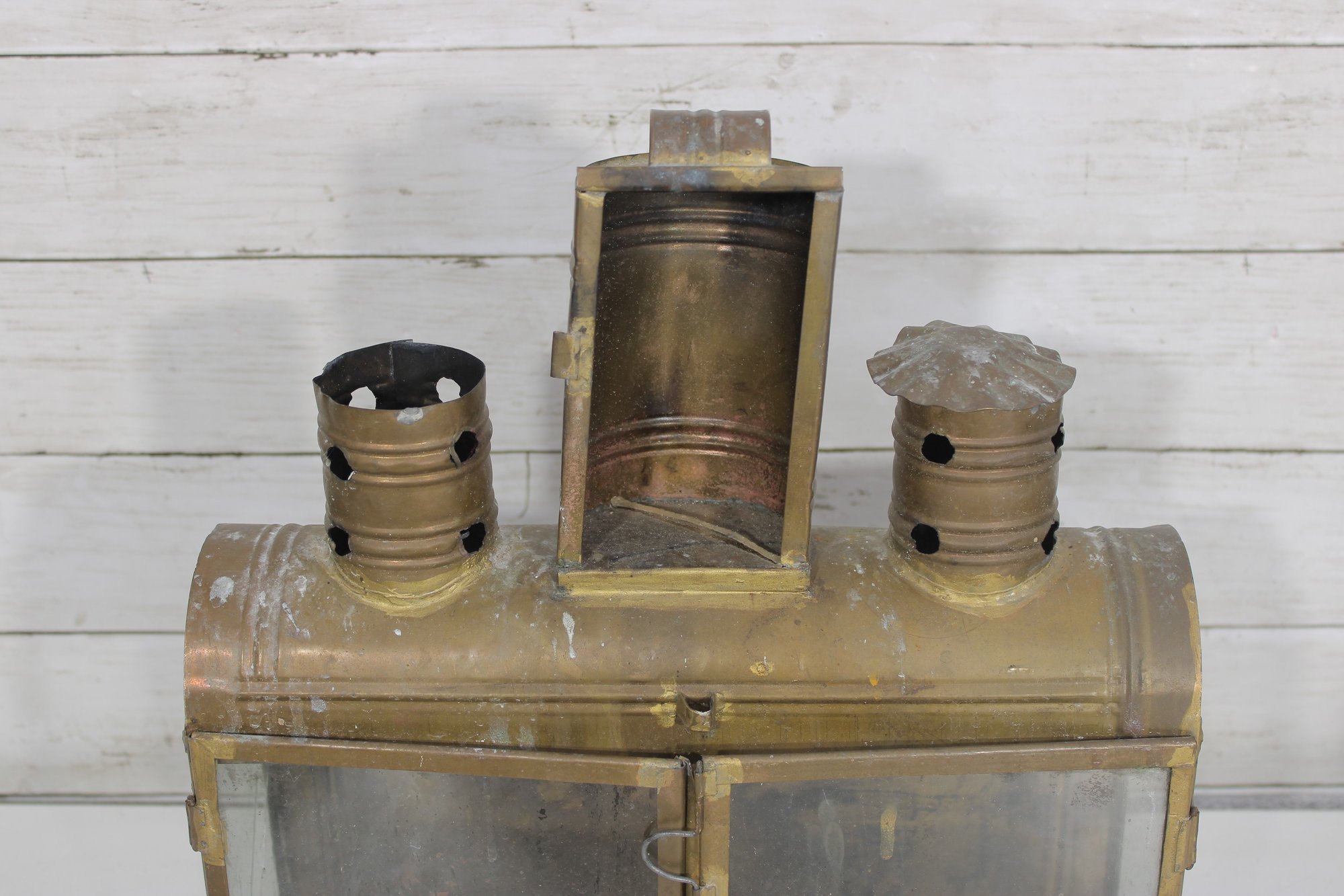 vintage group lot featuring a mix of rustic metal décor and garden-themed pieces. This assortment includes two galvanized watering cans in different sizes, a brass-tone double burner lantern with glass panels, and a weathered metal tin box. Each item showcases aged character and patina, making the lot perfect for farmhouse décor, garden displays, or rustic vintage collections.
