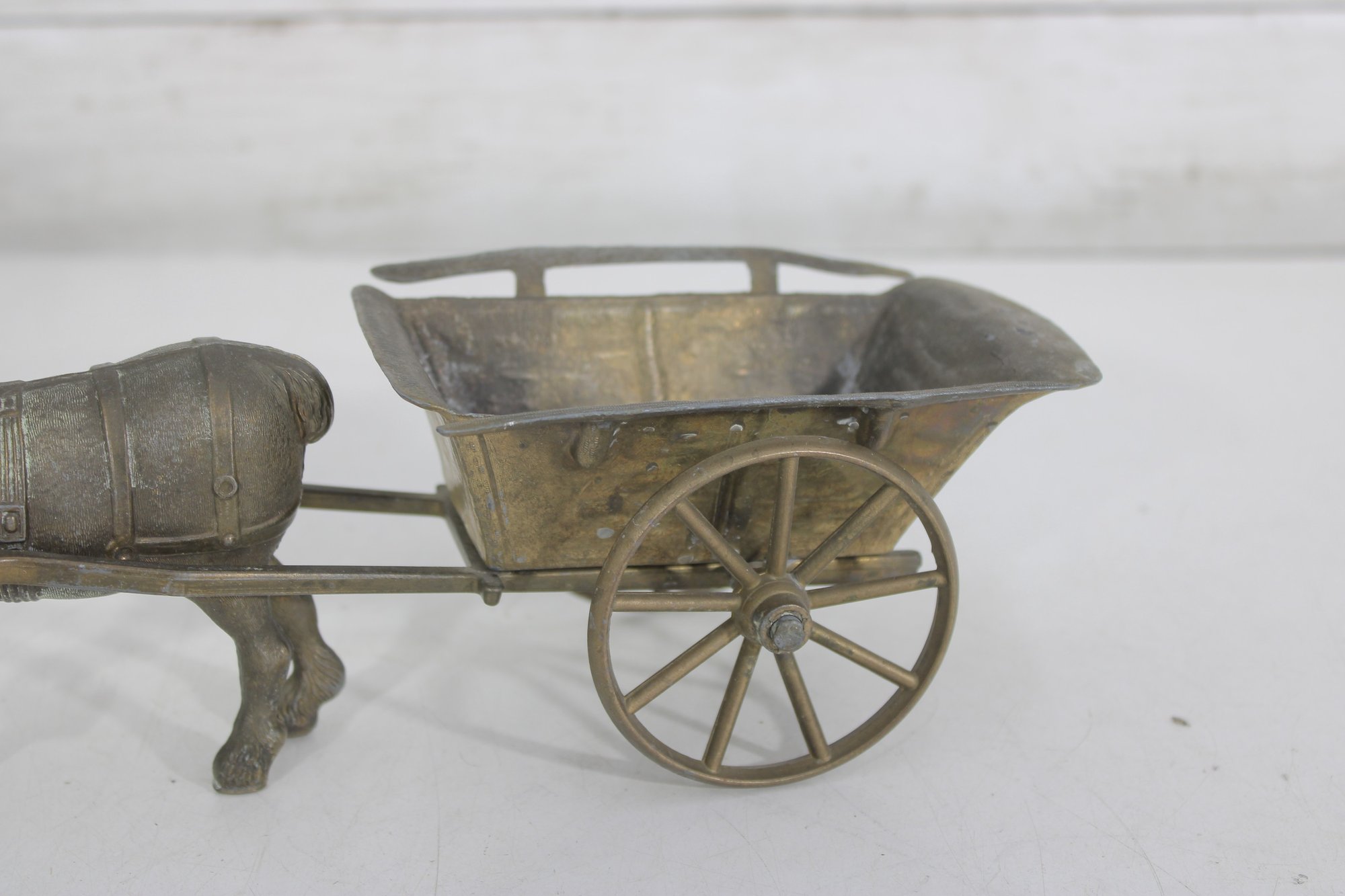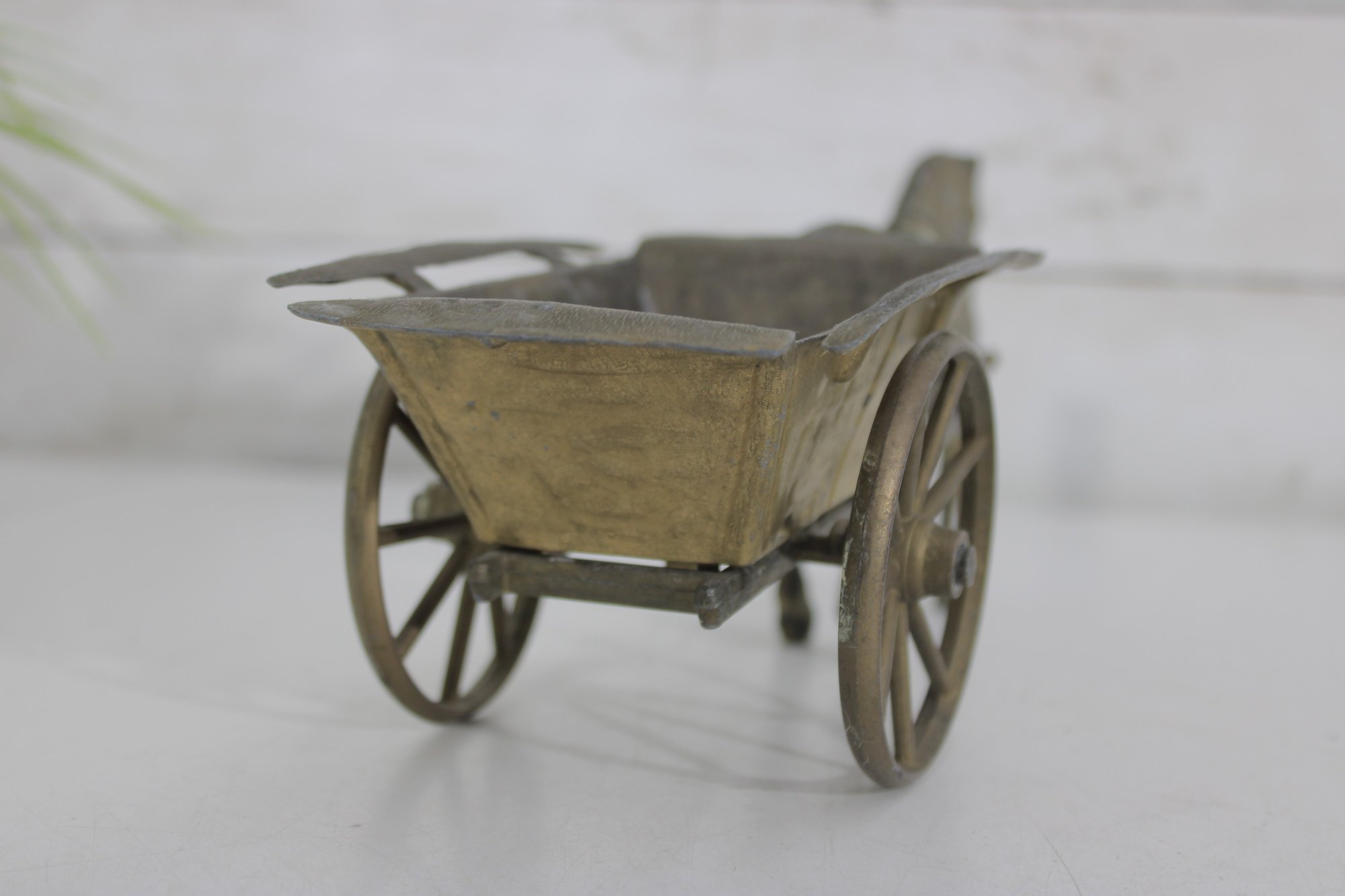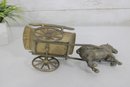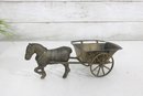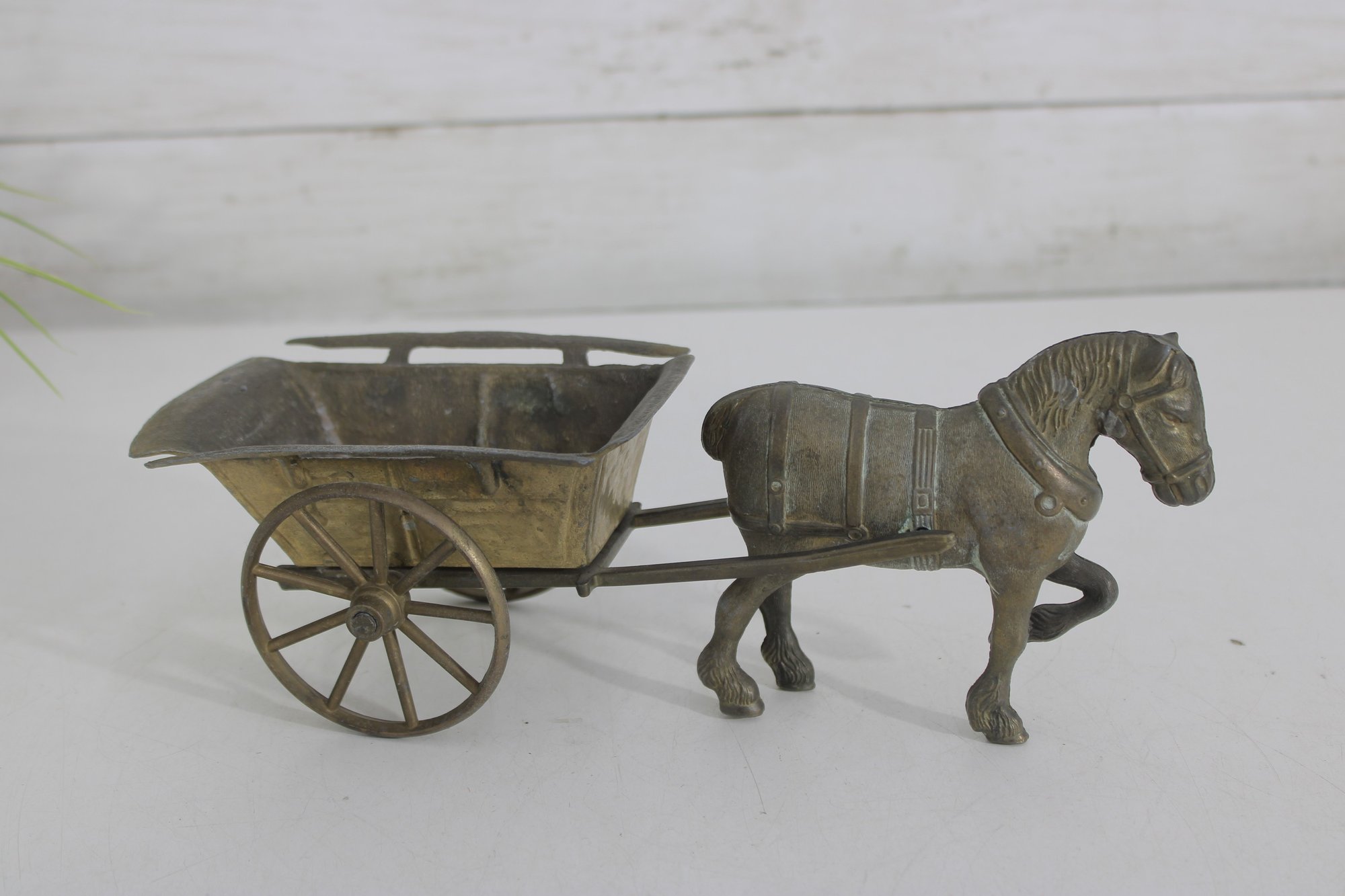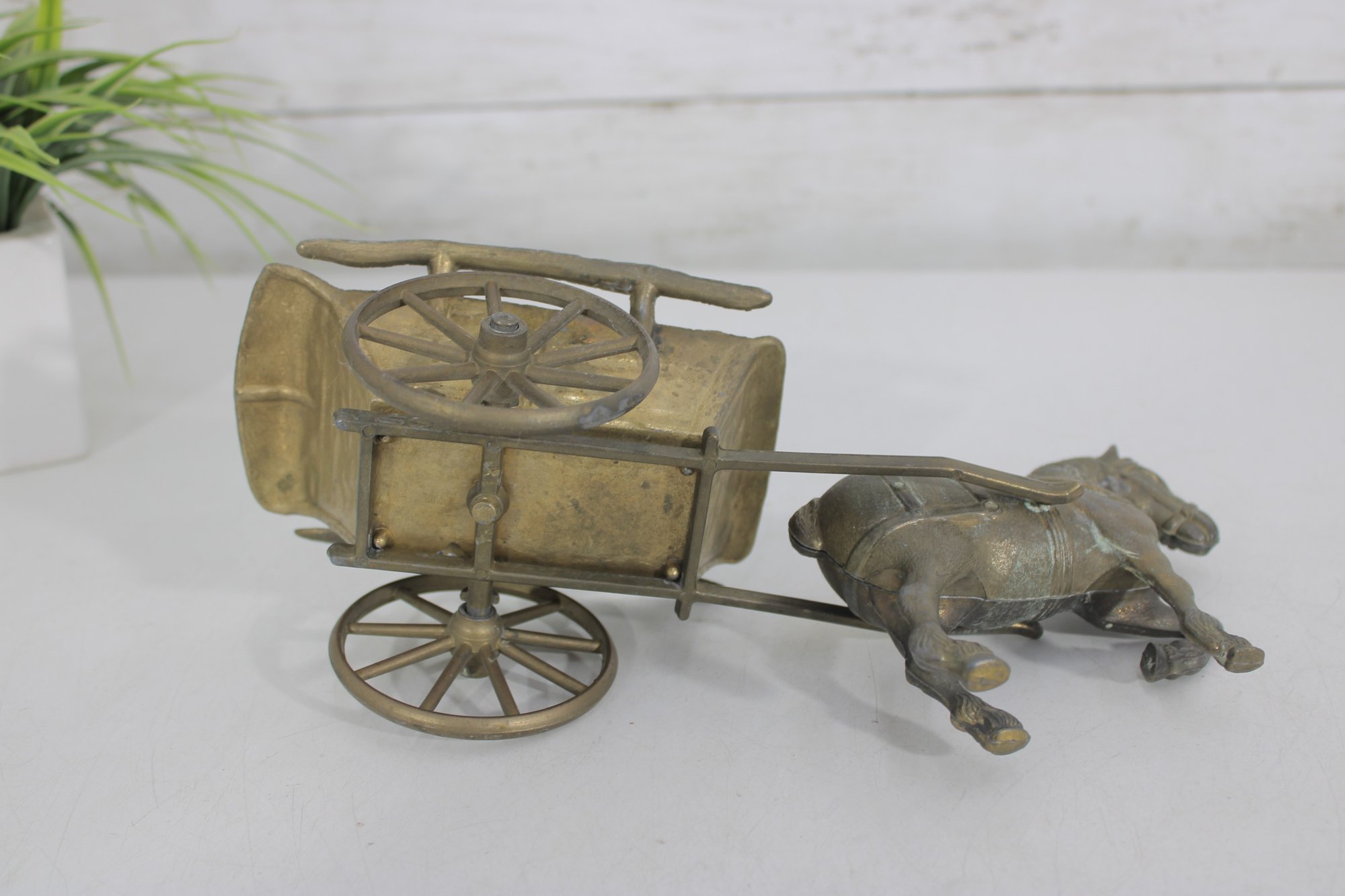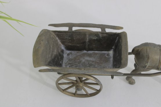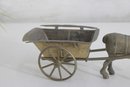The carriage has an open cart design with spoke wheels and a curved front, giving it a classic rustic farm or countryside look. The horse is nicely detailed with harness and saddle accents. The piece has a warm aged patina with a brass/bronze tone finish, adding to its vintage charm.