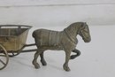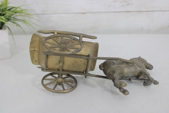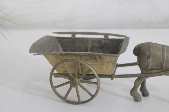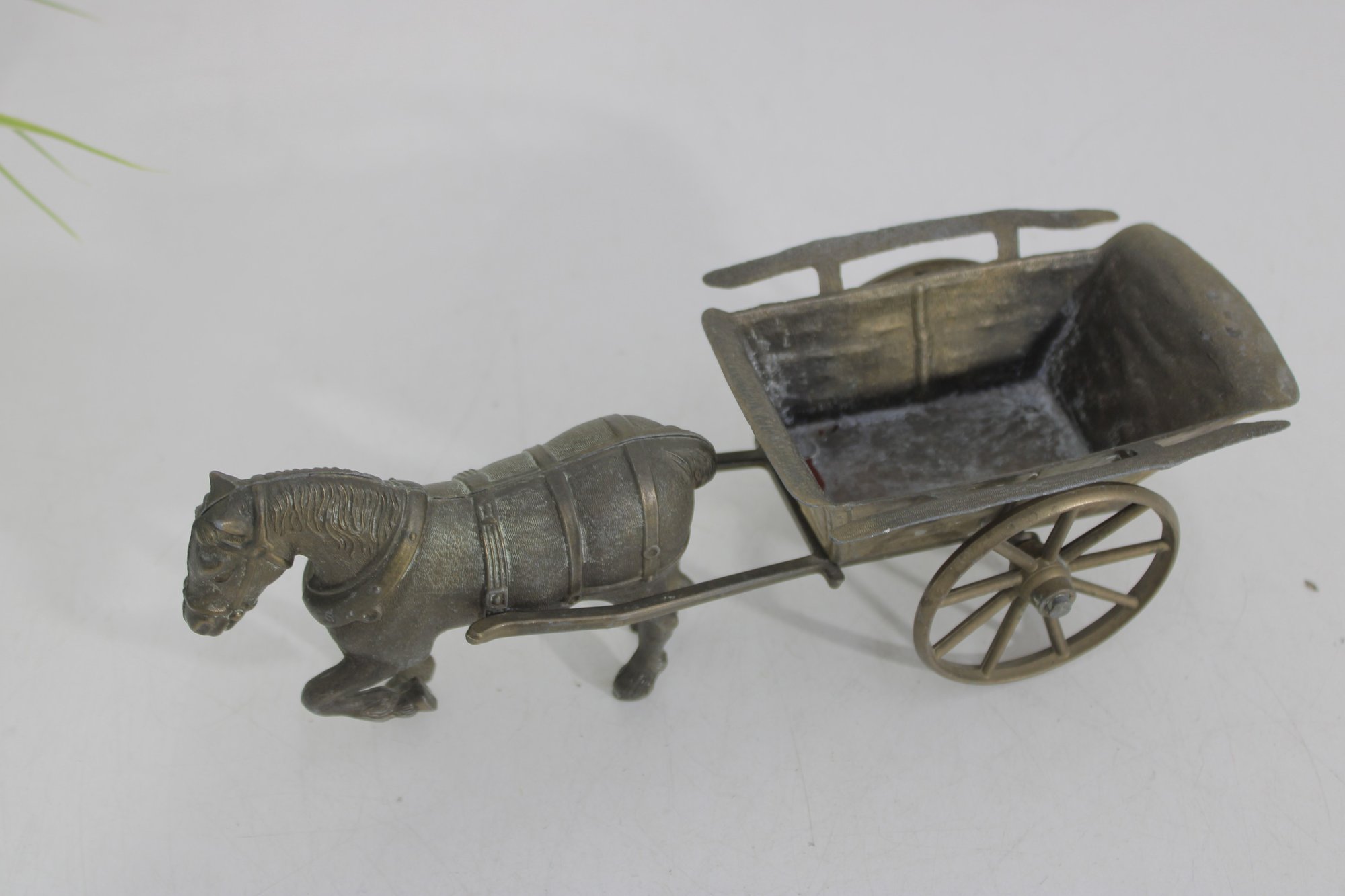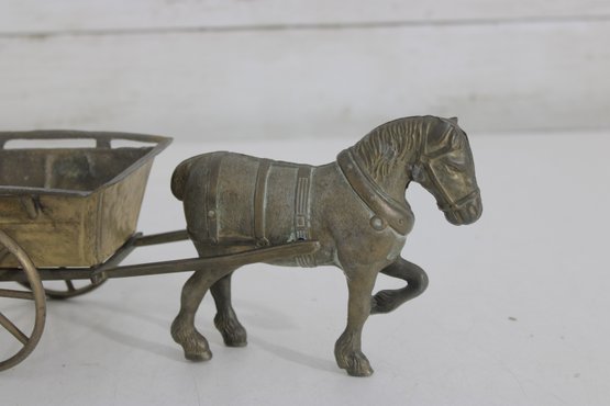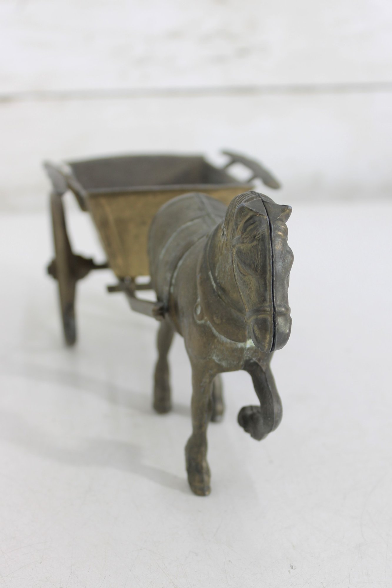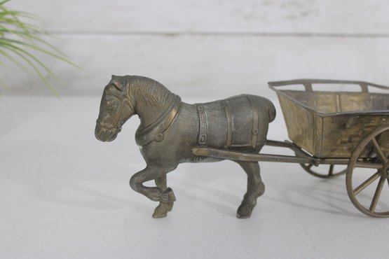 vintage metal horse and cart figurine featuring a detailed horse pulling a two-wheeled carriage. This decorative piece measures approximately 4.5 inches high and 11 inches long.