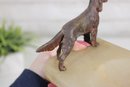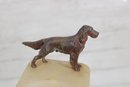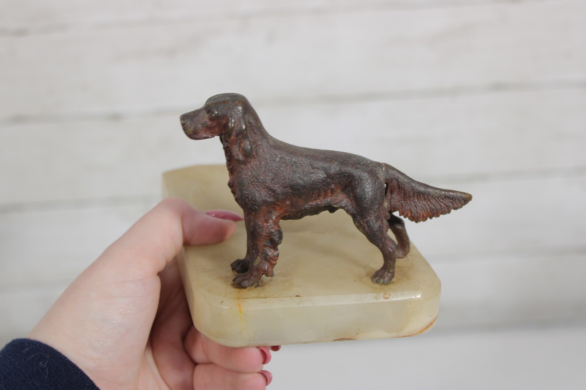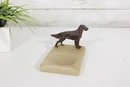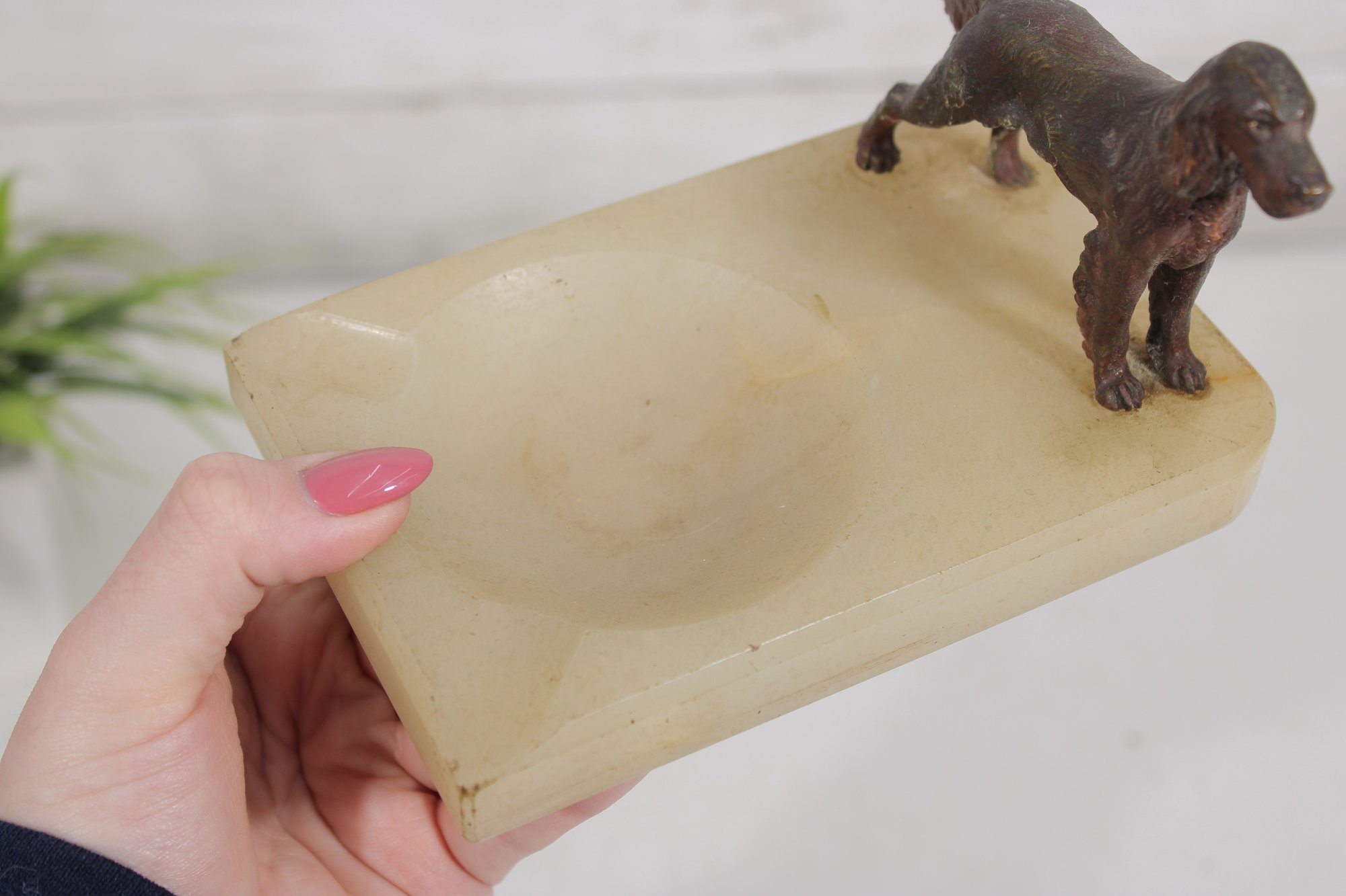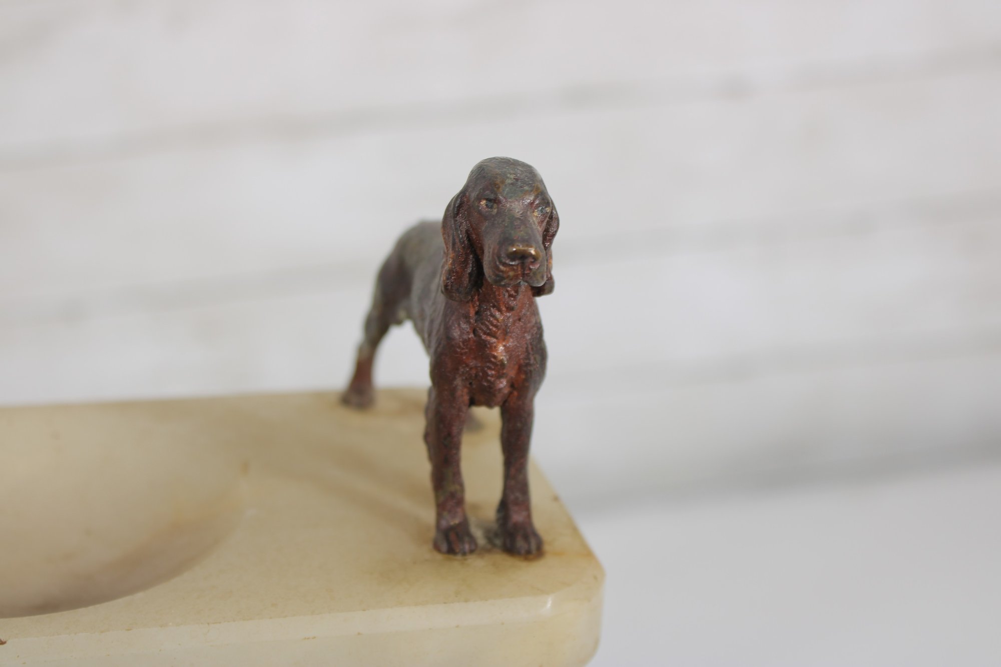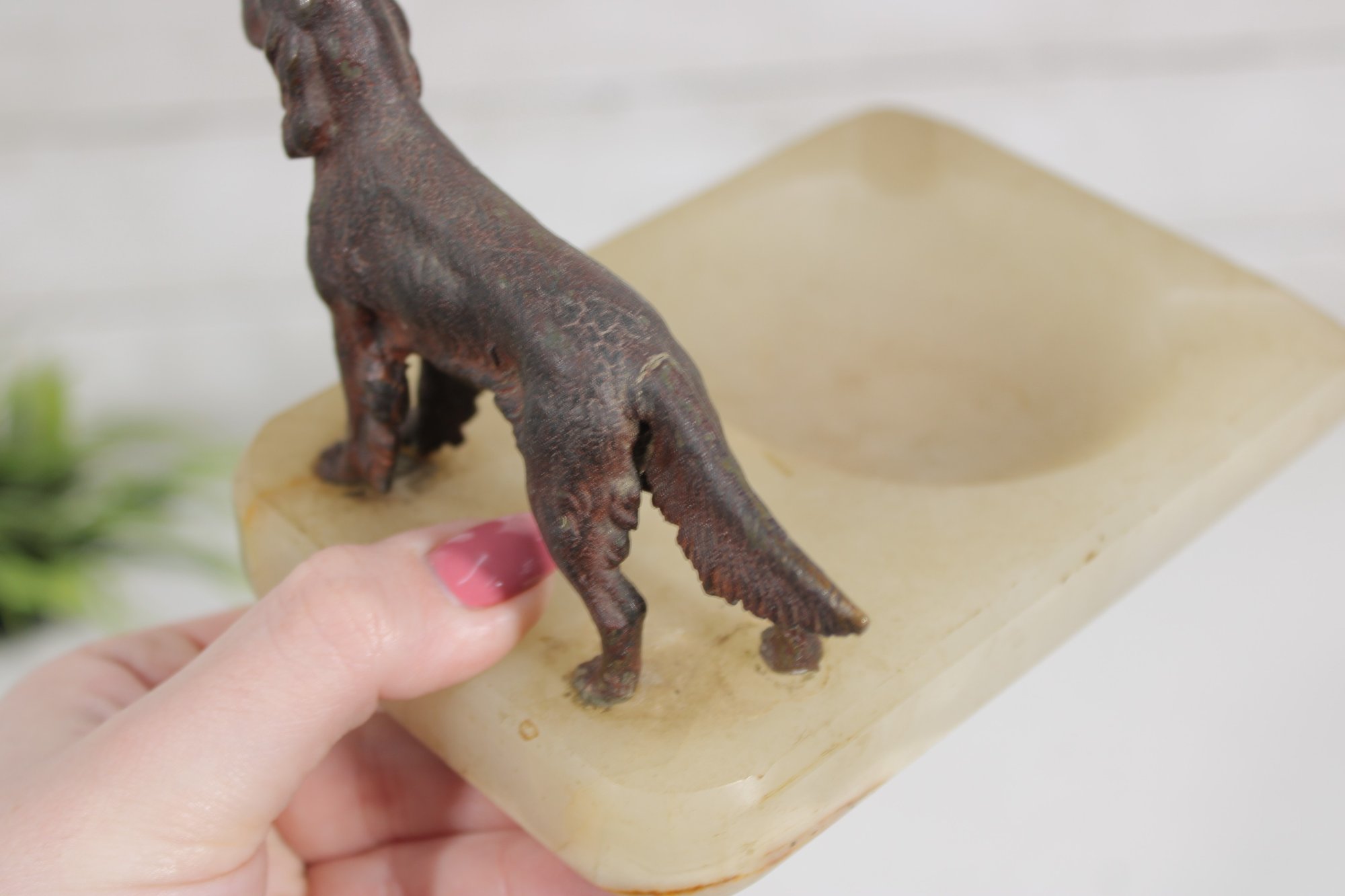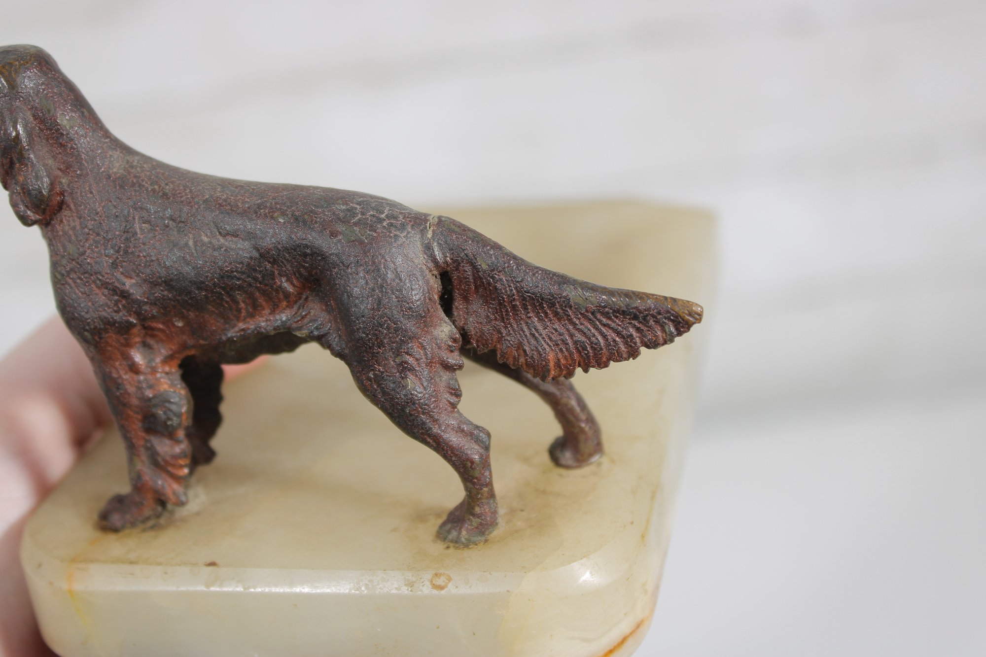 Vintage figural ashtray featuring a beautifully detailed hunting dog (setter or spaniel) figure mounted on a rectangular stone or alabaster base. The dog is cast in metal with a rich patina, showing fine detailing in the fur, stance, and facial features. The base includes a recessed ashtray bowl, making this both a decorative and functional piece.