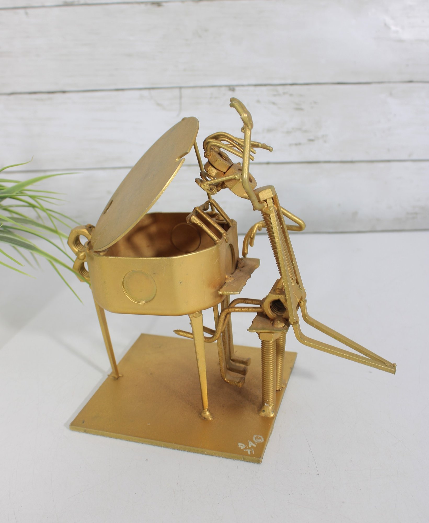 Unique vintage metal sculpture featuring a stylized musician seated at a piano, creatively crafted from welded tools and hardware parts. This handcrafted piece showcases imaginative design, with nuts, bolts, and metal components forming the figure and instrument details.